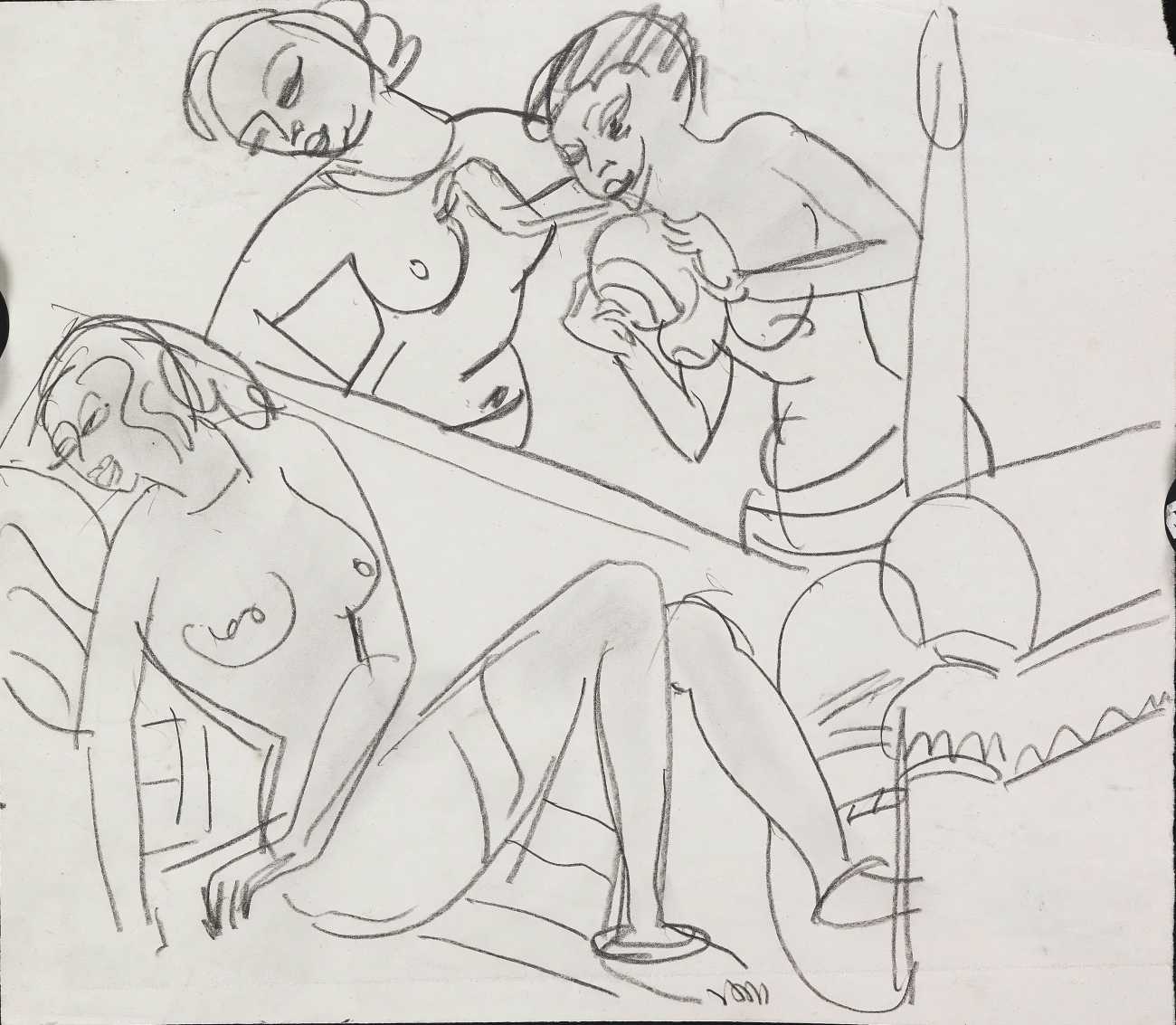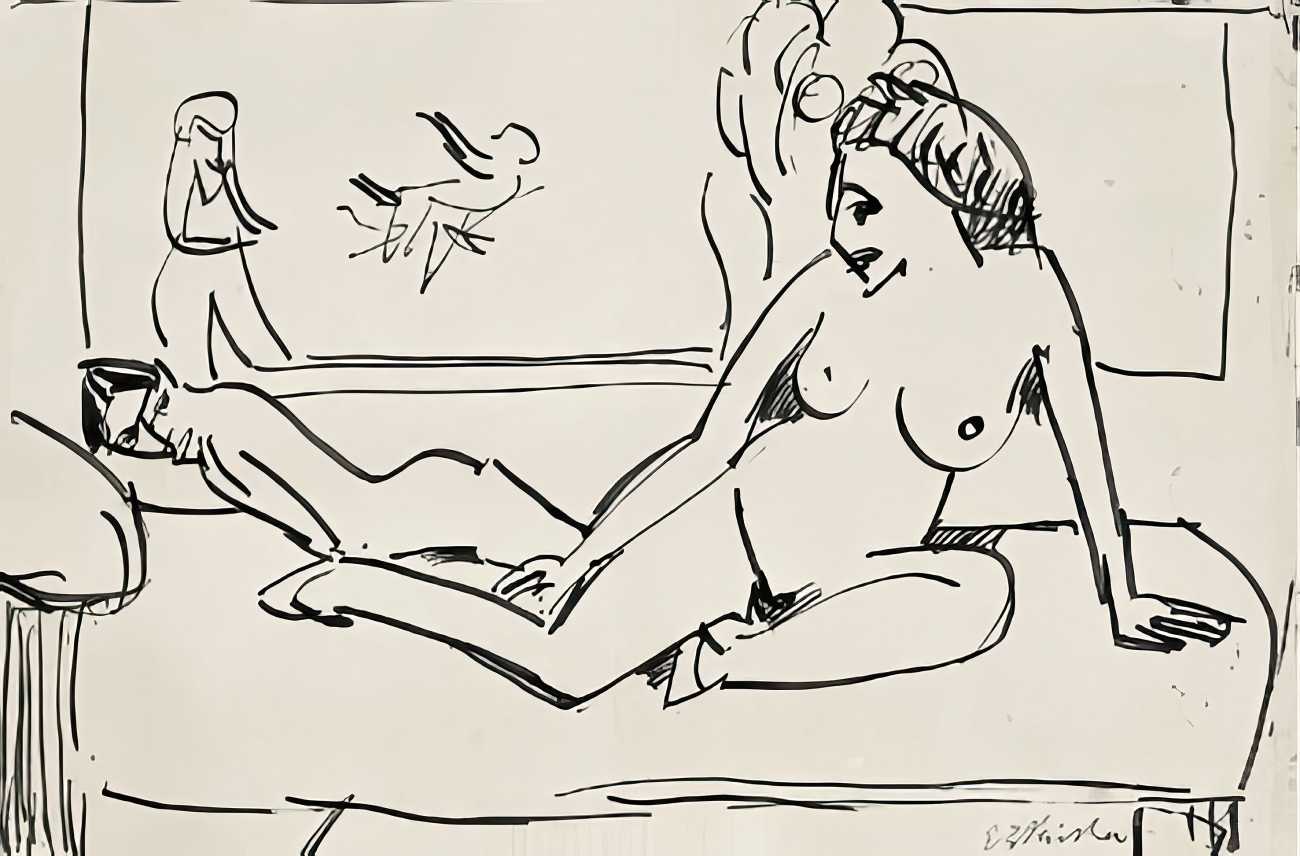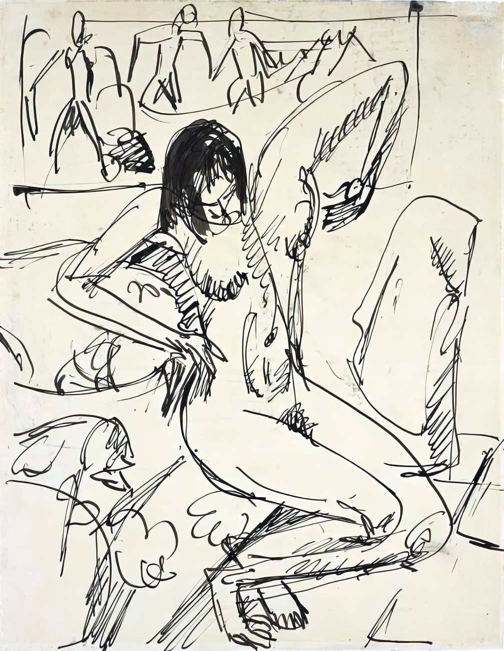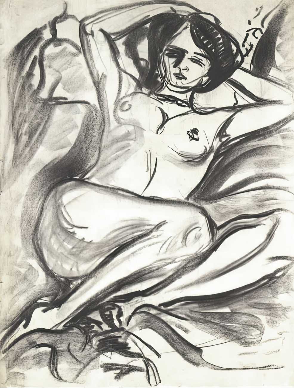 In Kirchner’s drawings the erotic appears with a directness and immediacy distinct from the more theatrically charged sensuality of his paintings. Working quickly with charcoal, ink or pencil, Kirchner used drawing as a laboratory for exploring bodily presence stripped of narrative context or painterly drama. The line became the primary expressive agent, recording desire as a kinetic impulse rather than as a composed scene. His naked subjects often seem caught in a moment of transition – stretching, reclining, dressing, bathing – captured with an economy of line suggesting spontaneity and intimacy.