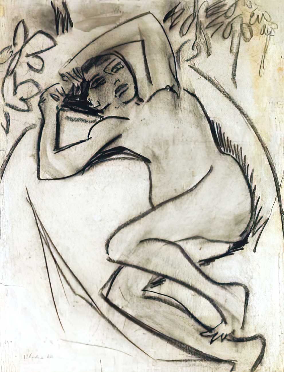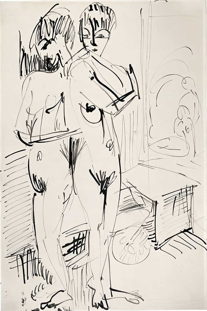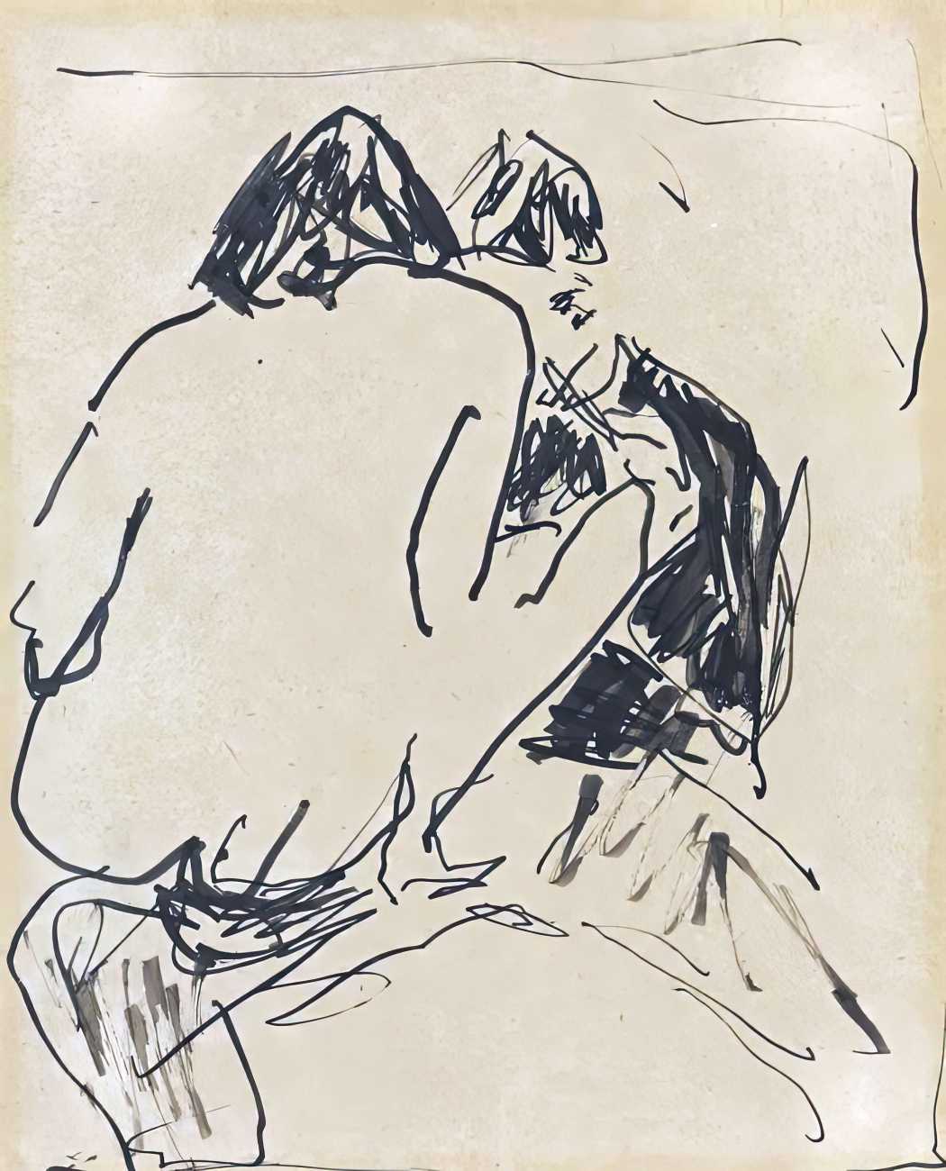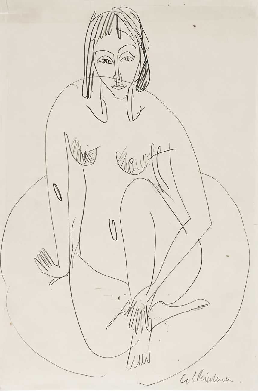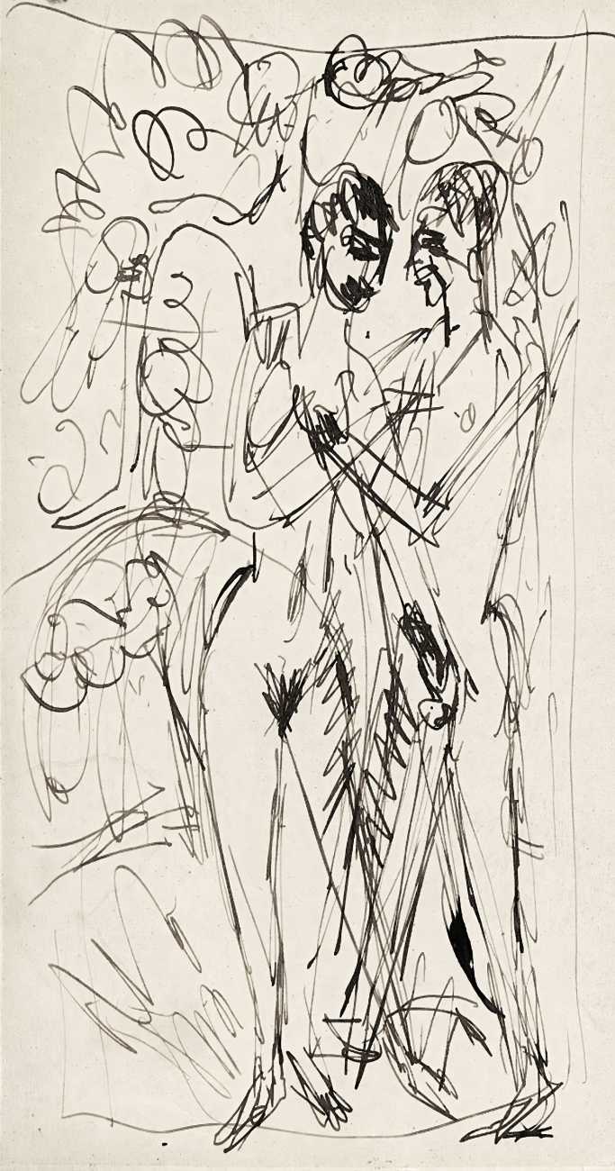 In Kirchner’s drawings the erotic appears with a directness and immediacy distinct from the more theatrically charged sensuality of his paintings. Working quickly with charcoal, ink or pencil, Kirchner used drawing as a laboratory for exploring bodily presence stripped of narrative context or painterly drama. The line became the primary expressive agent, recording desire as a kinetic impulse rather than as a composed scene. His naked subjects often seem caught in a moment of transition – stretching, reclining, dressing, bathing – captured with an economy of line suggesting spontaneity and intimacy.