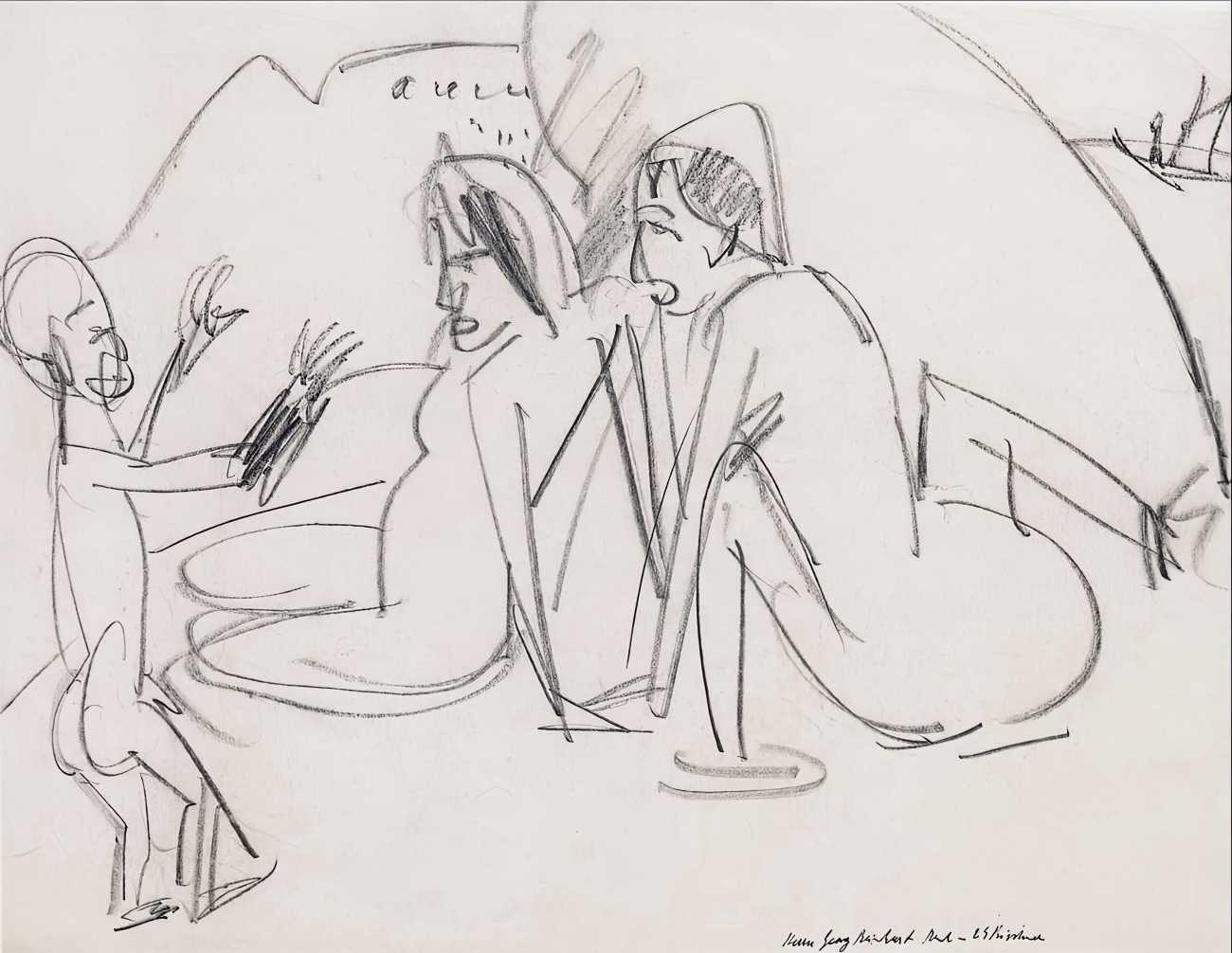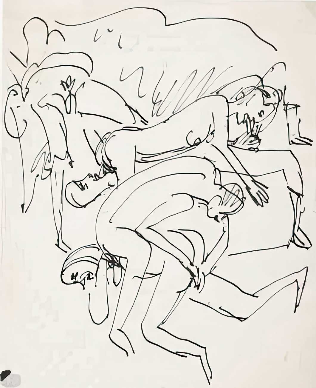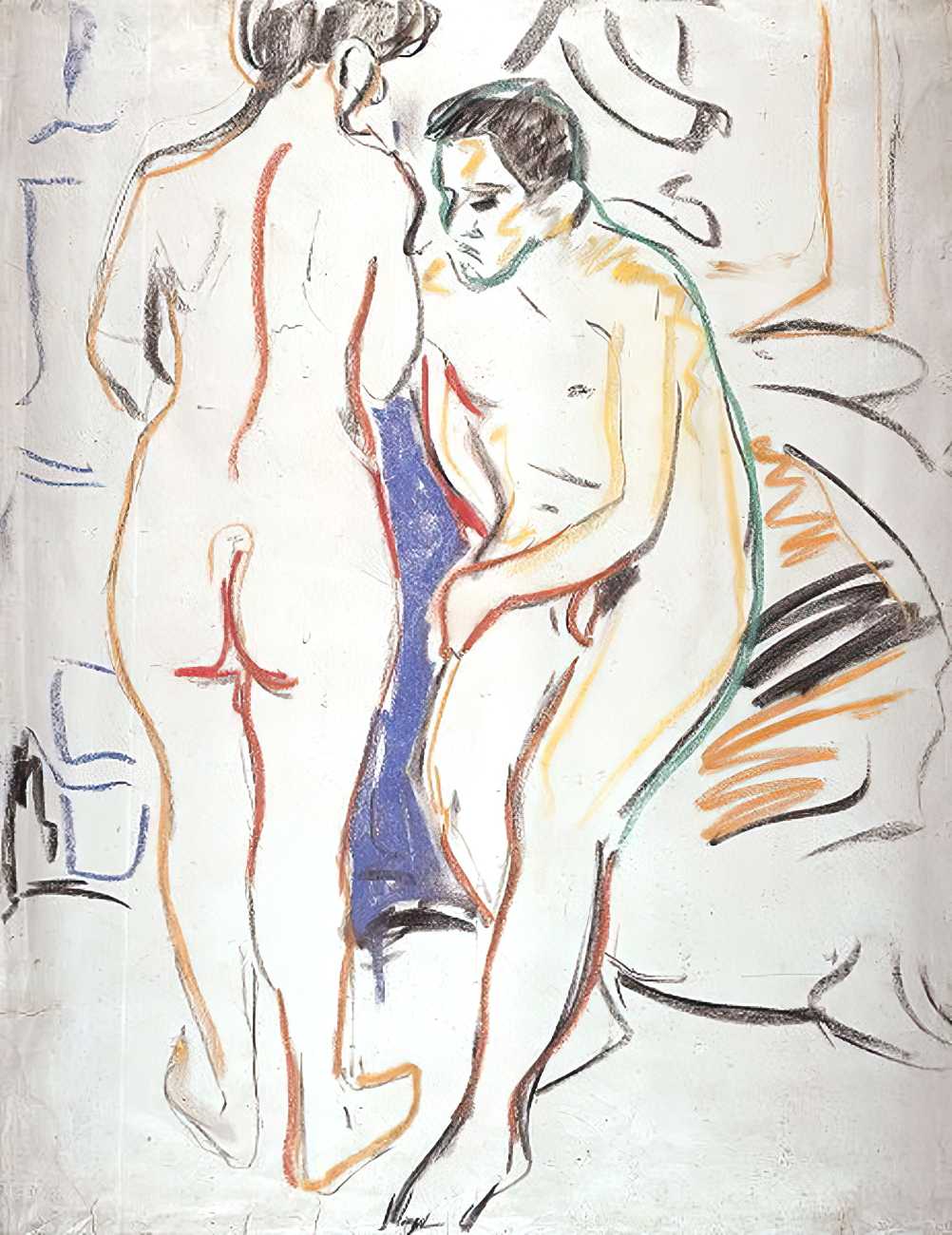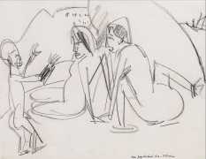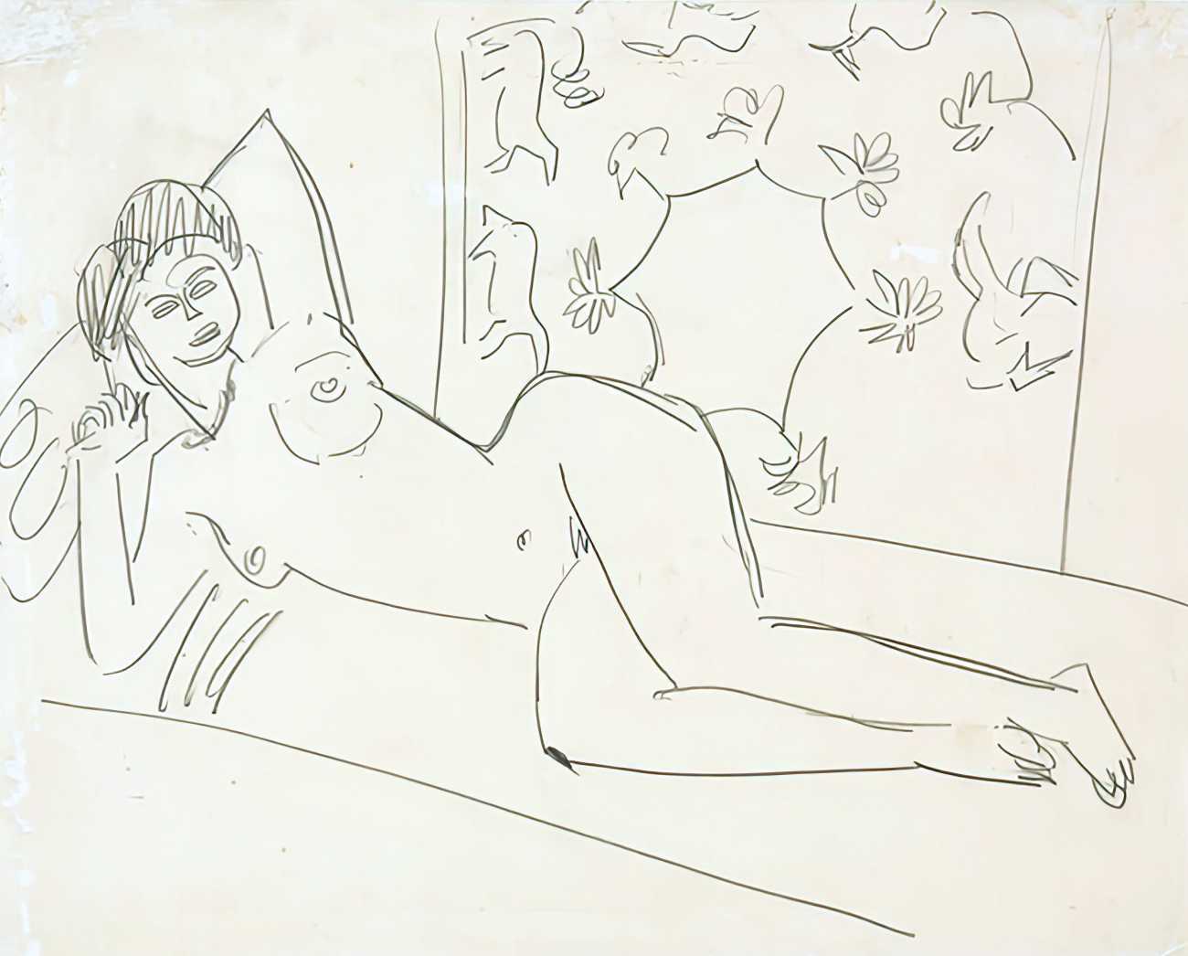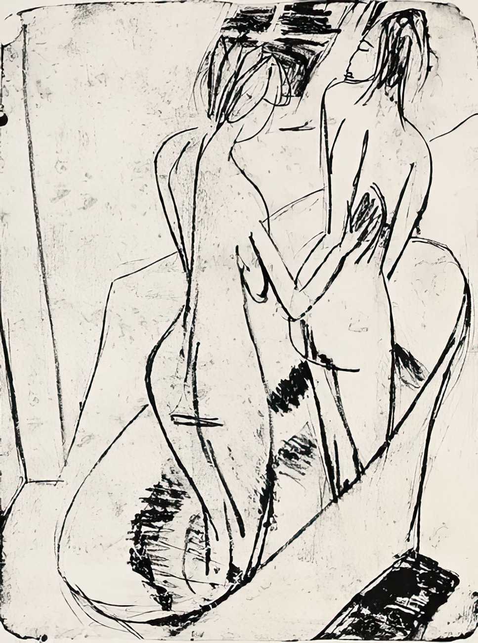 In Kirchner’s drawings the erotic appears with a directness and immediacy distinct from the more theatrically charged sensuality of his paintings. Working quickly with charcoal, ink or pencil, Kirchner used drawing as a laboratory for exploring bodily presence stripped of narrative context or painterly drama. The line became the primary expressive agent, recording desire as a kinetic impulse rather than as a composed scene. His naked subjects often seem caught in a moment of transition – stretching, reclining, dressing, bathing – captured with an economy of line suggesting spontaneity and intimacy.