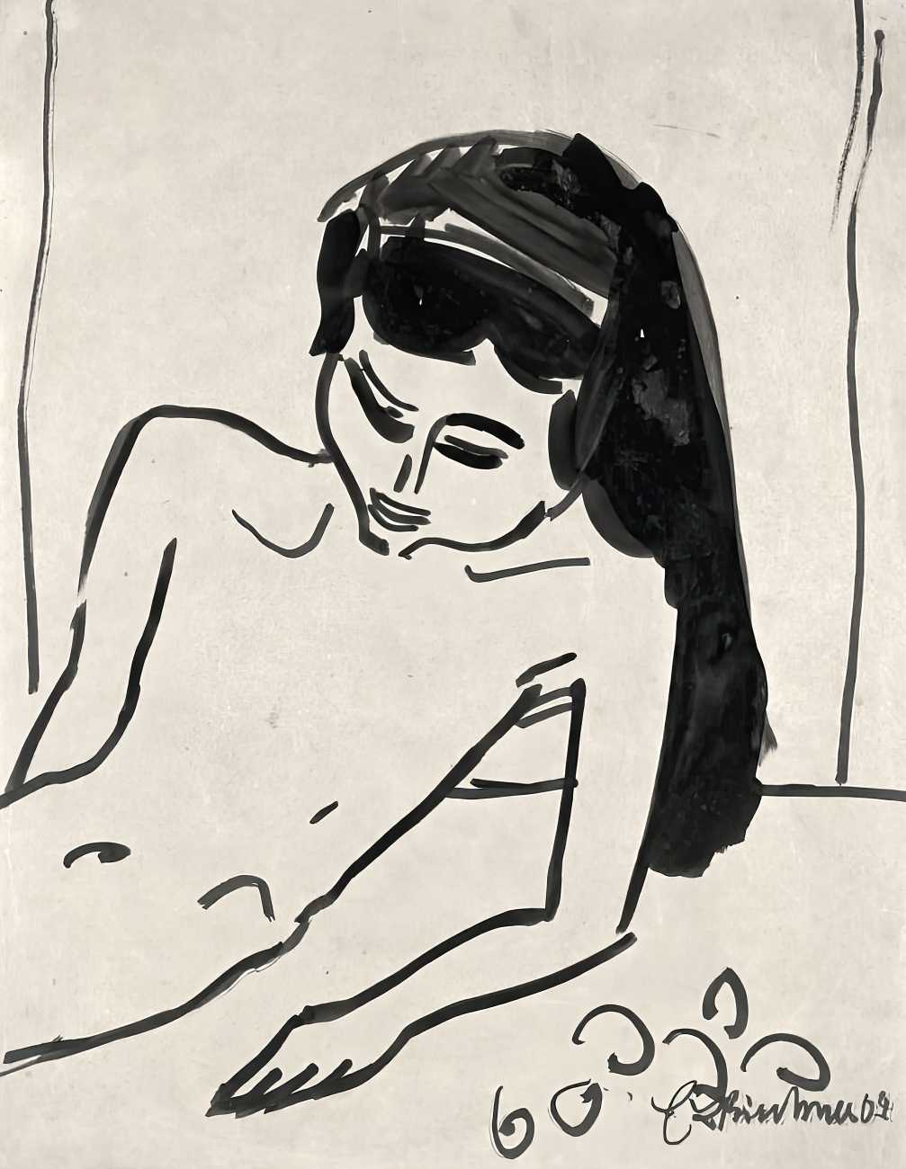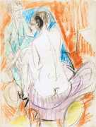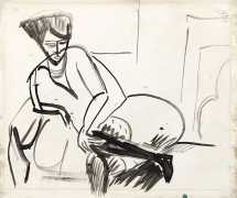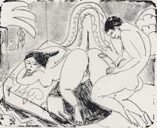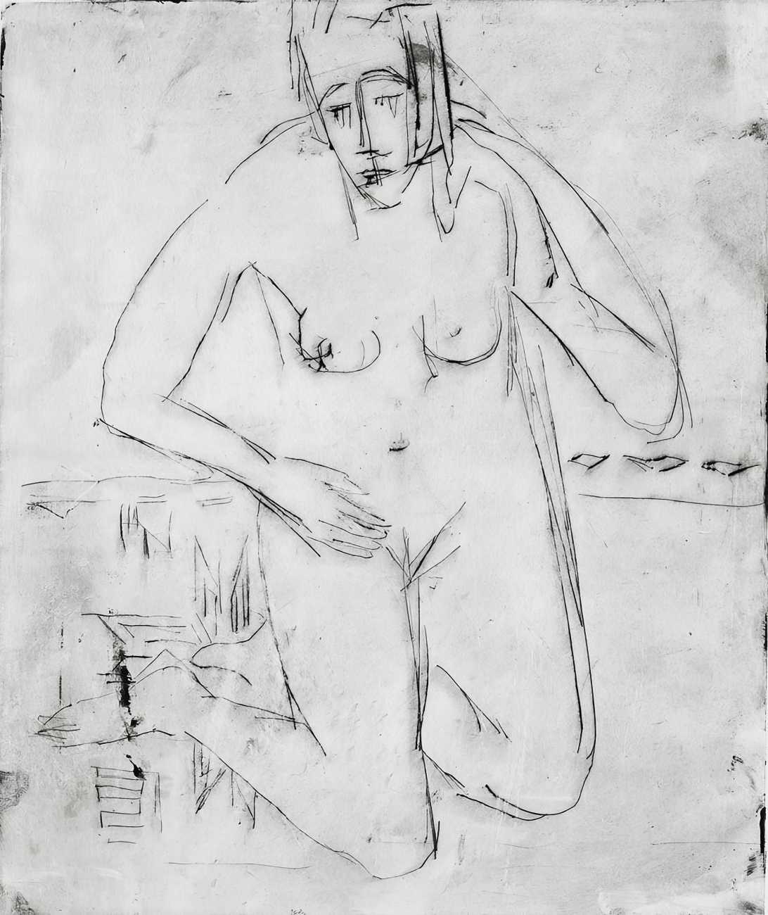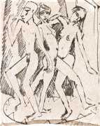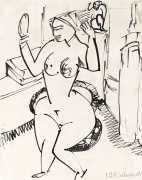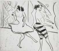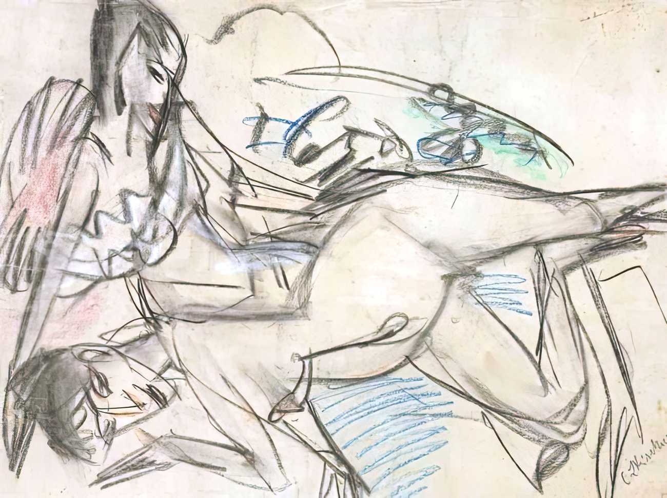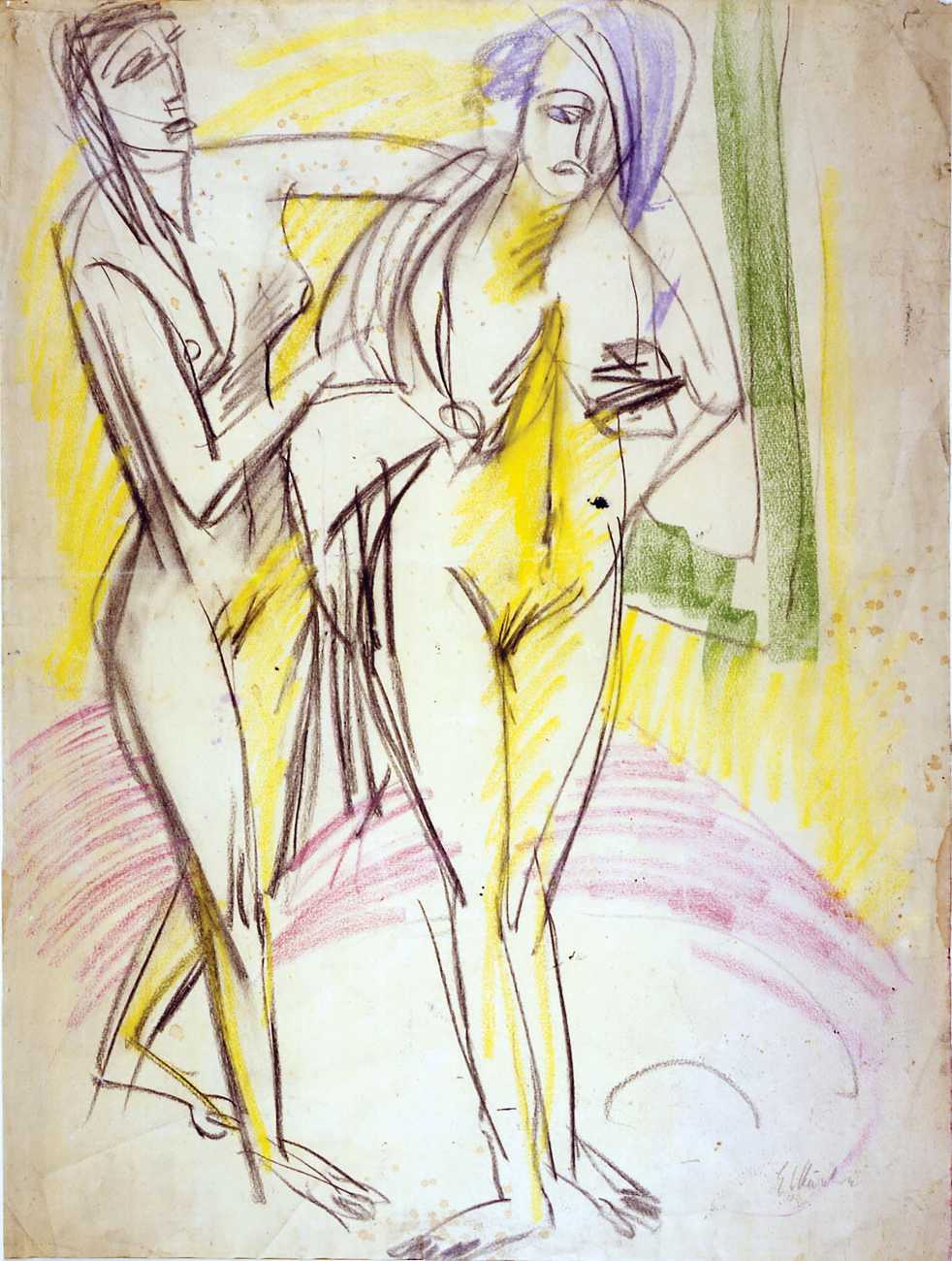 In Kirchner’s drawings the erotic appears with a directness and immediacy distinct from the more theatrically charged sensuality of his paintings. Working quickly with charcoal, ink or pencil, Kirchner used drawing as a laboratory for exploring bodily presence stripped of narrative context or painterly drama. The line became the primary expressive agent, recording desire as a kinetic impulse rather than as a composed scene. His naked subjects often seem caught in a moment of transition – stretching, reclining, dressing, bathing – captured with an economy of line suggesting spontaneity and intimacy.