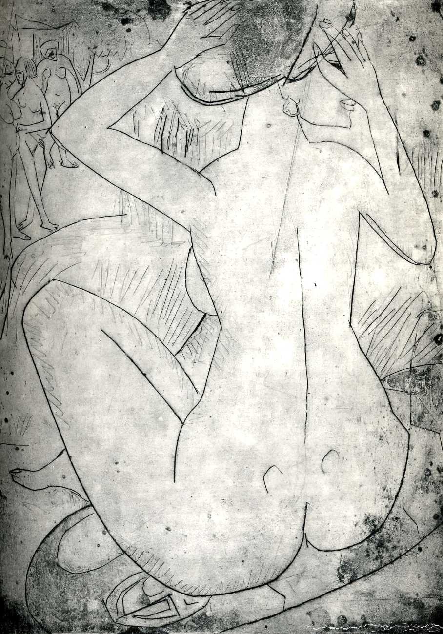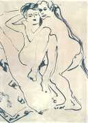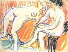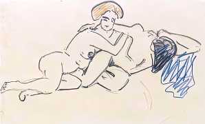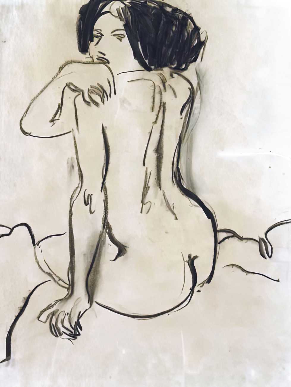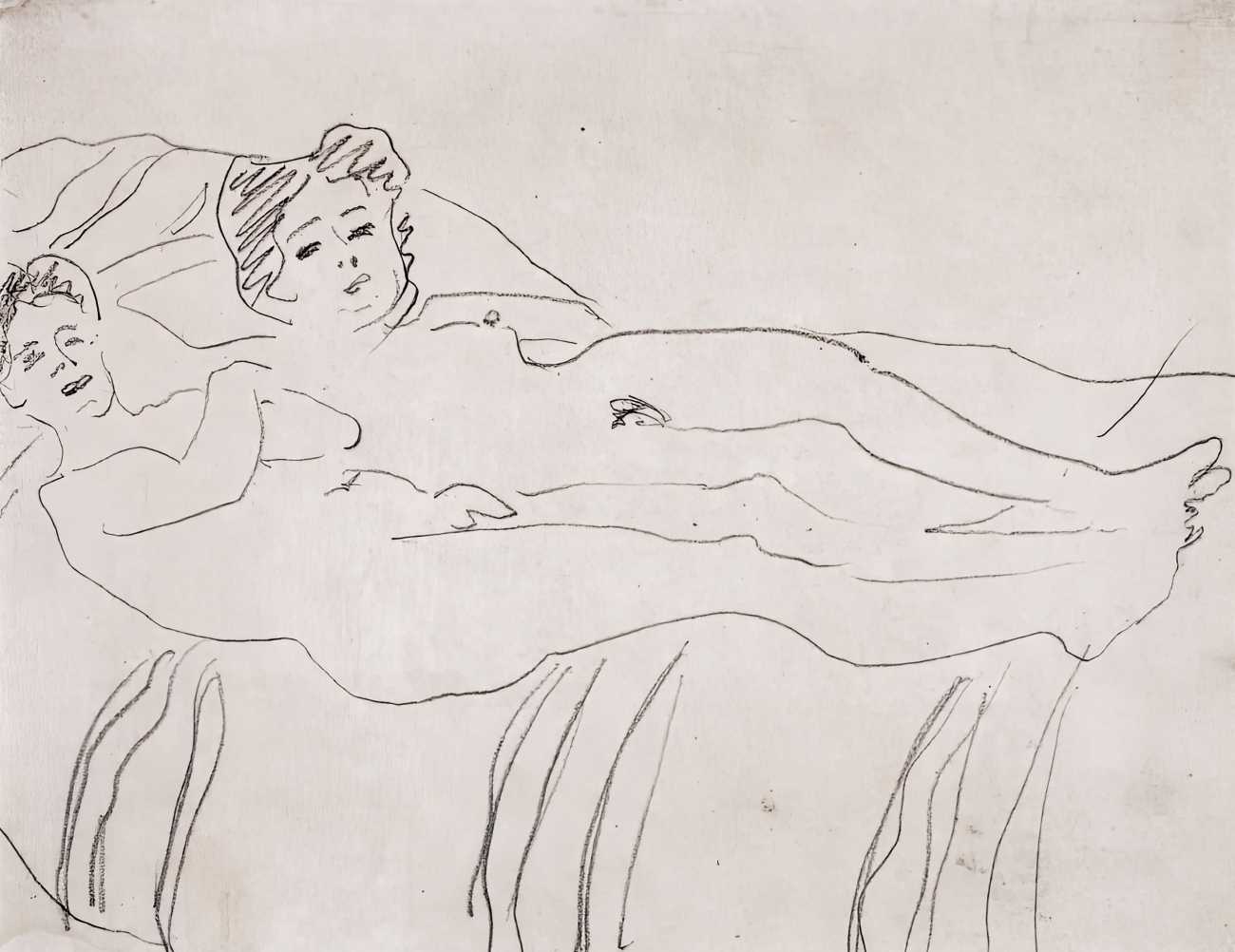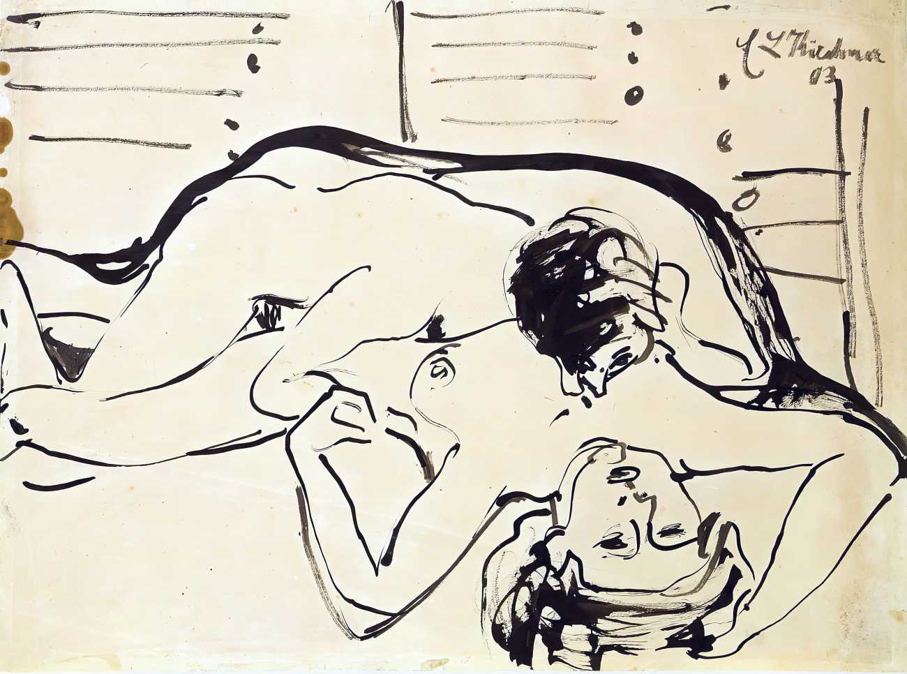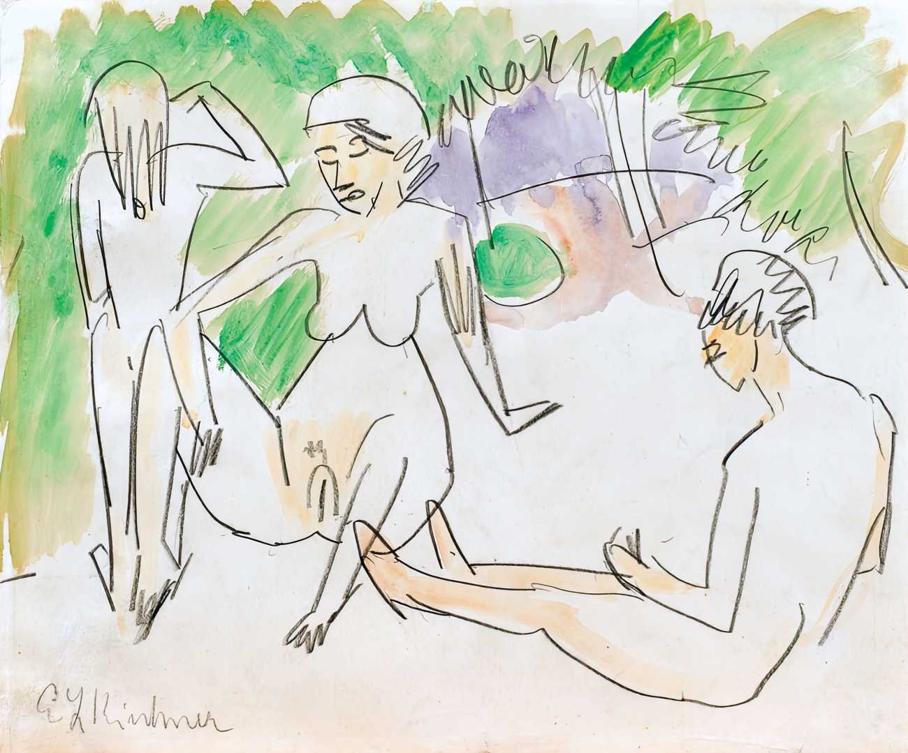 In Kirchner’s drawings the erotic appears with a directness and immediacy distinct from the more theatrically charged sensuality of his paintings. Working quickly with charcoal, ink or pencil, Kirchner used drawing as a laboratory for exploring bodily presence stripped of narrative context or painterly drama. The line became the primary expressive agent, recording desire as a kinetic impulse rather than as a composed scene. His naked subjects often seem caught in a moment of transition – stretching, reclining, dressing, bathing – captured with an economy of line suggesting spontaneity and intimacy.