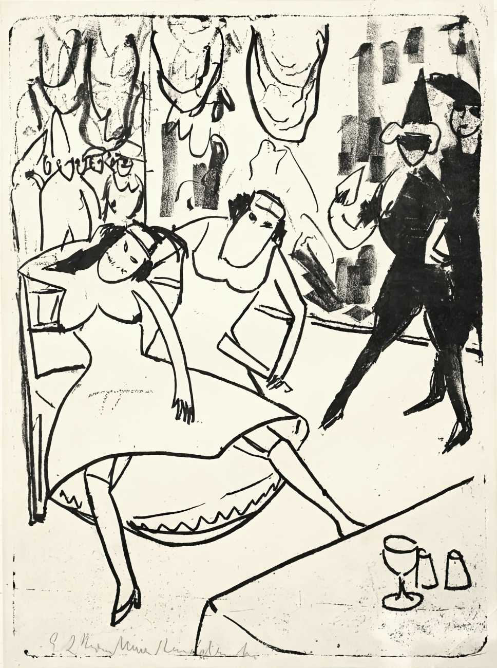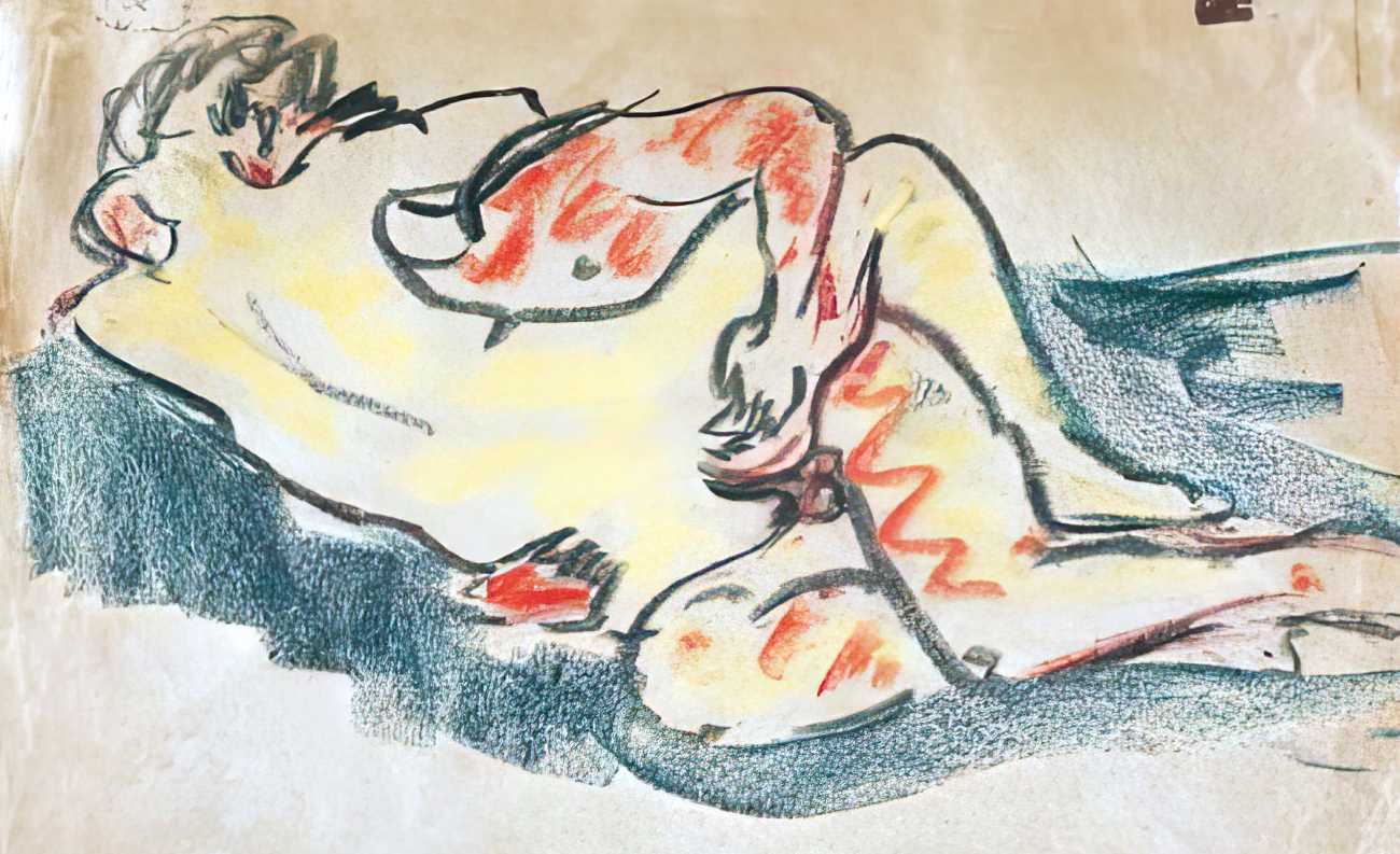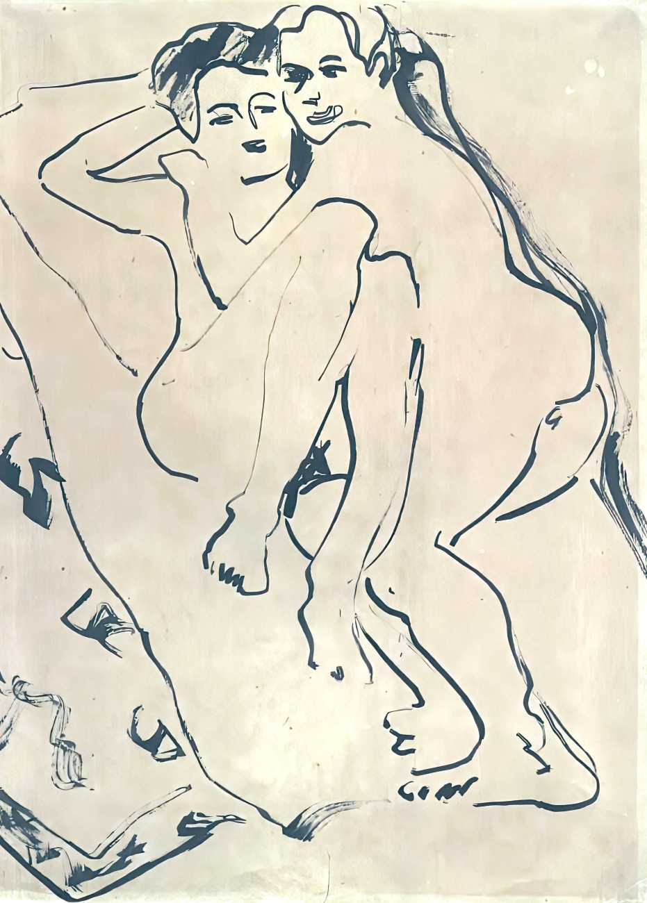 Because drawing offered fewer mediating layers than painting, Kirchner could approach the erotic with a kind of observational frankness. Even when figures are stylised, the emphasis falls on gesture and posture, on how bodies occupy space and relate to one another. The erotic emerges not as spectacle but as a form of lived intimacy shaped by the artist’s encounter with the subject. His drawings often reveal the tension between freedom and restraint that runs through his work. Quick strokes convey liberation and naturalness, yet the compressed compositions and abrupt angles hint at psychological unease.