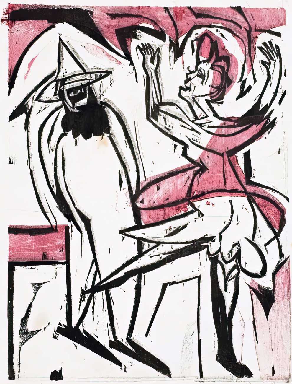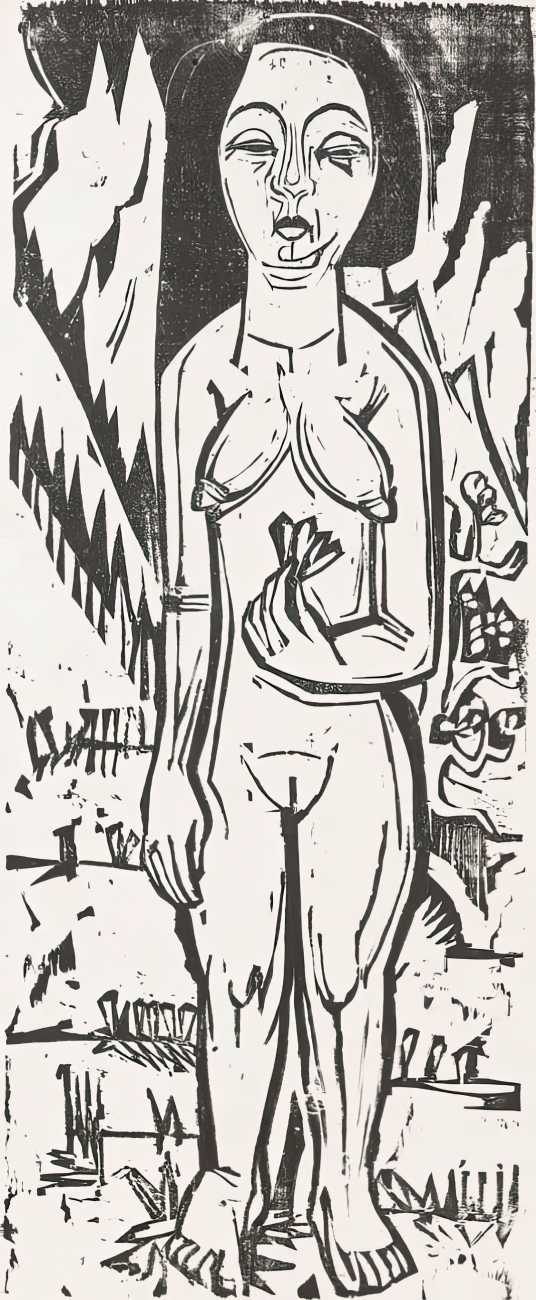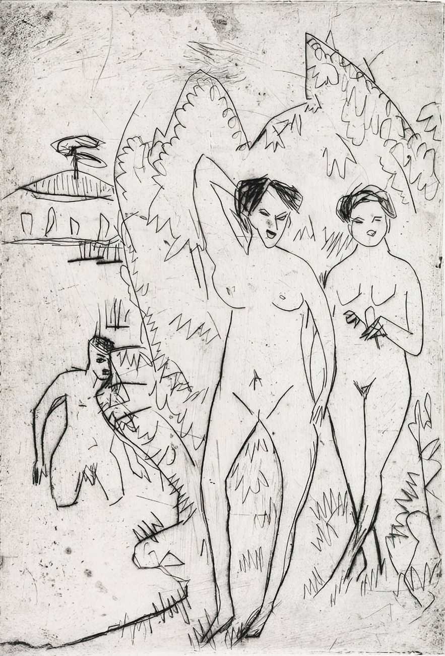 Because drawing offered fewer mediating layers than painting, Kirchner could approach the erotic with a kind of observational frankness. Even when figures are stylised, the emphasis falls on gesture and posture, on how bodies occupy space and relate to one another. The erotic emerges not as spectacle but as a form of lived intimacy shaped by the artist’s encounter with the subject. His drawings often reveal the tension between freedom and restraint that runs through his work. Quick strokes convey liberation and naturalness, yet the compressed compositions and abrupt angles hint at psychological unease.