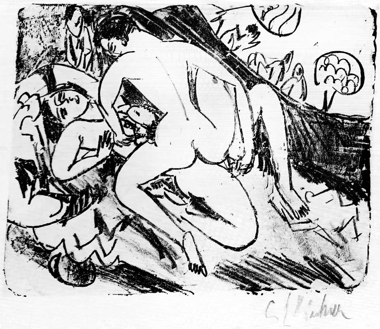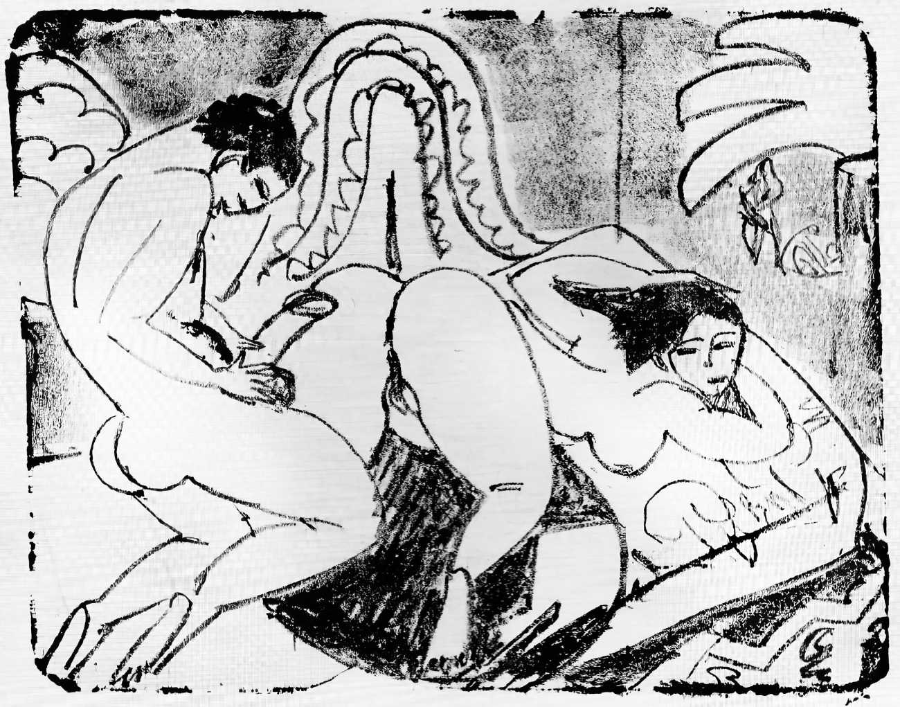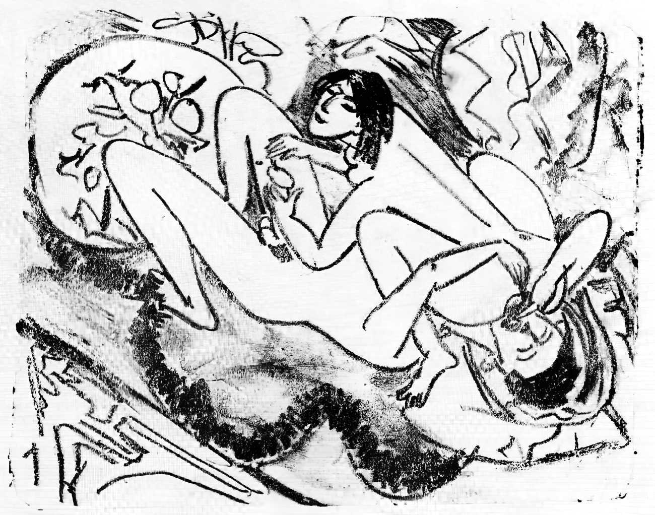 This linked series of explicitly sexual engravings was made in Berlin in 1912–13, at a time when Kirchner’s love life was closely tied to two young women who became central to both his emotional world and his artistic development – Erna Schilling and, to a lesser extent, her sister Gerda. Erna, a dancer and cabaret performer, met Kirchner in late 1911., and their relationship quickly became a long-term partnership, intense, complicated, and deeply interwoven with Kirchner’s work. Erna provided not just sexual and emotional companionship, but also practical stability during a turbulent period of urban overstimulation and artistic ambition. She modelled for him constantly, appearing in numerous drawings, prints, and paintings: Kirchner was drawn to her independence and Bohemian background, while Erna adapted to his volatile temperament and growing psychological struggles.