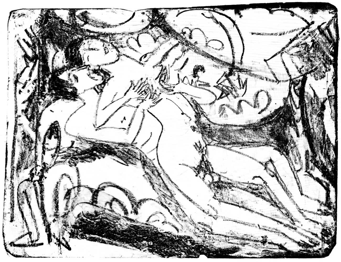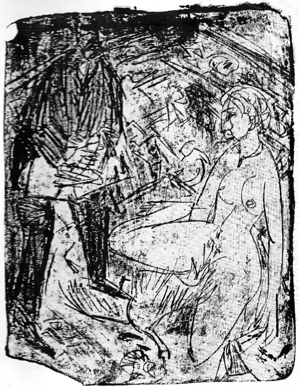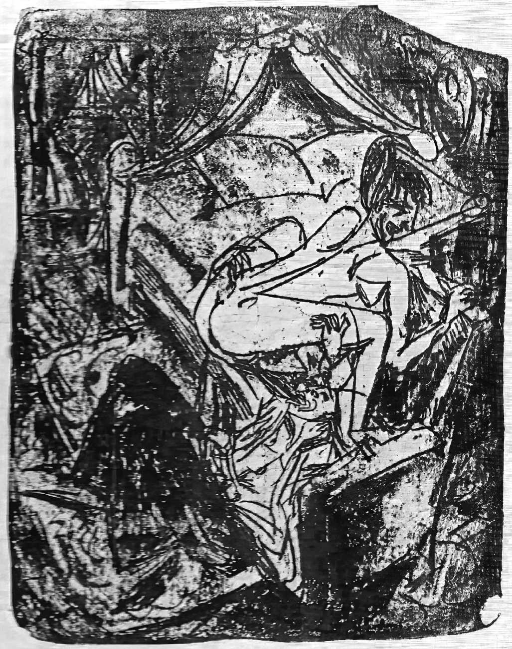 This linked series of explicitly sexual engravings was made in Berlin in 1912–13, at a time when Kirchner’s love life was closely tied to two young women who became central to both his emotional world and his artistic development – Erna Schilling and, to a lesser extent, her sister Gerda. Erna, a dancer and cabaret performer, met Kirchner in late 1911., and their relationship quickly became a long-term partnership, intense, complicated, and deeply interwoven with Kirchner’s work. Erna provided not just sexual and emotional companionship, but also practical stability during a turbulent period of urban overstimulation and artistic ambition. She modelled for him constantly, appearing in numerous drawings, prints, and paintings: Kirchner was drawn to her independence and Bohemian background, while Erna adapted to his volatile temperament and growing psychological struggles.