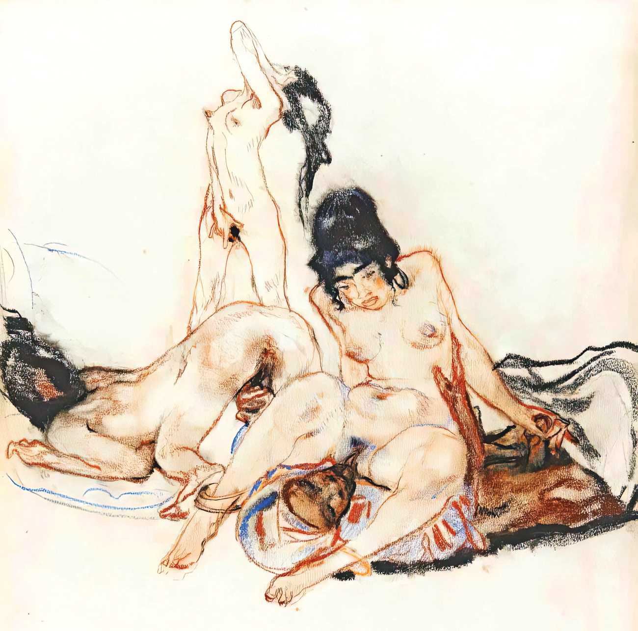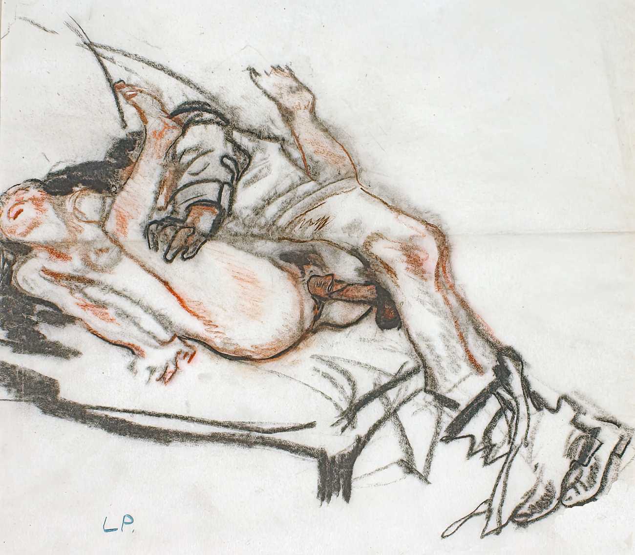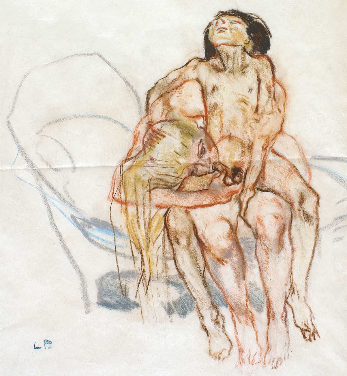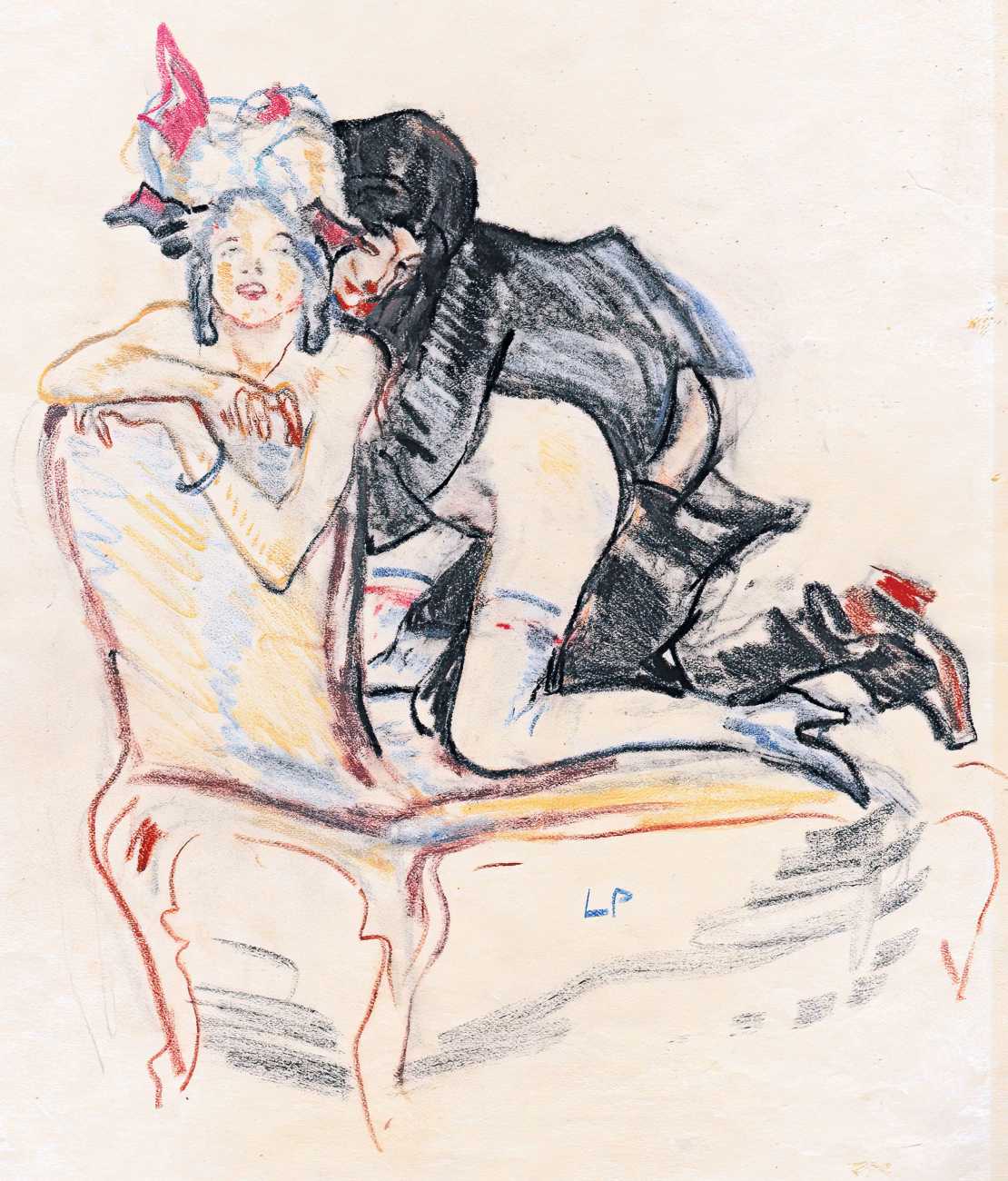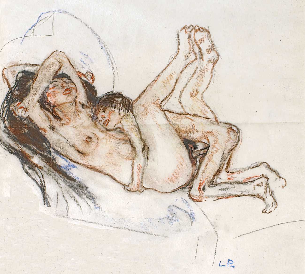 Leo Putz’s erotic drawings occupy a different register from his oil paintings – smaller, more intimate works on paper that trade the canvases’ painterly colour fields and surface build-up for direct line, immediacy, and the opportunity to imagine a much more explicit range of sexual subjects. Where his oils celebrate light, atmosphere and pictorial harmony, many of the known erotic works, executed in pencil, coloured pencil, chalk and pastel, rely on the sensual suggestion of contour and touch: the sweep of a back, the weight of a thigh, all rendered in a few confident strokes.