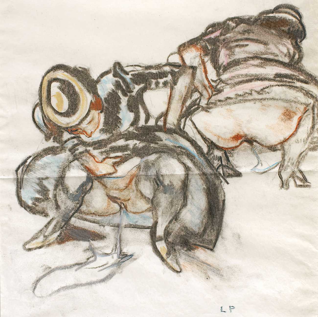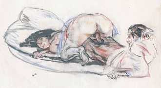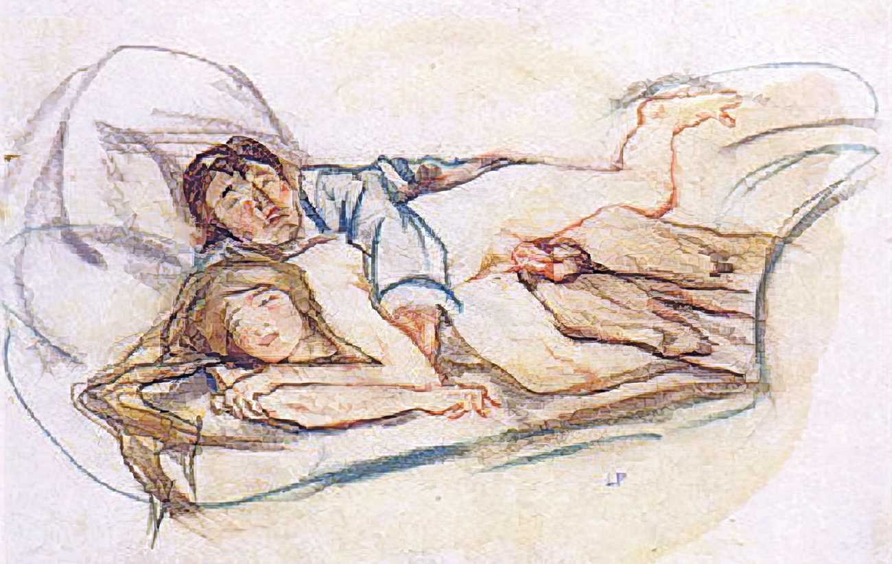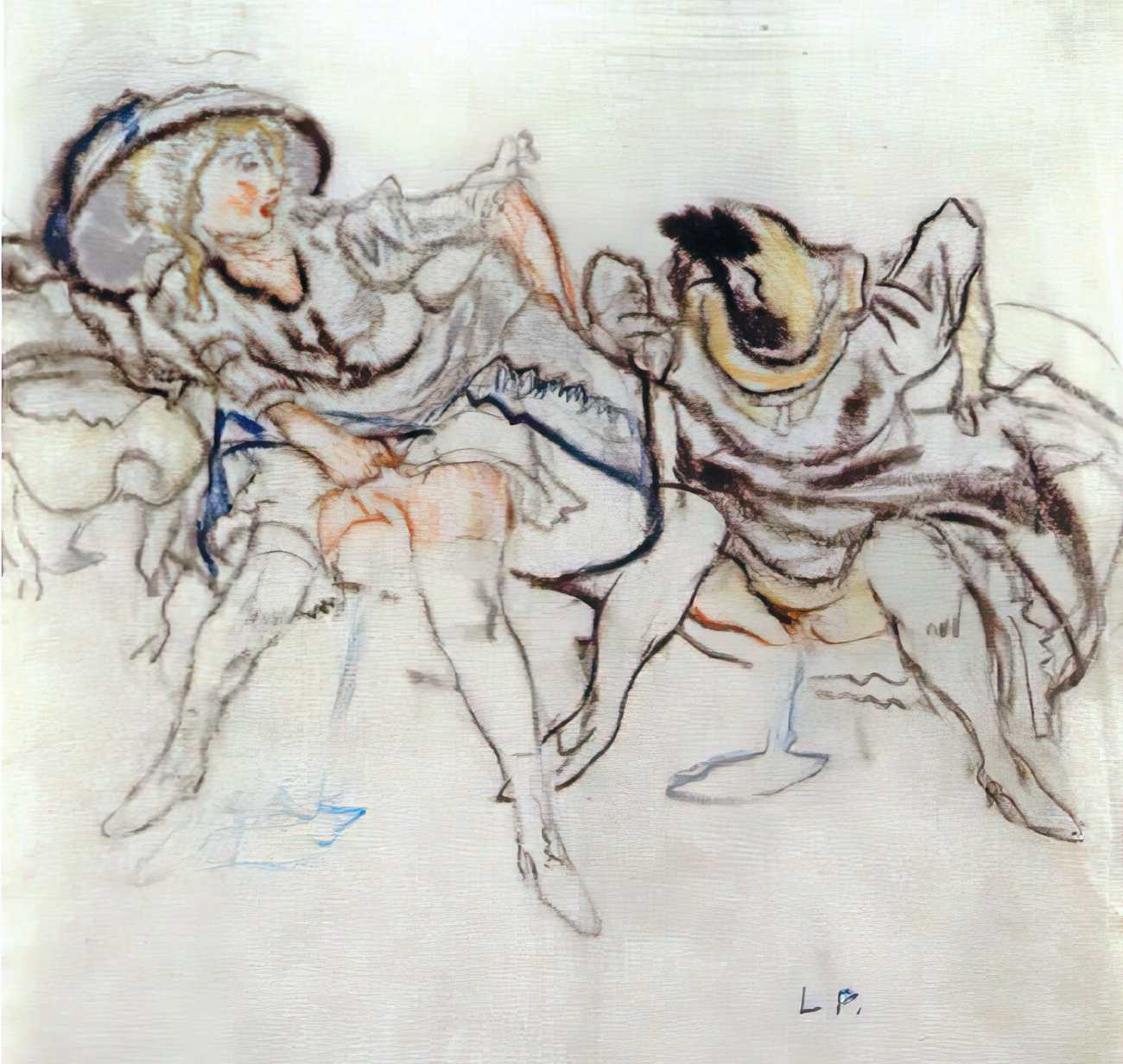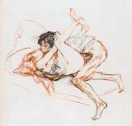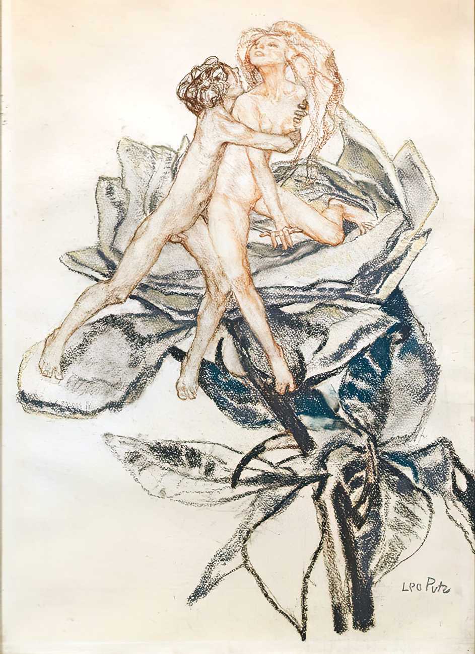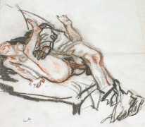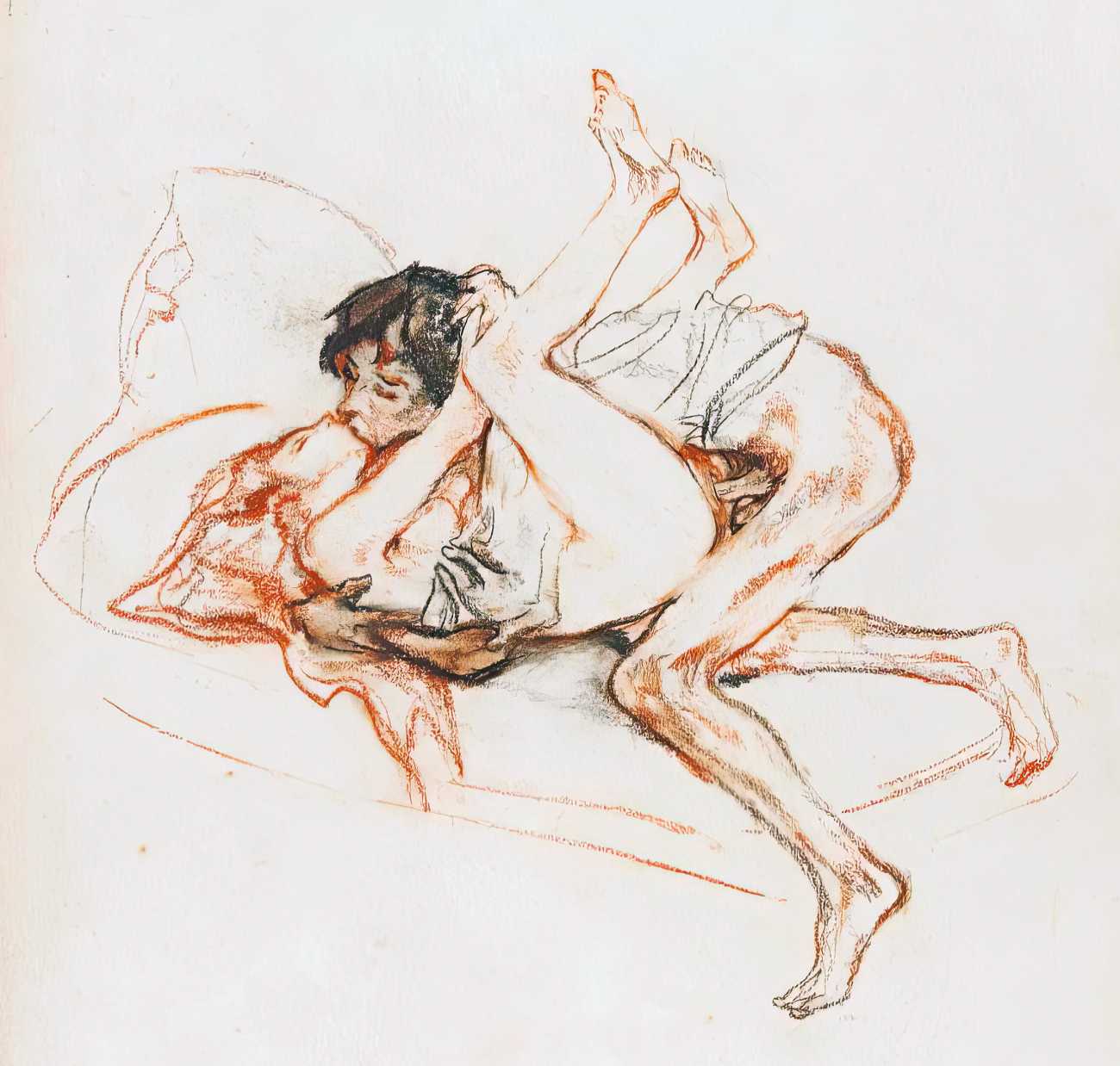 Leo Putz’s erotic drawings occupy a different register from his oil paintings – smaller, more intimate works on paper that trade the canvases’ painterly colour fields and surface build-up for direct line, immediacy, and the opportunity to imagine a much more explicit range of sexual subjects. Where his oils celebrate light, atmosphere and pictorial harmony, many of the known erotic works, executed in pencil, coloured pencil, chalk and pastel, rely on the sensual suggestion of contour and touch: the sweep of a back, the weight of a thigh, all rendered in a few confident strokes.