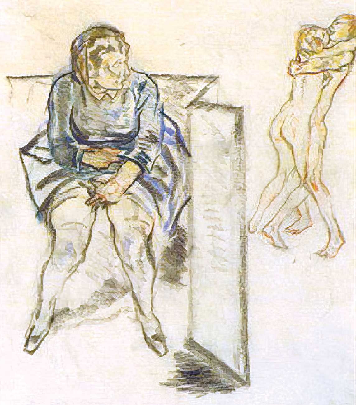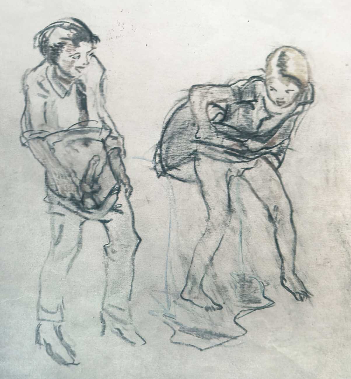 His drawings allowed Putz to explore the figure with a quicker, more intimate hand. Pastel and coloured pencil permit immediate modulation of skin tone on paper without the drying time and layering oil requires. This makes the drawings feel more private and improvisational – studies or vignettes meant for close viewing, collecting in portfolios, or reproduction in prints rather than the public display function that large oils fulfilled.