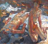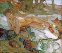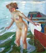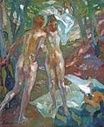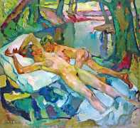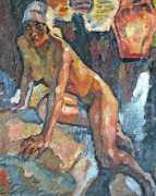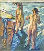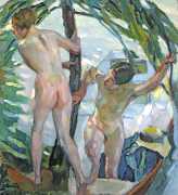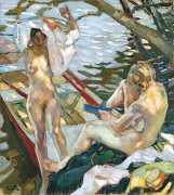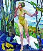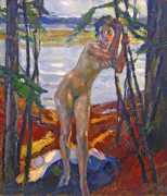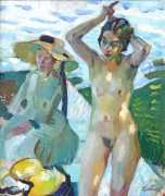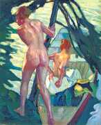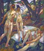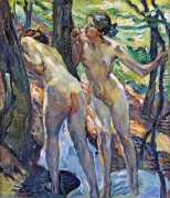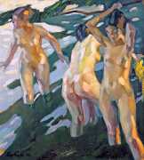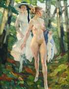 Putz’s Badende balance innocence and sensuality: nudity is seldom eroticised through dramatic poses or explicit detail. Instead, mood, reflected light and the communal yet secluded setting of a lakeside grove create a contemplative eroticism – viewers are invited to appreciate the body as a natural element in an idyllic scene rather than as the central object. The paintings capture a very specific strand of early-twentieth-century Germanic painting, where impressionist light and decorative modernism met to celebrate leisure, nature, and the painted surface.