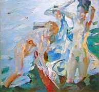 The series marries plein-air freshness with a decorative art nouveau line. Putz often composes the scene so that the bodies are integrated into the landscape through repeated shapes – arched tree branches, rippling water, folded cloth – and a palette that emphasises warm flesh tones against cool water and verdure. His brushwork ranges from relatively broad, sketch-like strokes that capture light and reflection to more modulated passages for the torso and face, producing a tension between immediacy and careful modelling.