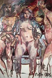 Foth’s handling of form moves between suggestion and clarity. Faces and limbs are sometimes rendered with candid solidity, elsewhere they dissolve into expressive strokes or surface interventions, so the erotic charge is always expressed in a painterly self-awareness.
