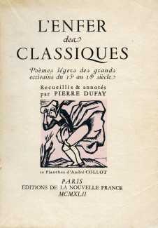 The full title of this well-researched and careful selection of more than two hundred pieces of erotic literature by nearly a hundred authors is L’enfer des classiques, poèmes légers des grands écrivains du 15e au 18e siècle (The Netherworld of the Classics: Lighthearted Poems by Great Writers from the 15th to the 18th Century). The introduction by Pierre Dufay (1864–1942), best known for his 1906 history of women’s underwear Le pantalon féminin (Women’s Knickers), and is a very competent overview of ‘gallant’ texts from early anonymous ballads to the much-quoted eighteenth century authors Jean de la Fontaine, Alexis Piron, Jean-Baptiste-Joseph de Grécourt and Voltaire.