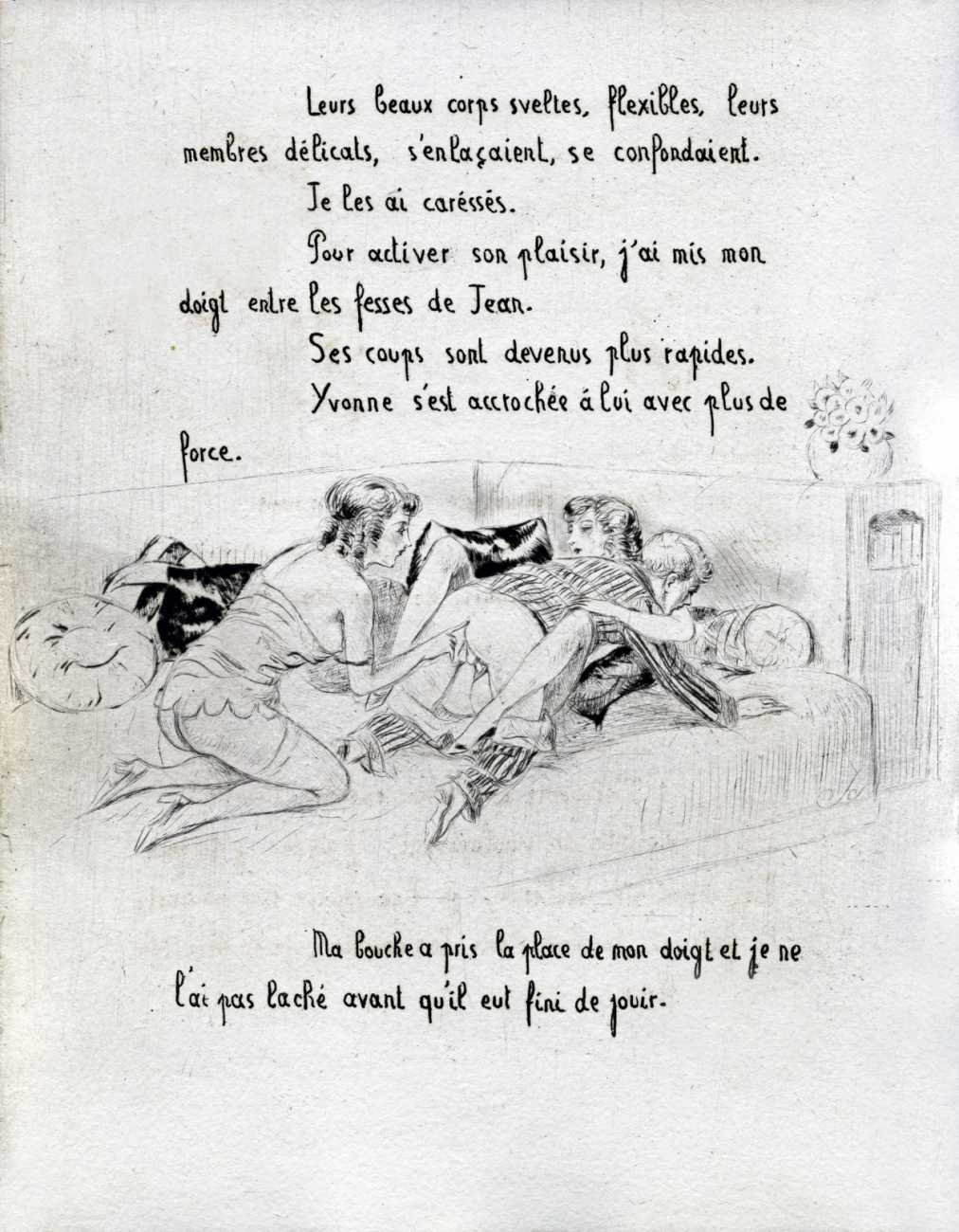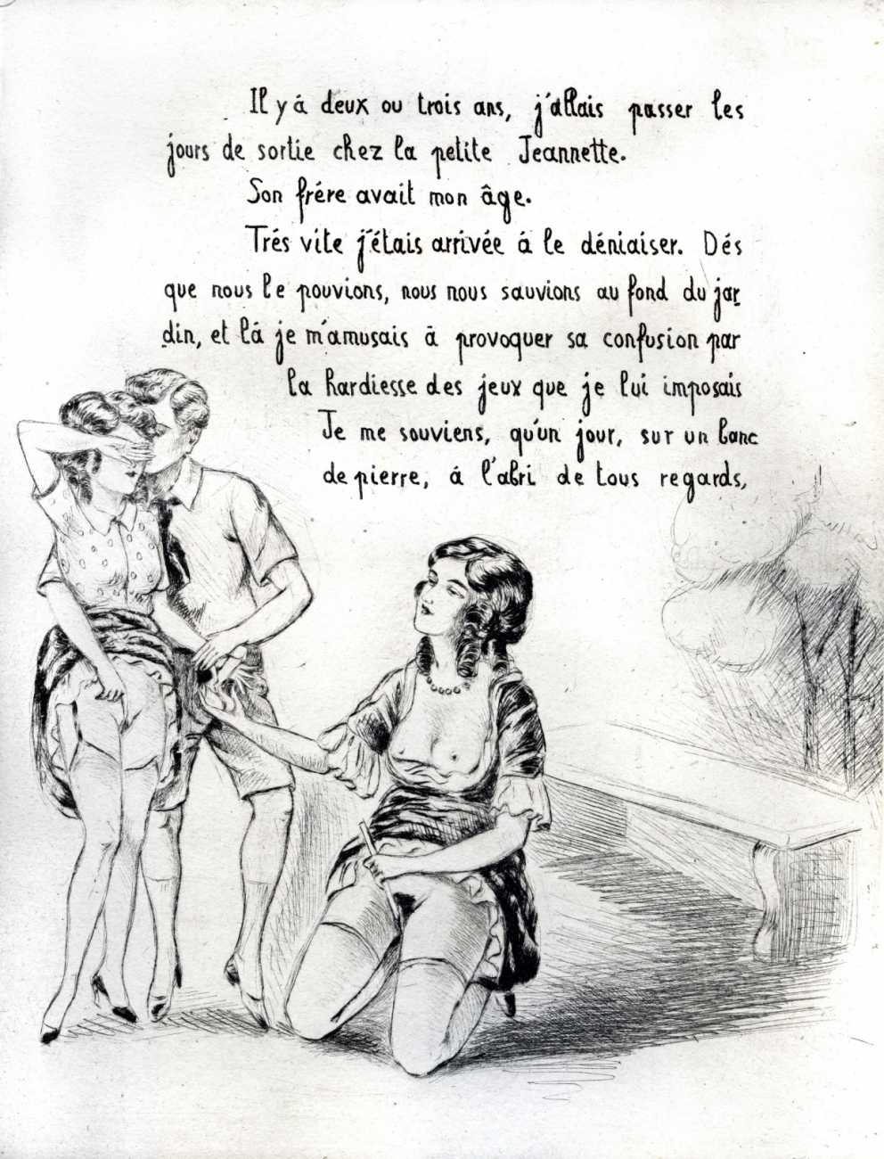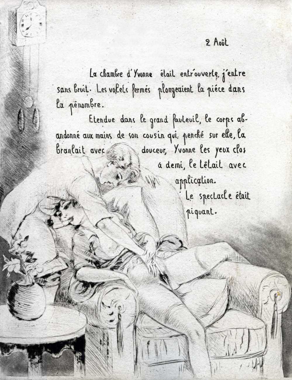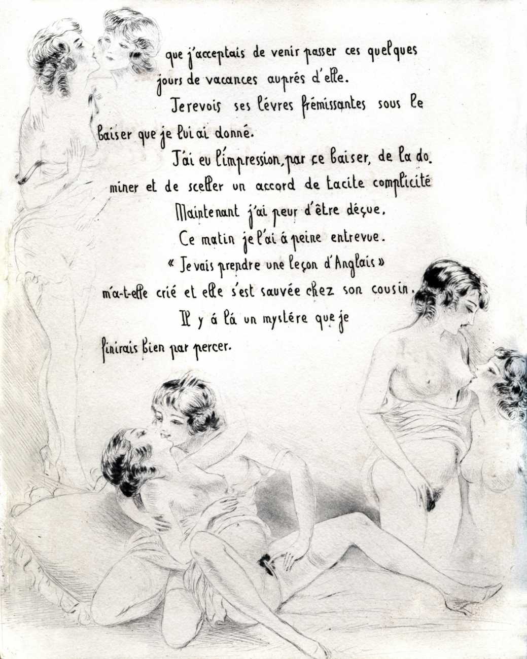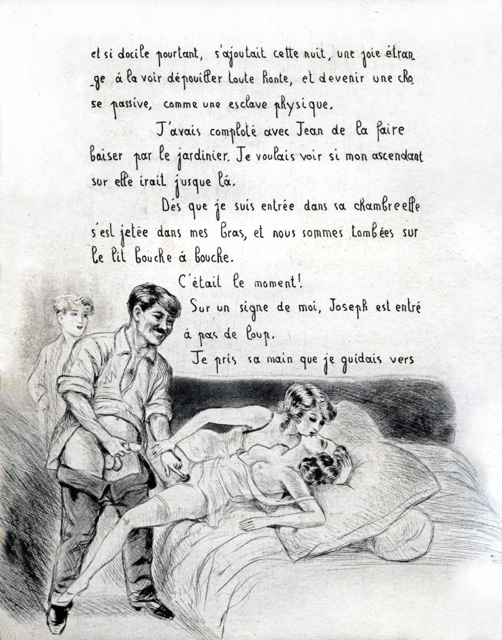 The first of Courbouleix’s Suzon volumes, published in 1935 under the imprint Aux dépens des amis de Cupidon (‘At the expense of the friends of Cupid’), was by far the best production, both for the quality of its illustrations and the spareness of its text. Suzon en vacances tells the story of Suzon visiting her friend Yvonne in the countryside one early August, and meeting Yvonne’s cousins Jeannette and Jean. It describes in poetic detail the sexual awakening they experience together, with the added assistance of the gardener Joseph.