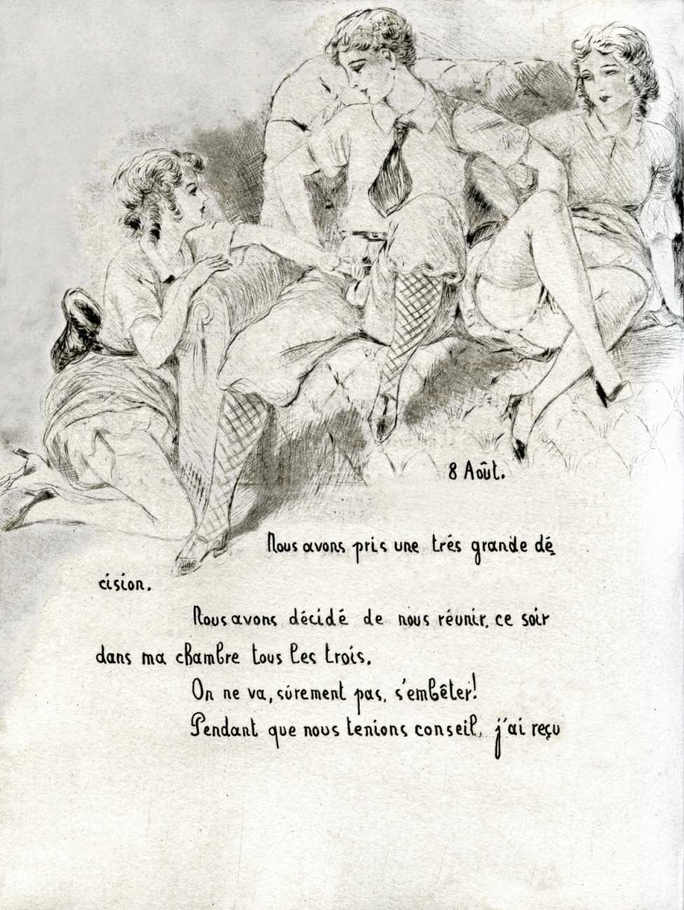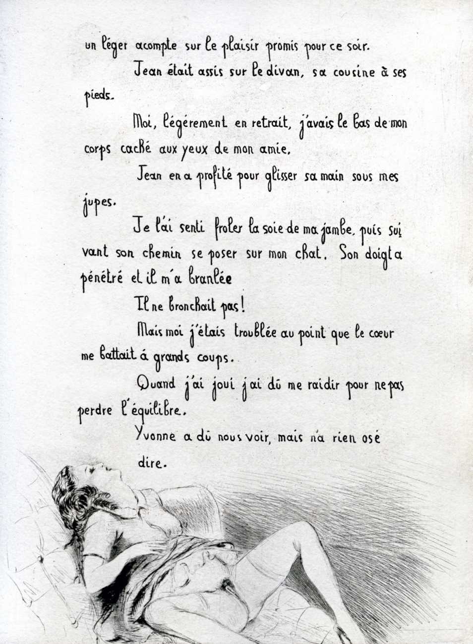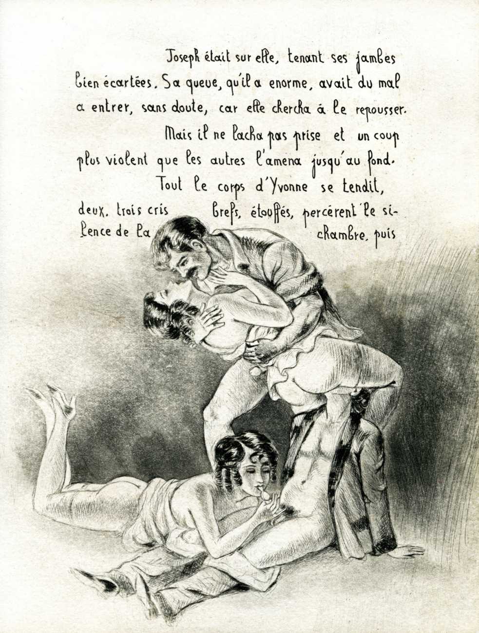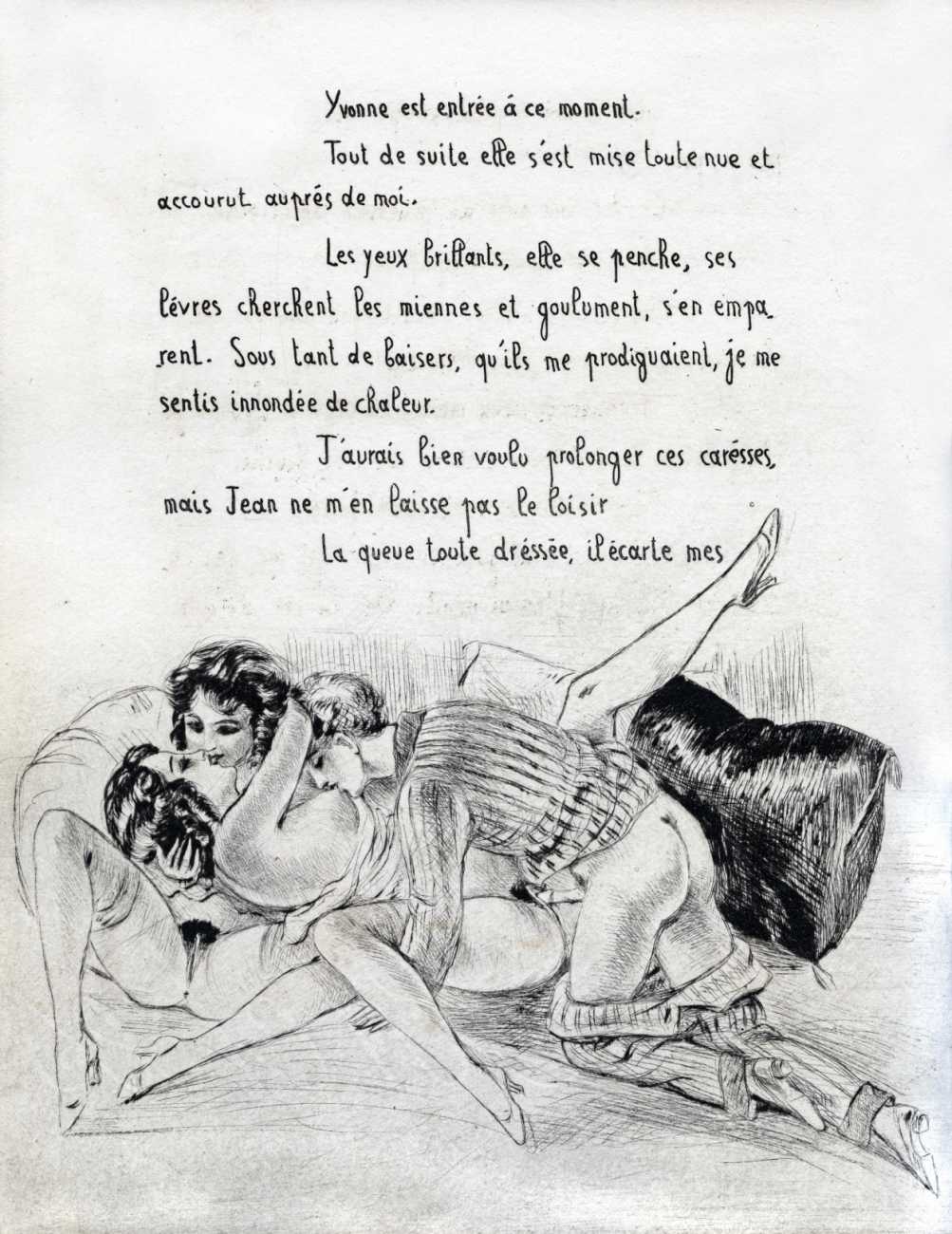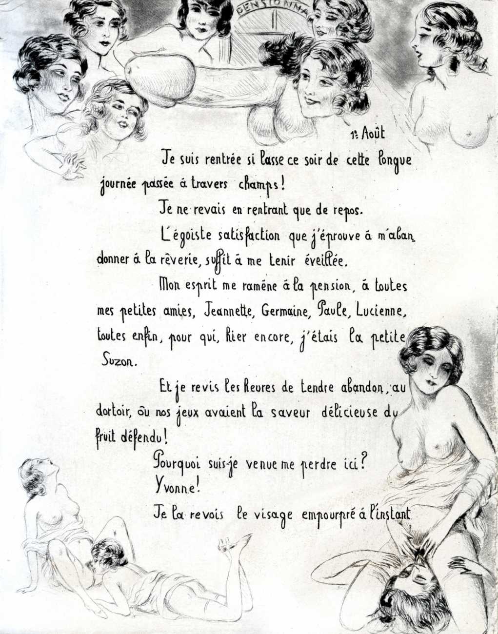 The first of Courbouleix’s Suzon volumes, published in 1935 under the imprint Aux dépens des amis de Cupidon (‘At the expense of the friends of Cupid’), was by far the best production, both for the quality of its illustrations and the spareness of its text. Suzon en vacances tells the story of Suzon visiting her friend Yvonne in the countryside one early August, and meeting Yvonne’s cousins Jeannette and Jean. It describes in poetic detail the sexual awakening they experience together, with the added assistance of the gardener Joseph.