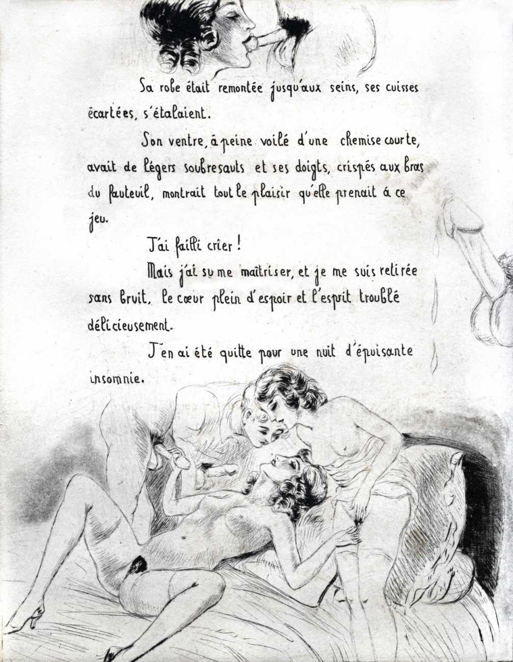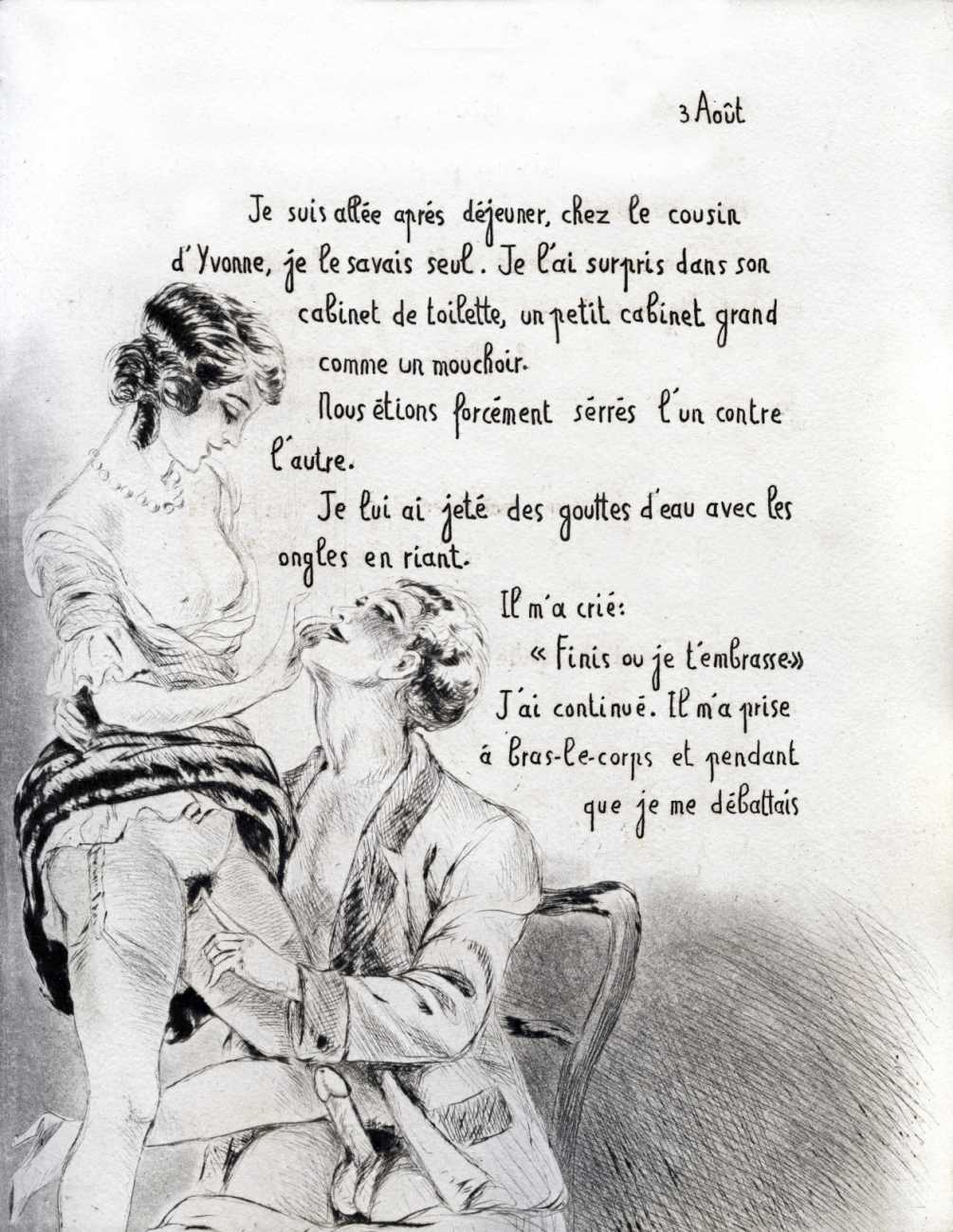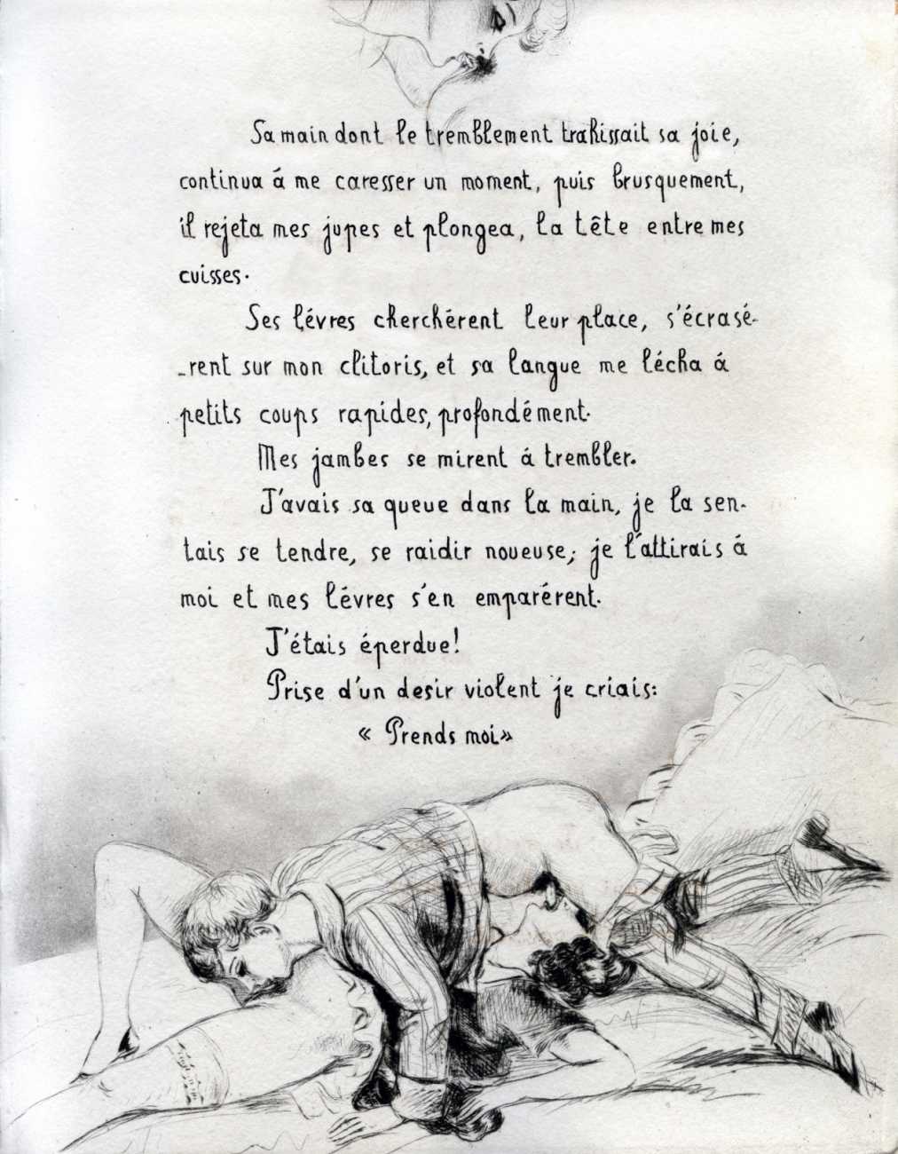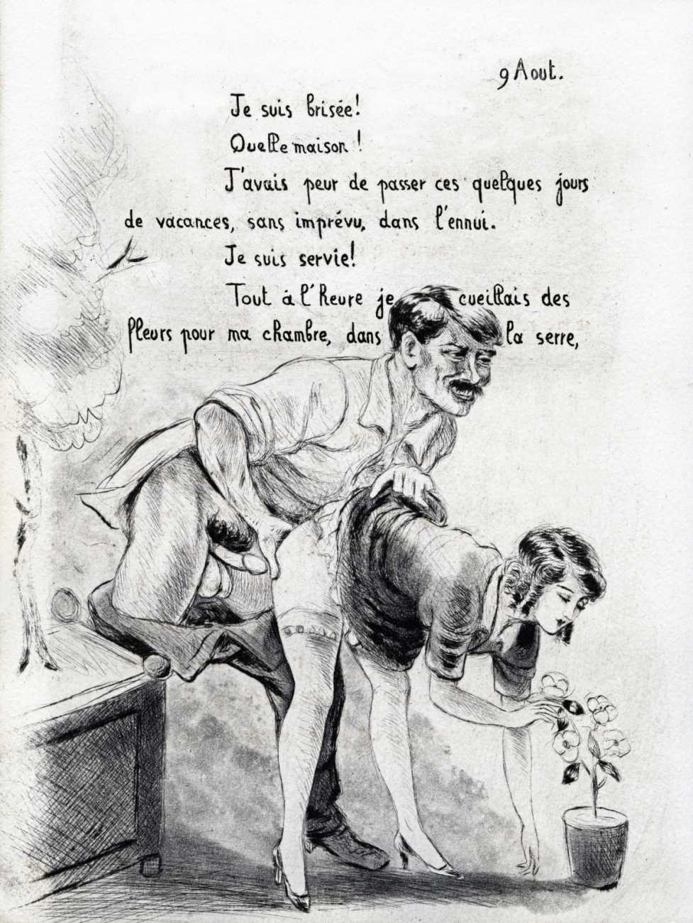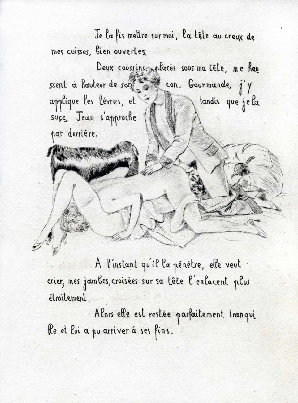 The first of Courbouleix’s Suzon volumes, published in 1935 under the imprint Aux dépens des amis de Cupidon (‘At the expense of the friends of Cupid’), was by far the best production, both for the quality of its illustrations and the spareness of its text. Suzon en vacances tells the story of Suzon visiting her friend Yvonne in the countryside one early August, and meeting Yvonne’s cousins Jeannette and Jean. It describes in poetic detail the sexual awakening they experience together, with the added assistance of the gardener Joseph.