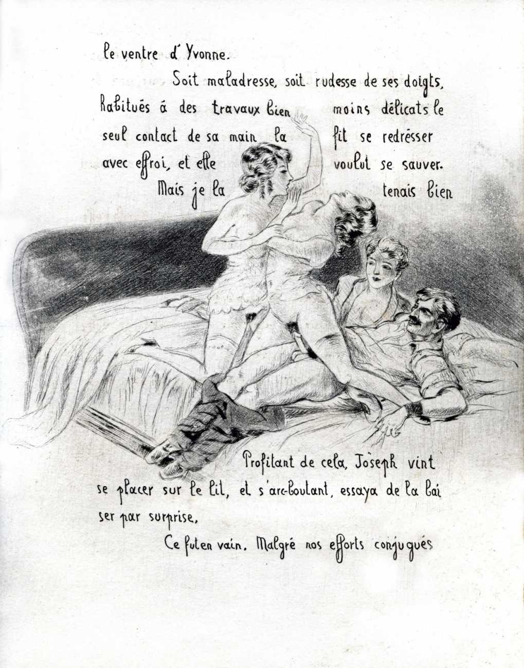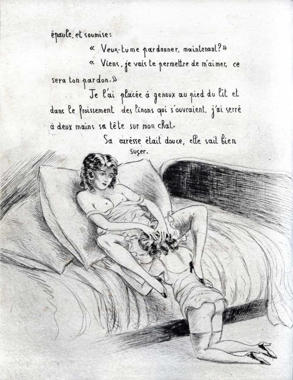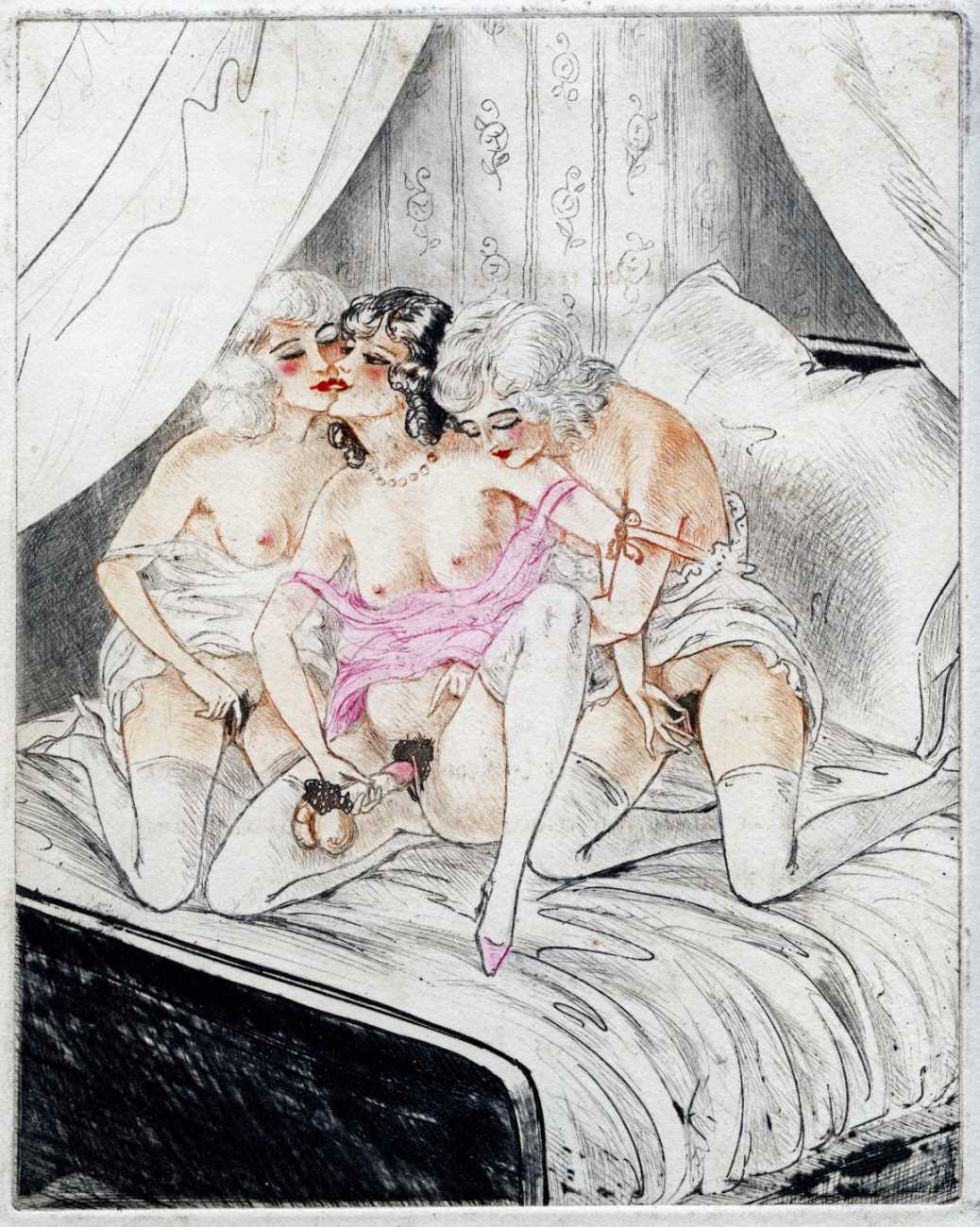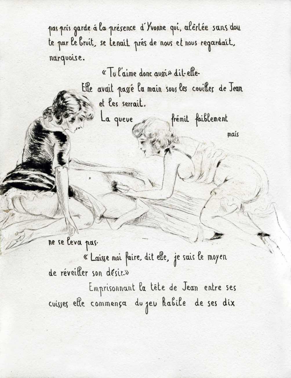 The first of Courbouleix’s Suzon volumes, published in 1935 under the imprint Aux dépens des amis de Cupidon (‘At the expense of the friends of Cupid’), was by far the best production, both for the quality of its illustrations and the spareness of its text. Suzon en vacances tells the story of Suzon visiting her friend Yvonne in the countryside one early August, and meeting Yvonne’s cousins Jeannette and Jean. It describes in poetic detail the sexual awakening they experience together, with the added assistance of the gardener Joseph.