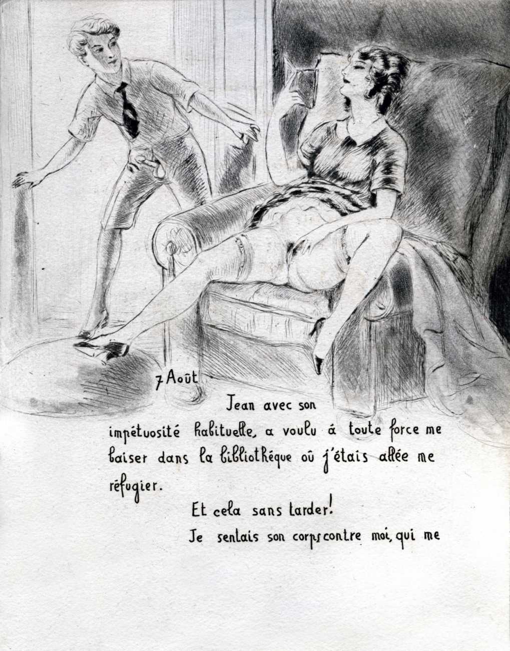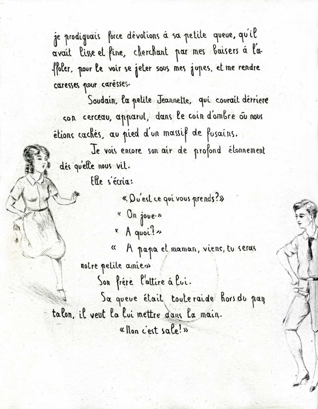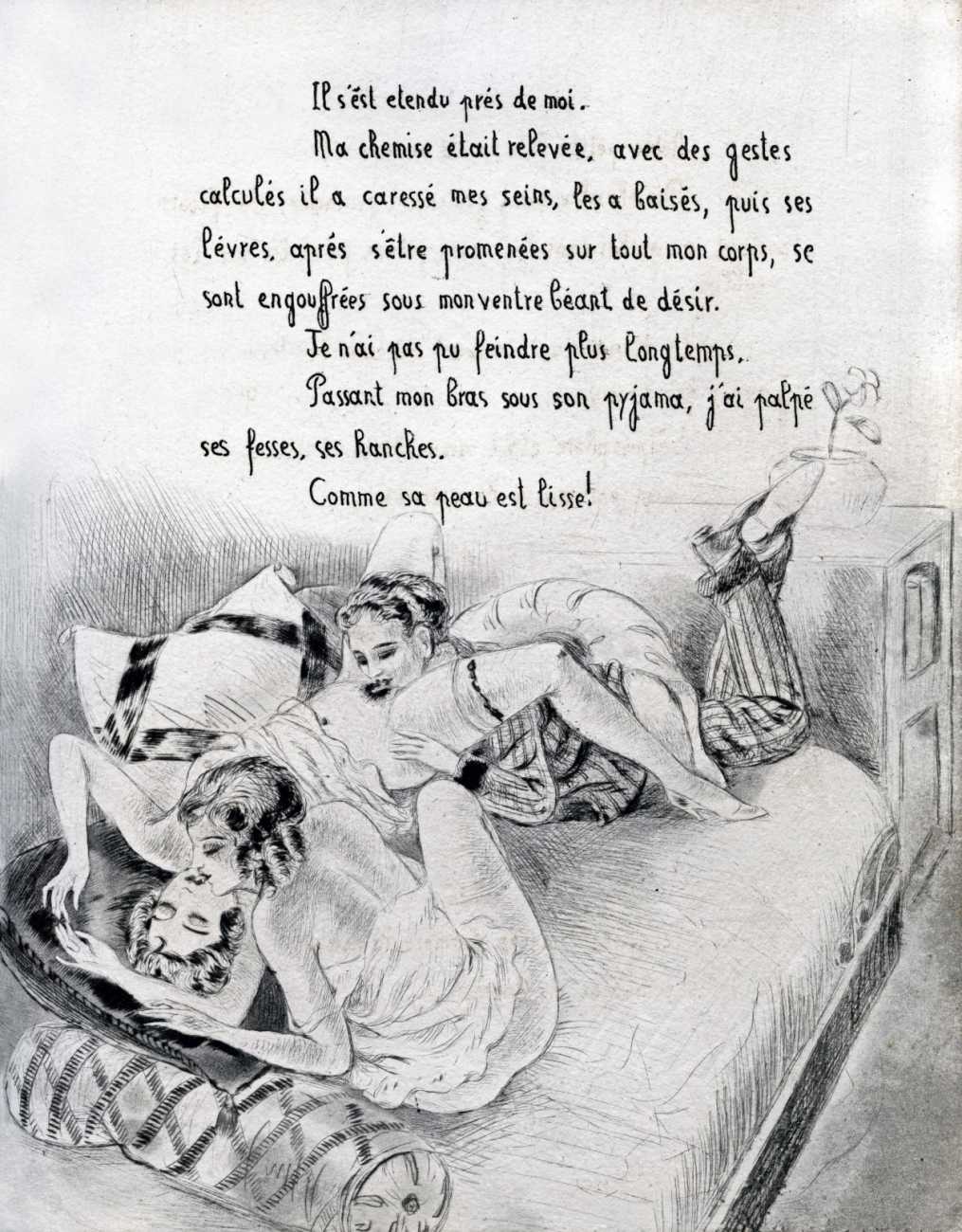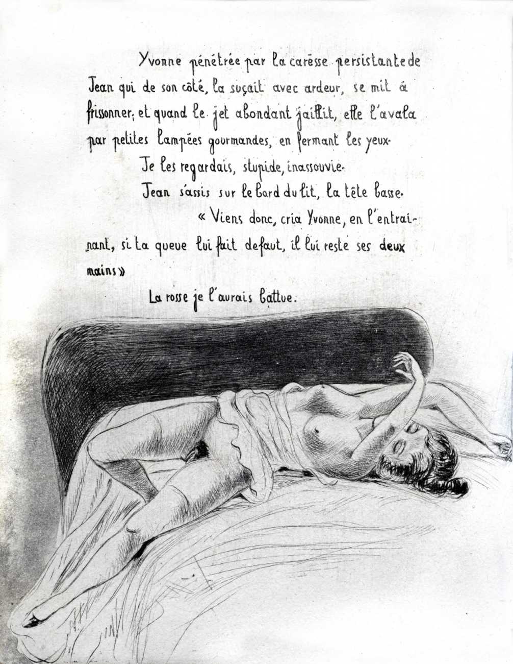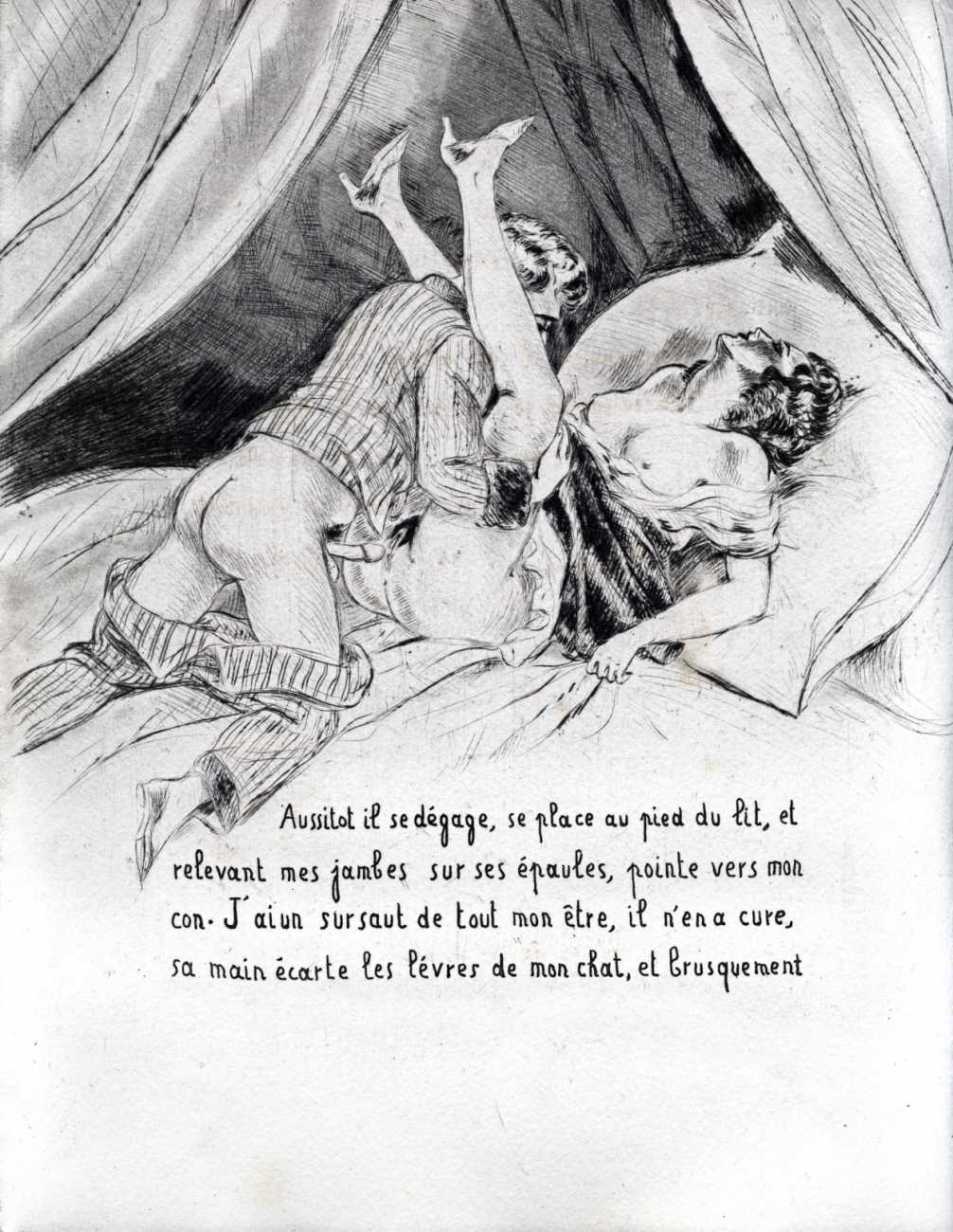 The first of Courbouleix’s Suzon volumes, published in 1935 under the imprint Aux dépens des amis de Cupidon (‘At the expense of the friends of Cupid’), was by far the best production, both for the quality of its illustrations and the spareness of its text. Suzon en vacances tells the story of Suzon visiting her friend Yvonne in the countryside one early August, and meeting Yvonne’s cousins Jeannette and Jean. It describes in poetic detail the sexual awakening they experience together, with the added assistance of the gardener Joseph.