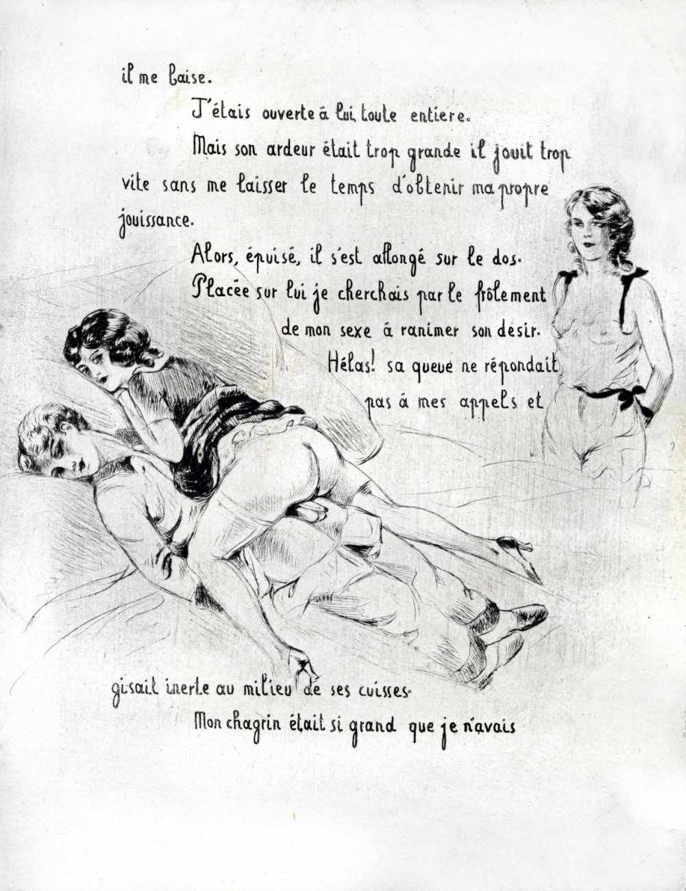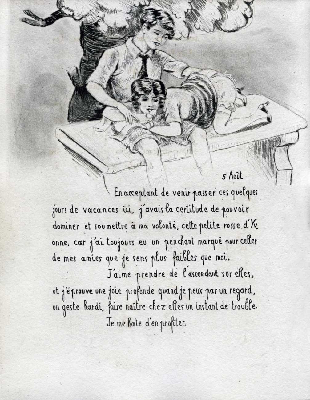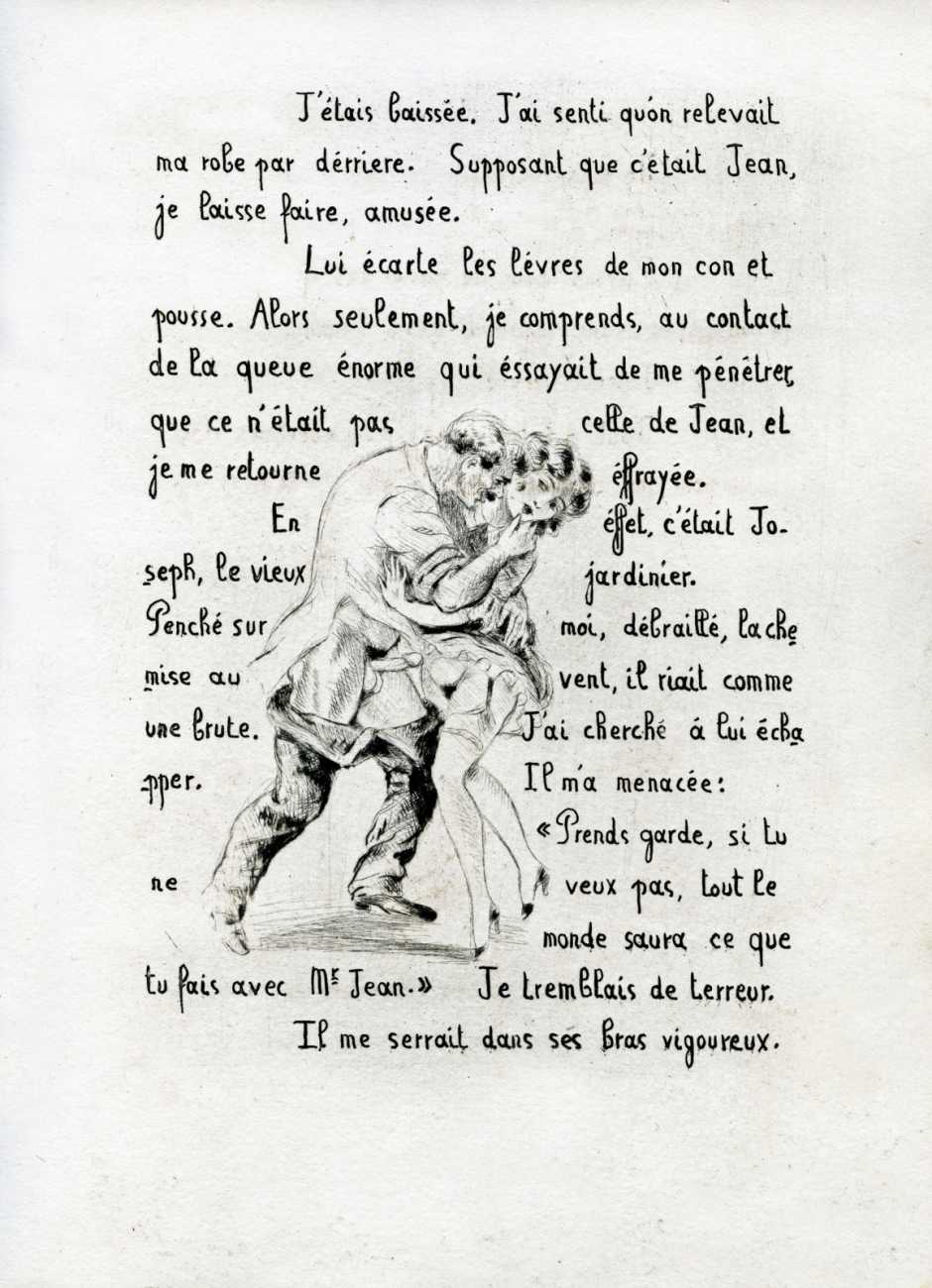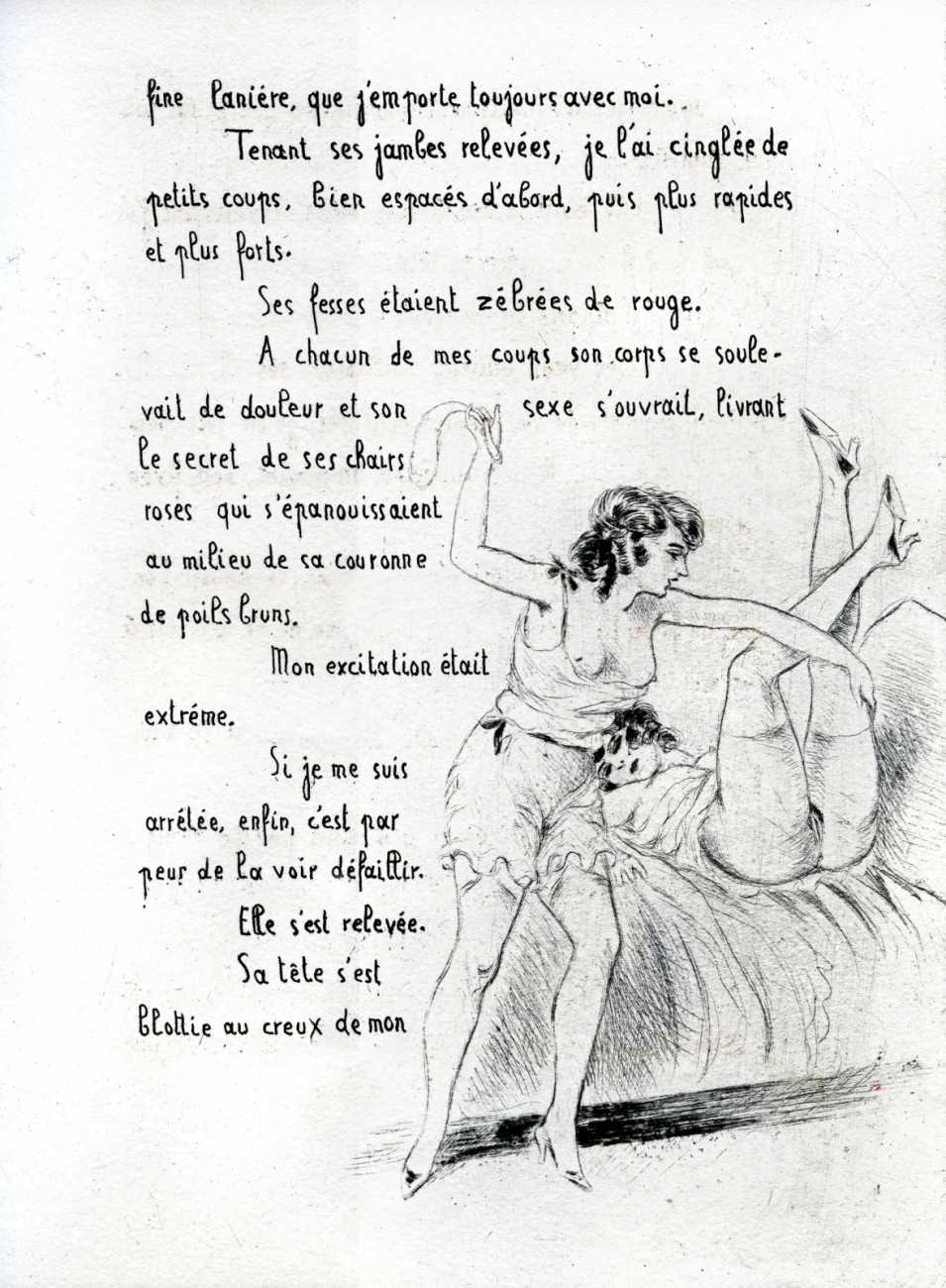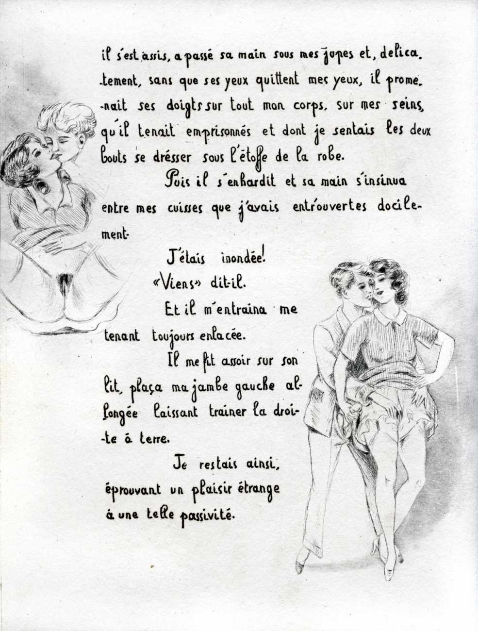 The first of Courbouleix’s Suzon volumes, published in 1935 under the imprint Aux dépens des amis de Cupidon (‘At the expense of the friends of Cupid’), was by far the best production, both for the quality of its illustrations and the spareness of its text. Suzon en vacances tells the story of Suzon visiting her friend Yvonne in the countryside one early August, and meeting Yvonne’s cousins Jeannette and Jean. It describes in poetic detail the sexual awakening they experience together, with the added assistance of the gardener Joseph.