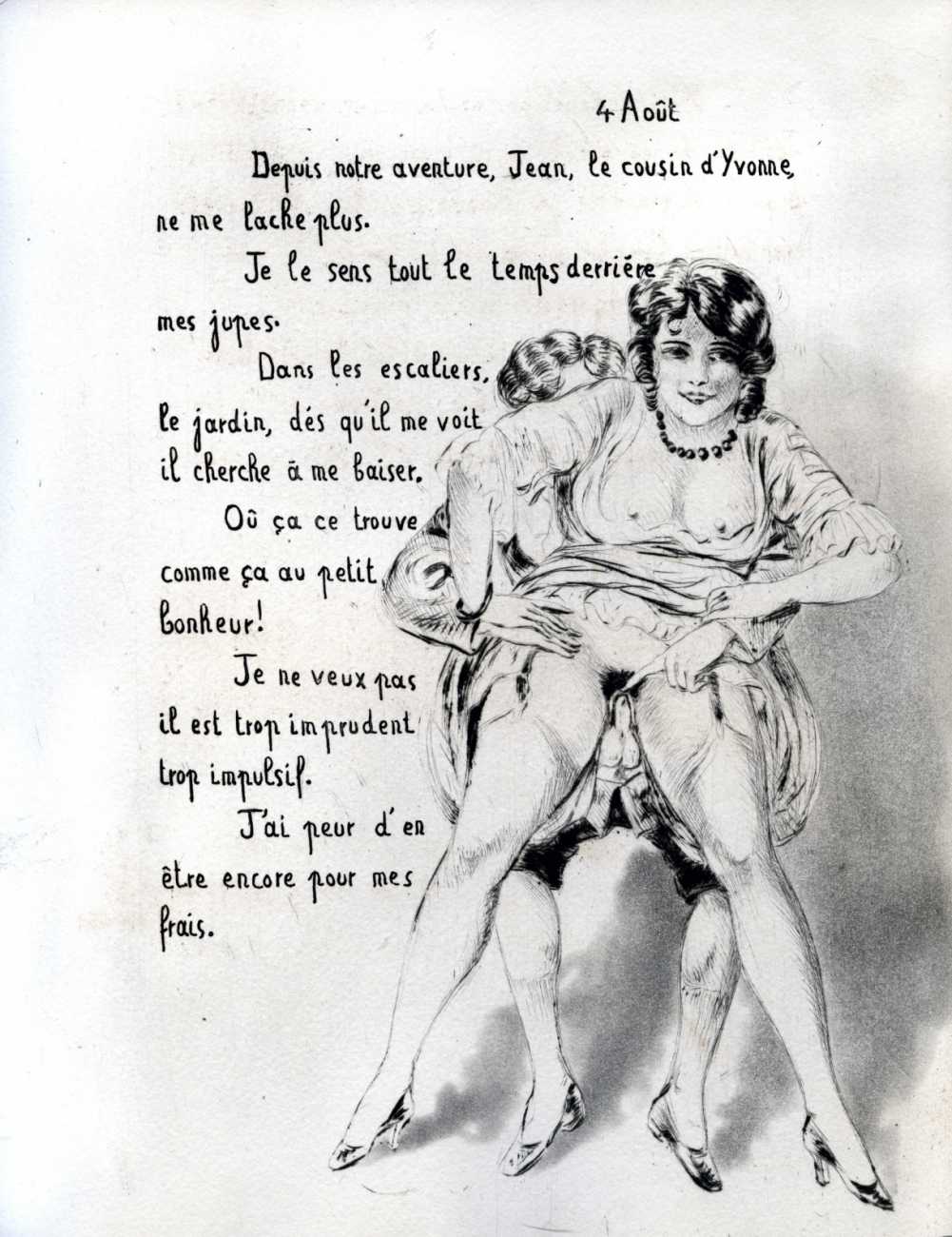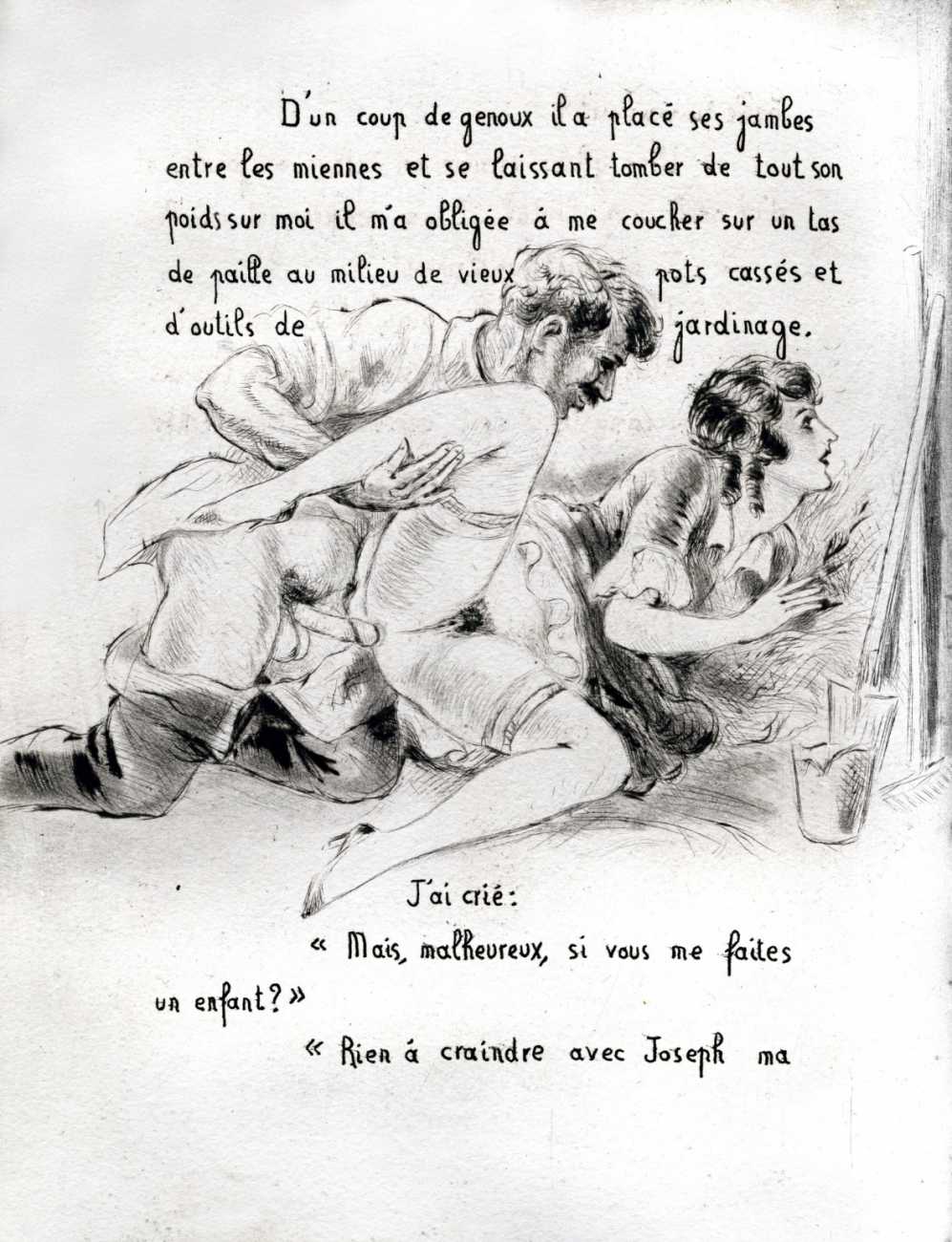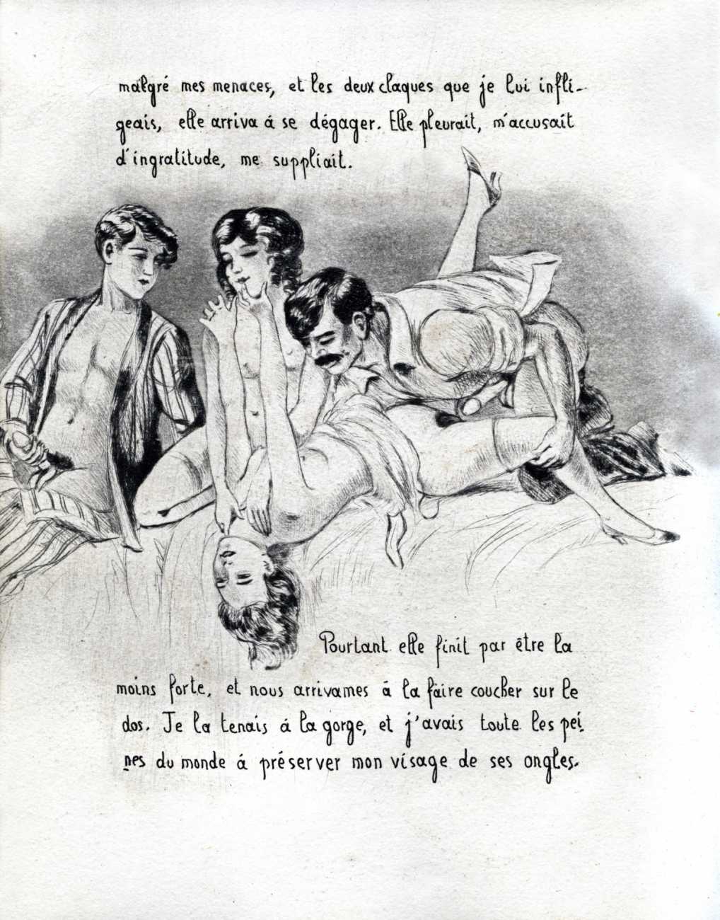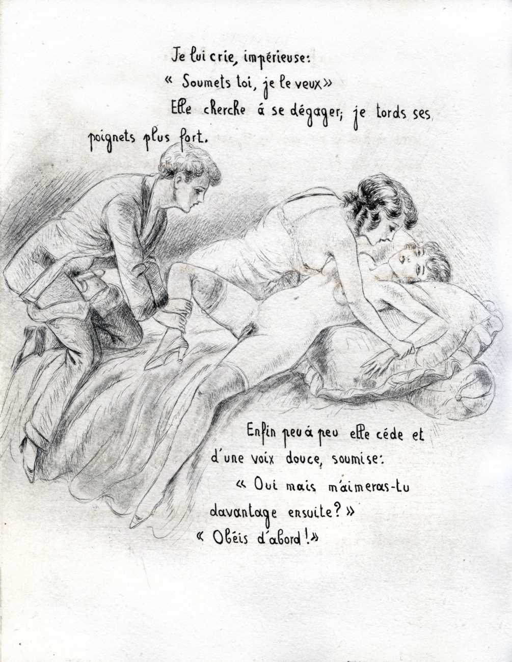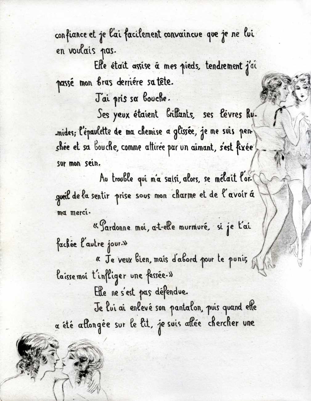 The first of Courbouleix’s Suzon volumes, published in 1935 under the imprint Aux dépens des amis de Cupidon (‘At the expense of the friends of Cupid’), was by far the best production, both for the quality of its illustrations and the spareness of its text. Suzon en vacances tells the story of Suzon visiting her friend Yvonne in the countryside one early August, and meeting Yvonne’s cousins Jeannette and Jean. It describes in poetic detail the sexual awakening they experience together, with the added assistance of the gardener Joseph.