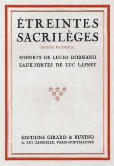 Étreintes sacrilèges contains twelve sonnets, each of which is illustrated by Lafnet in a tightly-composed etching including the poem’s title; the illustrations show Lafnet at the height of his skills, and while Dornano’s poems are not of a particularly high calibre Lafnet’s engravings most certainly are.