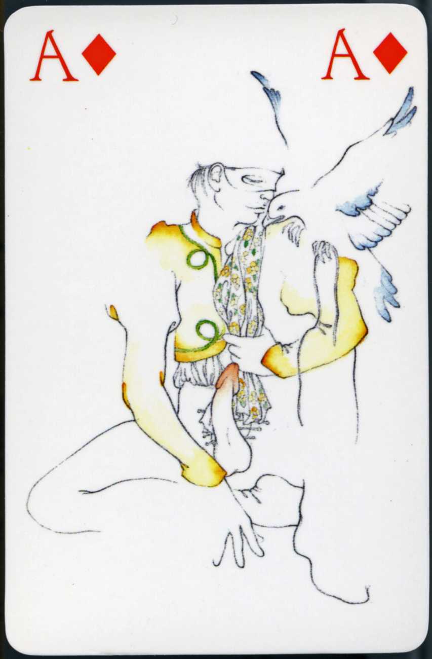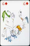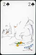 Several of the images are repeated on different low value cards, though the royal cards are all different; all depict Guevara’s trademark powerful, sparsely-coloured figures in an impressive array of pair and group sexual activities.