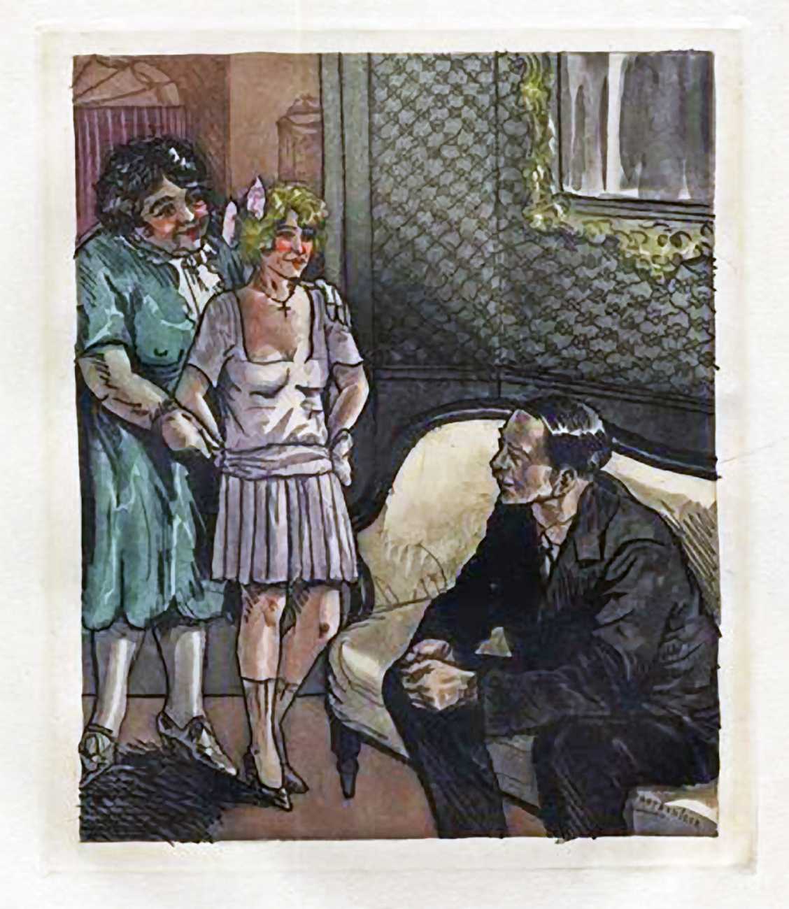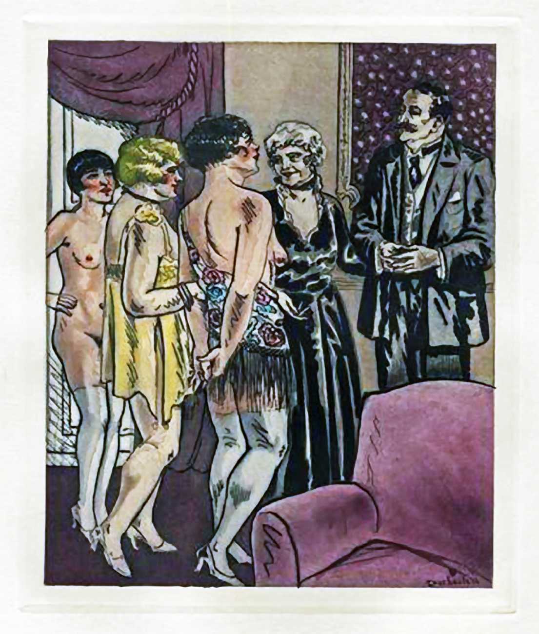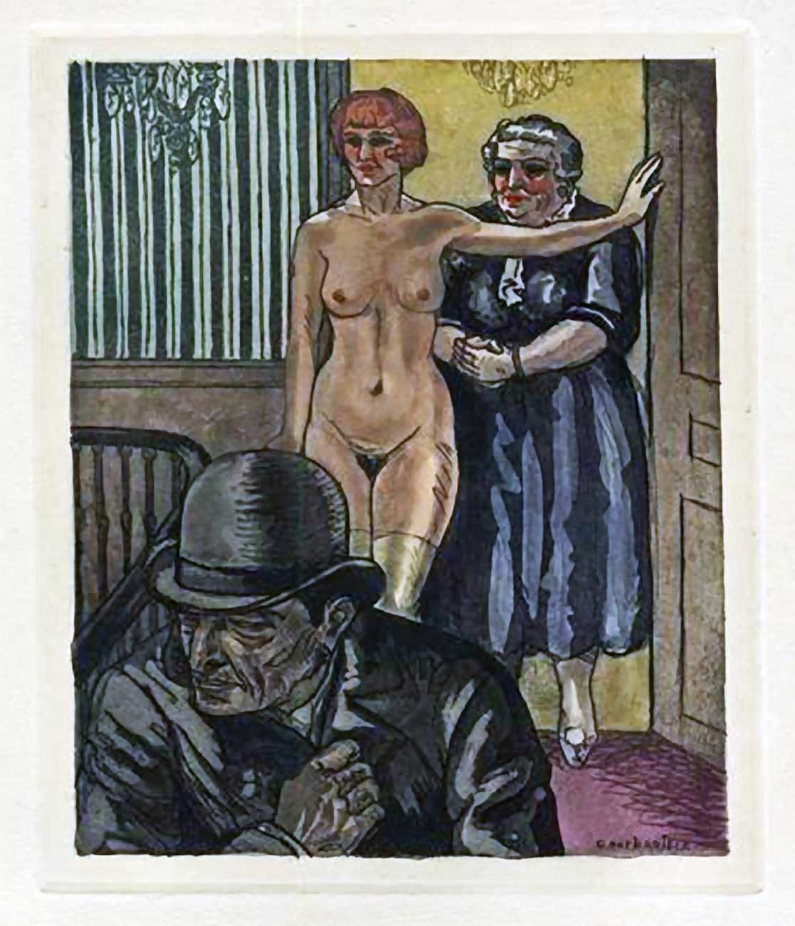 Early in 1929 Léon Courbouleix was commissioned by Mitton’s publishing house Art de l’intermédiaire du bibliophile to provide a set of illustrations of Parisian prostitutes to accompany a text by the writer and advocate Raymond Hesse (1884–1967). The result, Scenes from Houses of Illusion, contains fifteen of Courbouleix’s trademark images, showing him at his very best; our copy also includes two preparatory sketches.