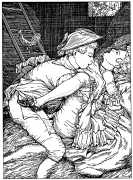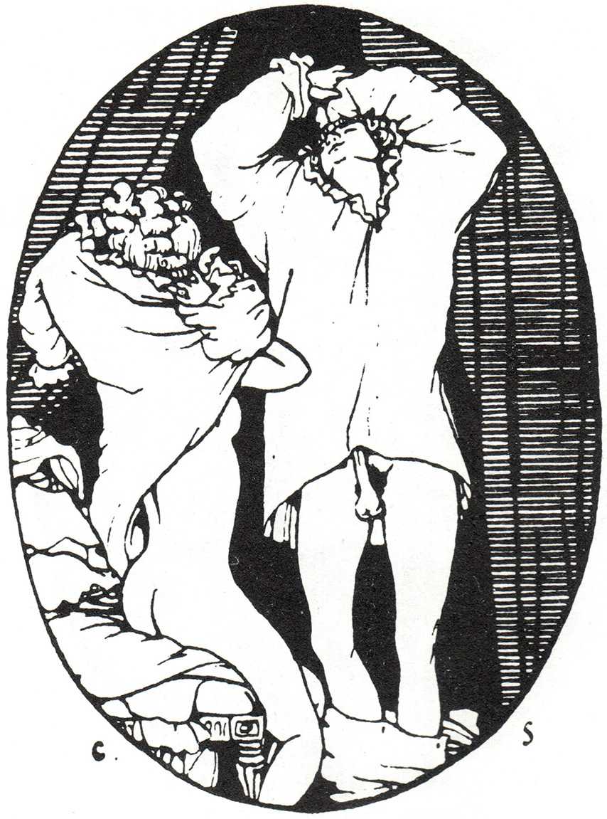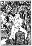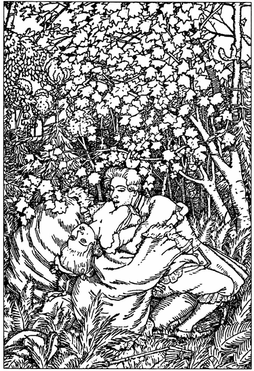 While more than twenty full plates and vignettes are unique to the ‘large’ Marquise, a handful of images appear in all three versions illustrated by Somov, most often repeating themselves between the two French versions. In the ‘large’ version Somov essentially undresses the figures in his ‘small’ version, exposing genitalia and graphically illustrating his subjects’ sexual interaction.