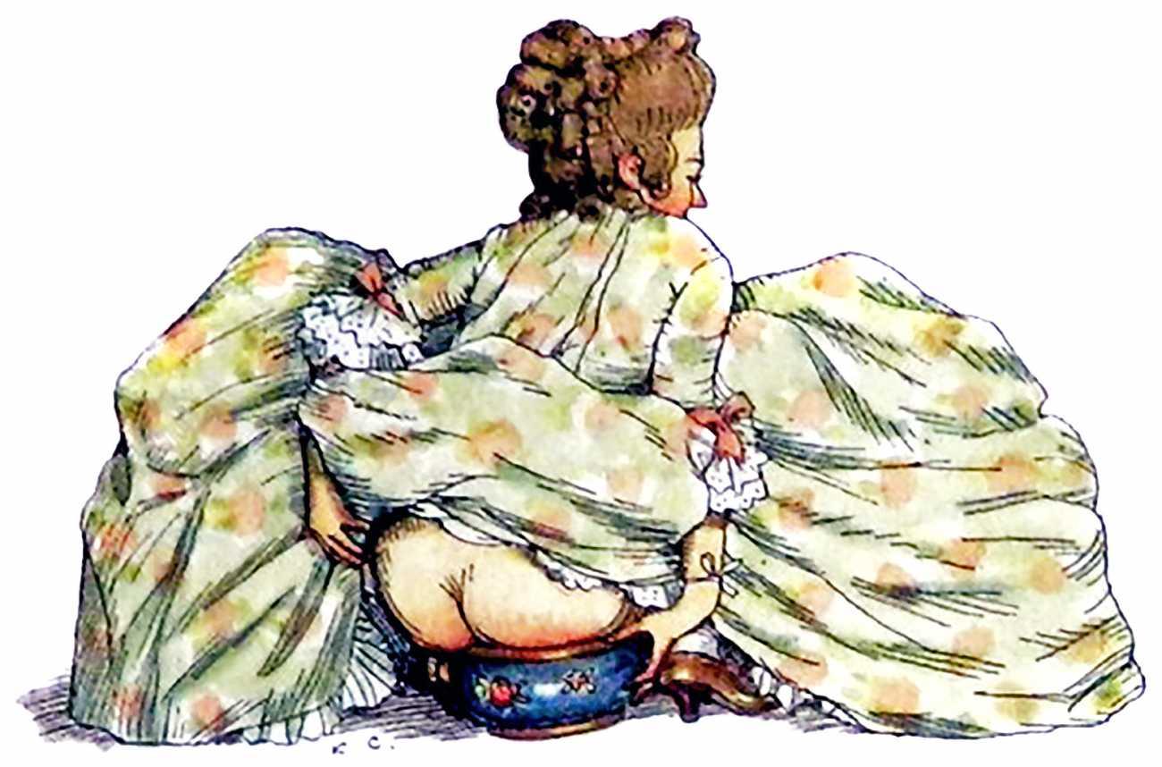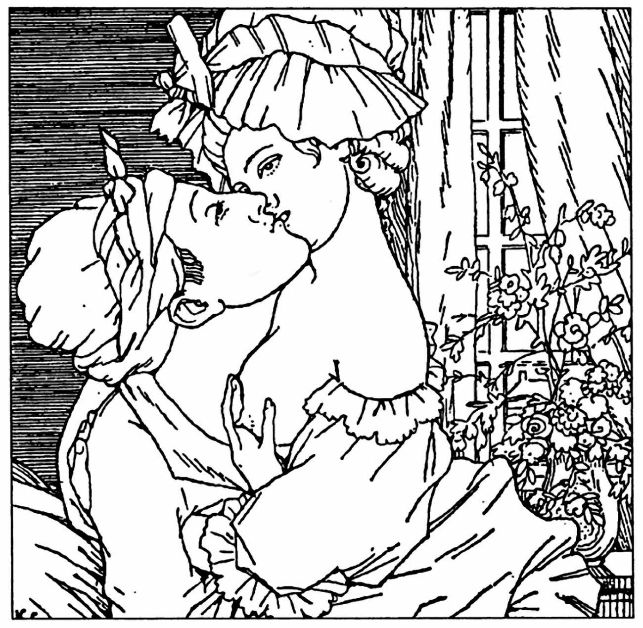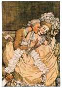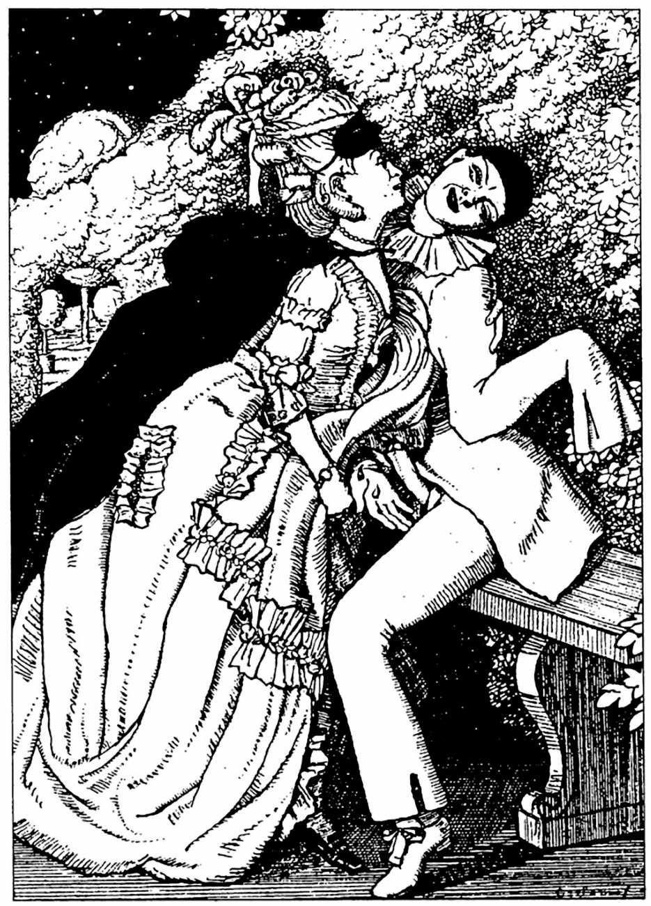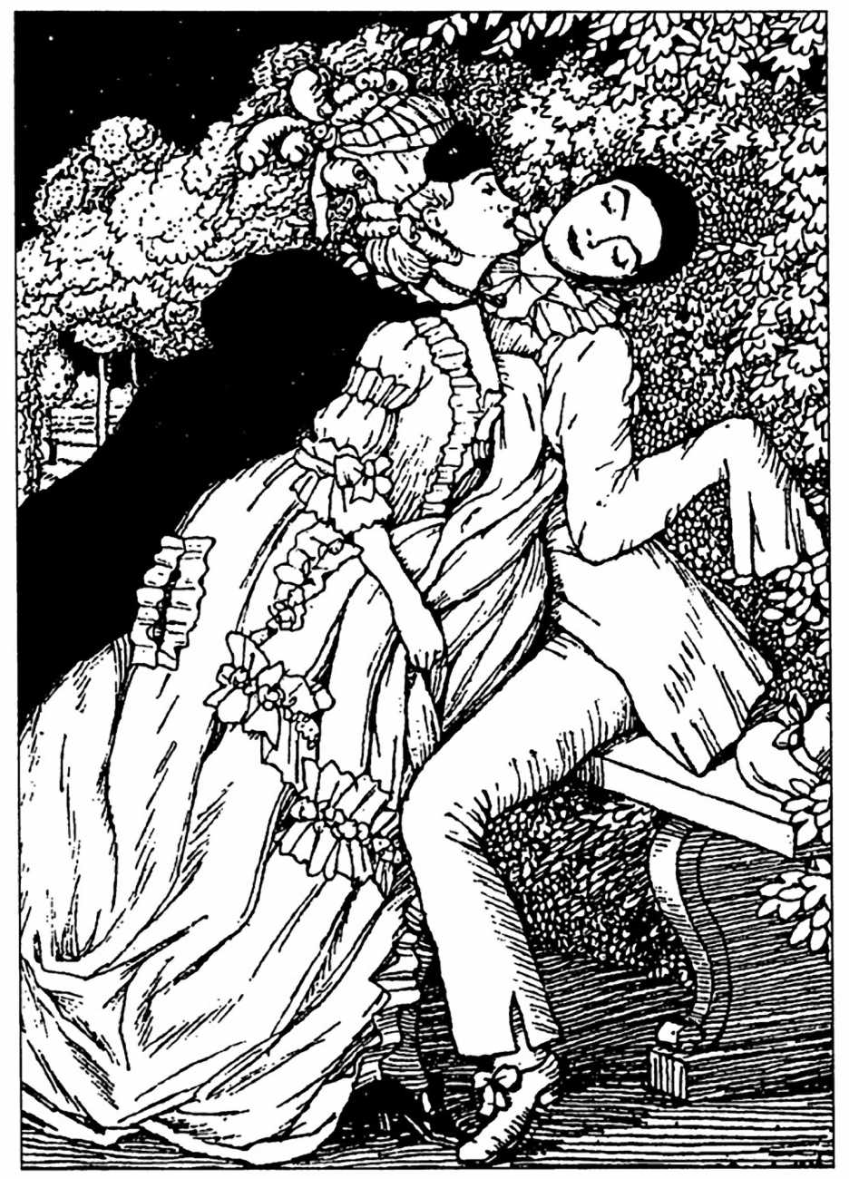 The first Somov-illustrated edition was published in German as Das Lesebuch der Marquise: Ein Rokokobuch, in a print run of 850 copies, and while the illustrations to this work exhibit Somov’s characteristic style and technique, the German Lesebuch may hardly be considered erotic.