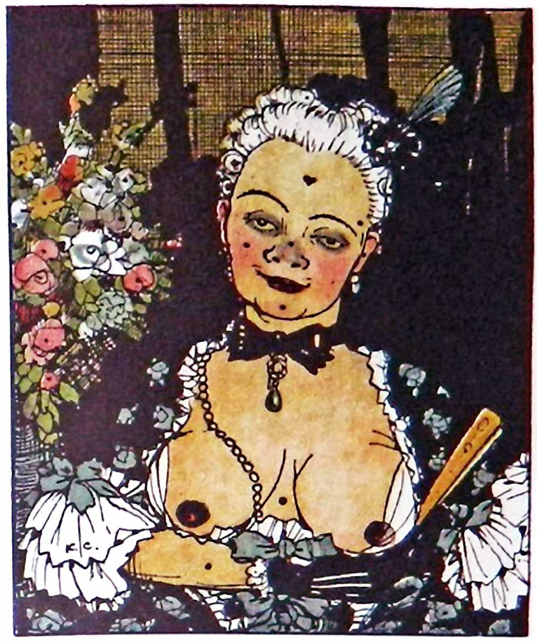The ‘large’ Marquise is also entitled Le livre de la Marquise: recueil de poésie & de prose and was produced in an edition of 800, but in order to circumvent Bolshevik censorship it bore the fanciful imprint ‘Venise, Chez Cazzo et Coglioni, 1918’. Many of its plates and vignettes are hand-coloured, and most are explicitly scatological and sexual.