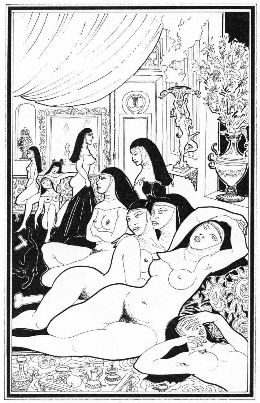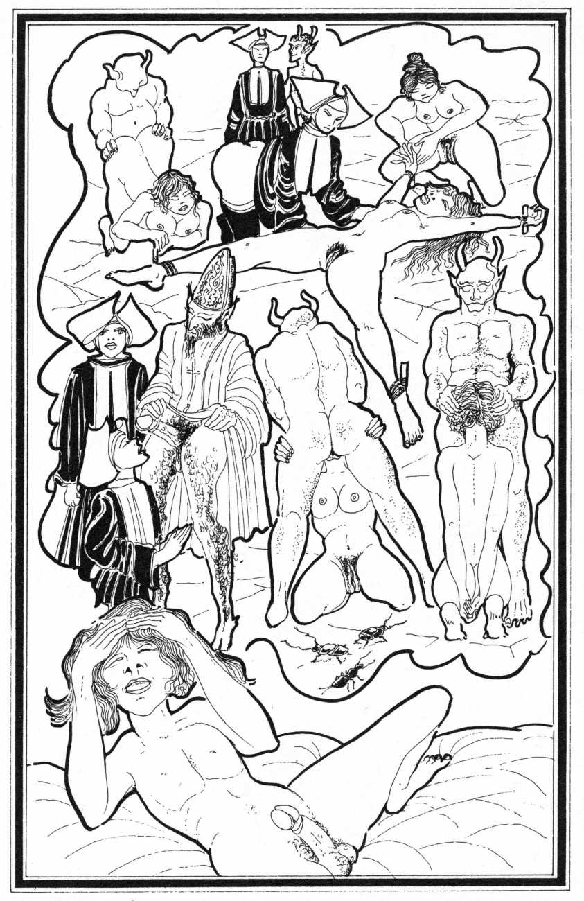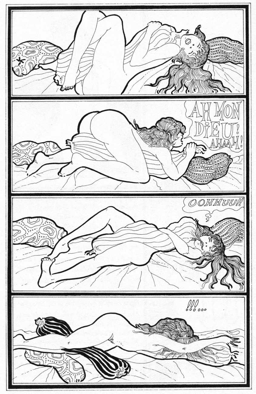 Gilbert Garnon’s comic strip (bande desinée) version of Gamiani has an introduction by French ecofeminist Françoise d’Eeaubonne, in which she describes Garnon’s work as ‘sinuous and earthy, with a black lyricism’. It is Garnon’s best work, extending to more than a hundred pages; here we show just a selection in which image take precedence over text.