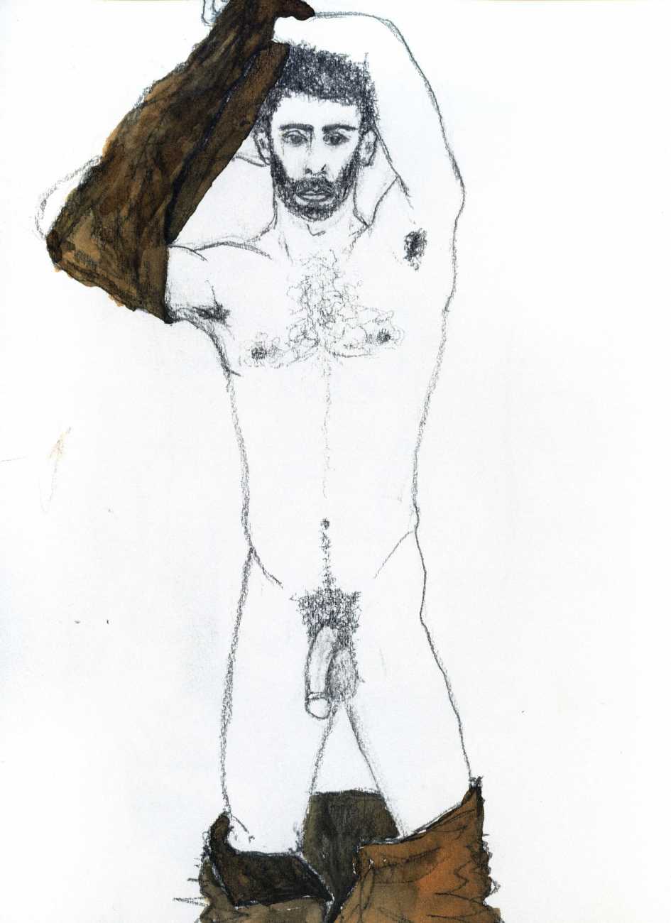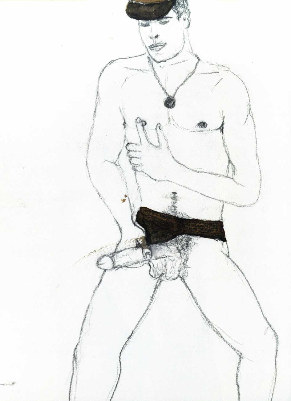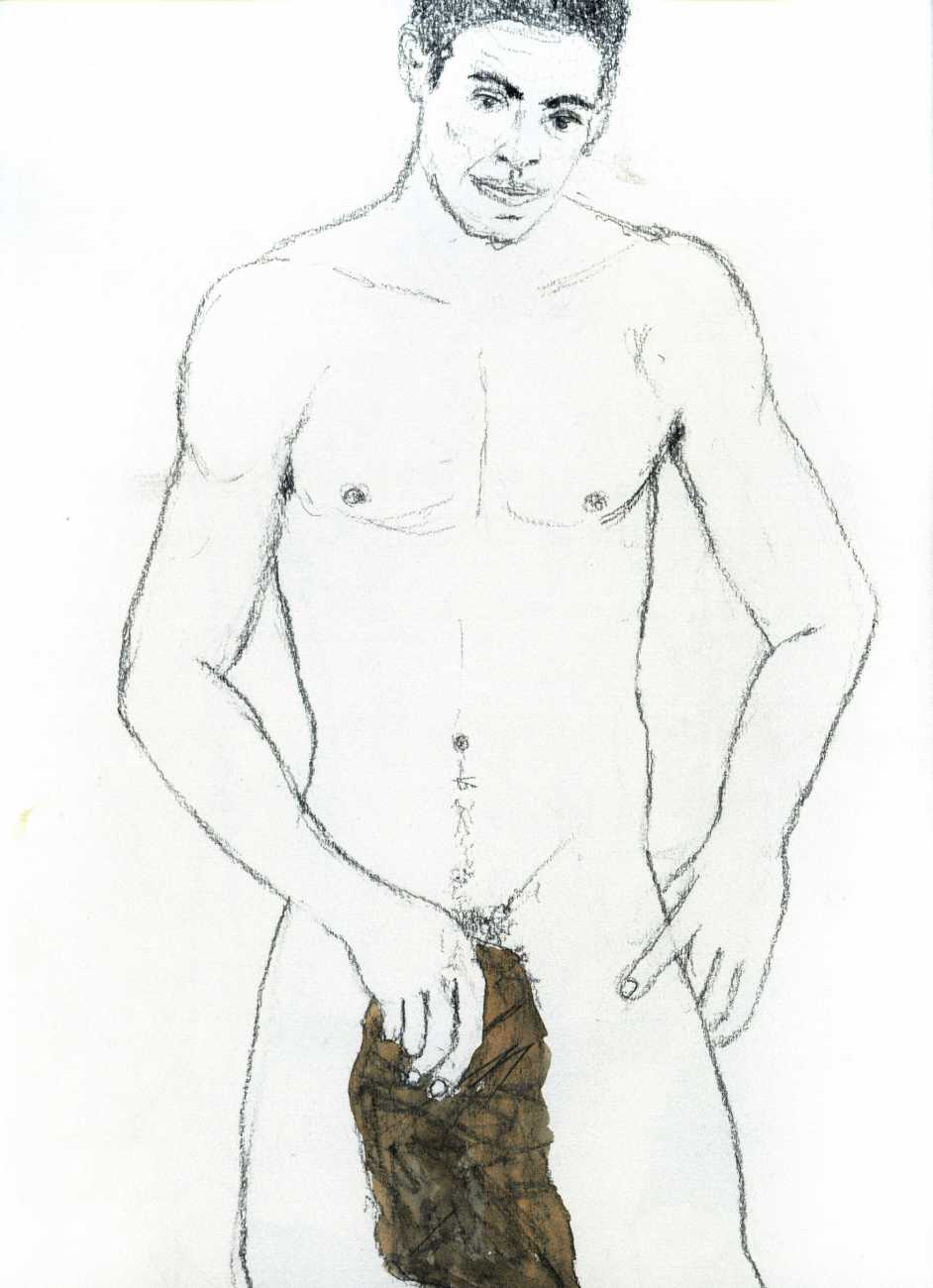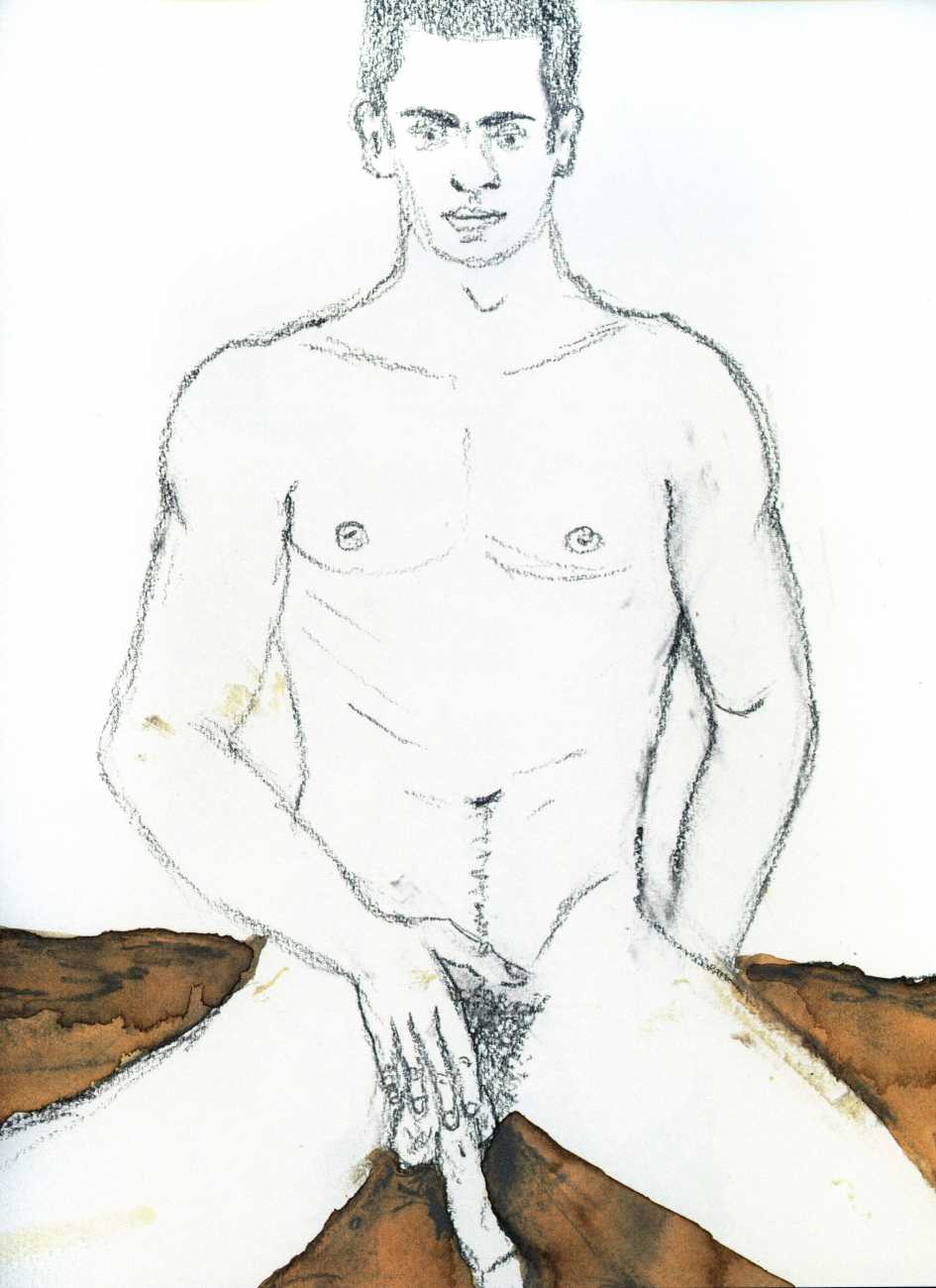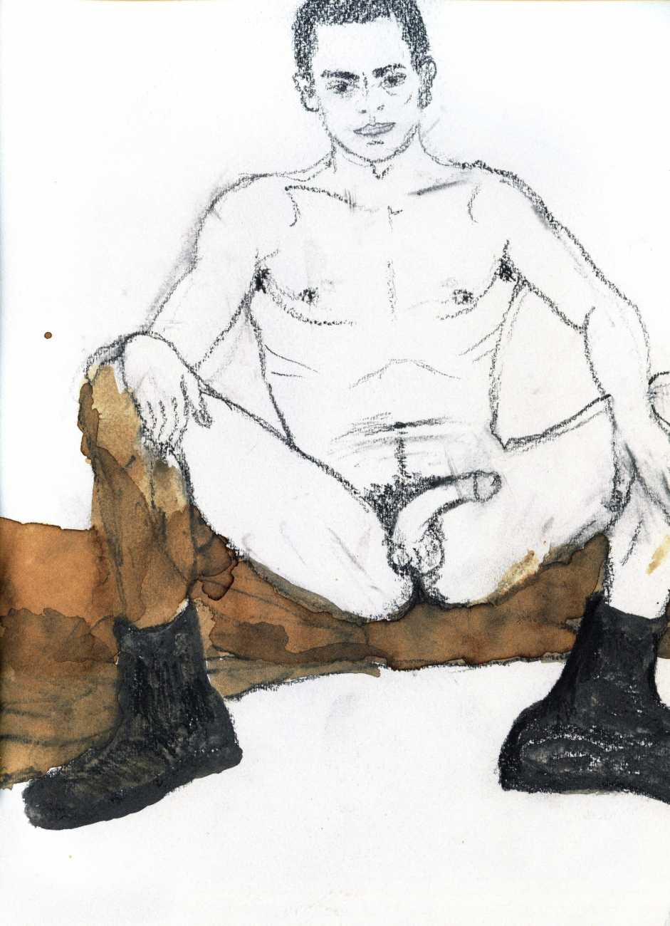 From 1984 until 2011 Dieter Hall lived in New York, and still shares his time between Switzerland and the USA. In 2002 he worked almost exclusively on a series of drawings of young men in various states of undress and arousal, in his hallmark style of showing them full frontal, warts and all. He called this portfolio his ‘coffee drawings’, as he experimented with using coffee as a watercolour medium to highlight the pencil drawings.