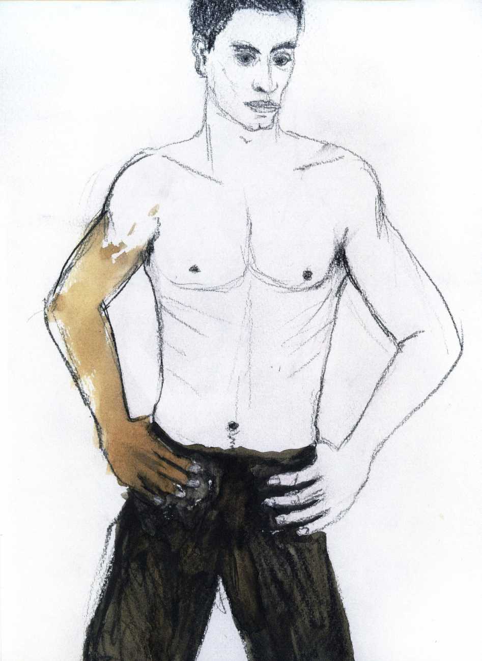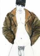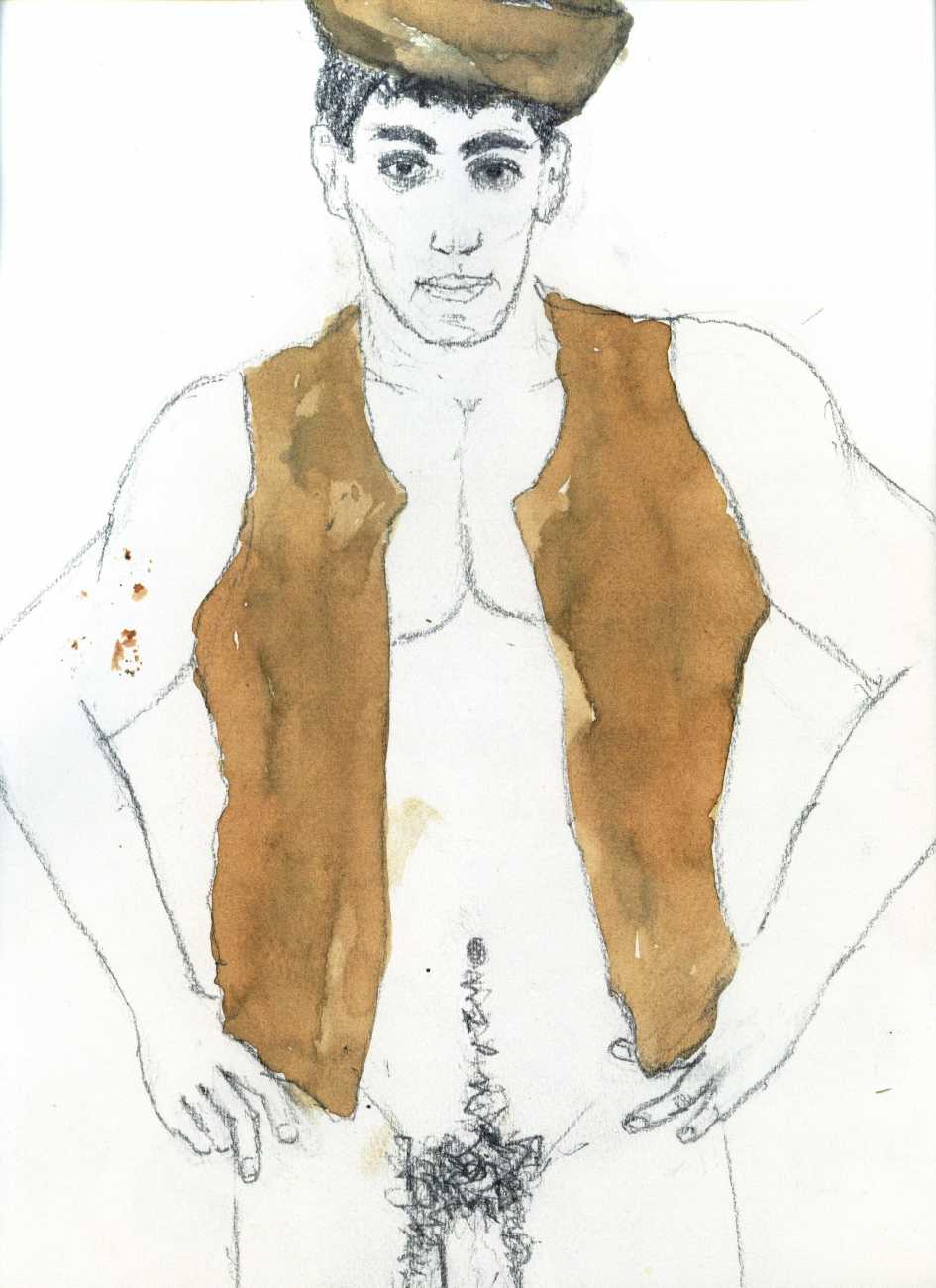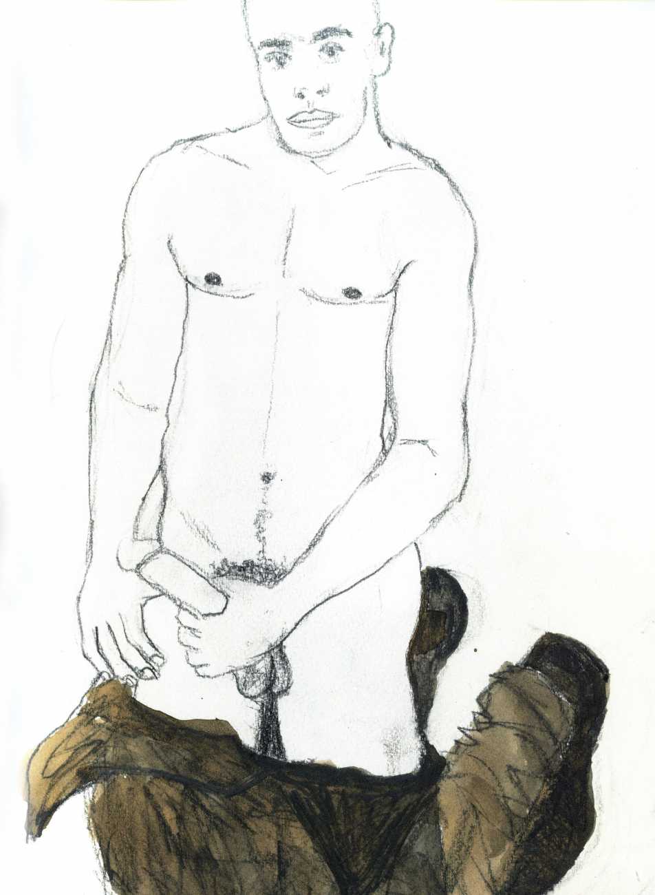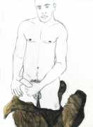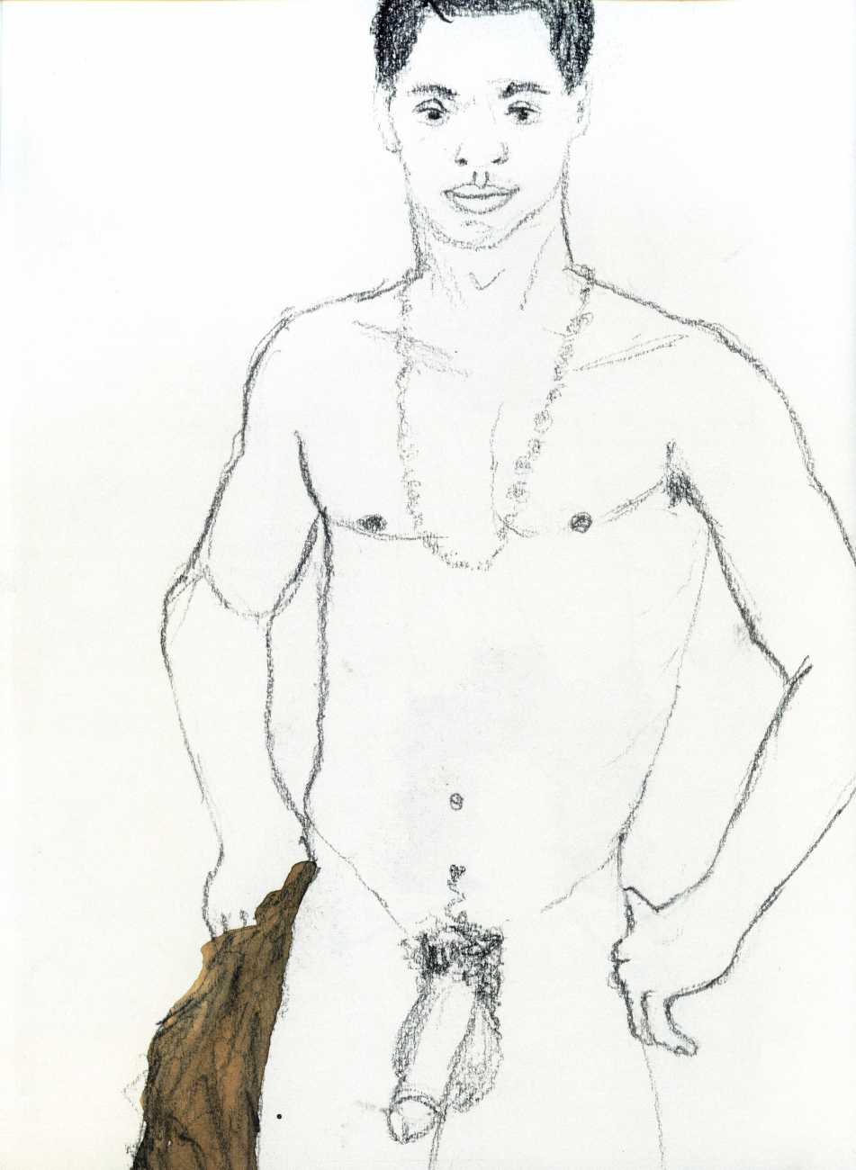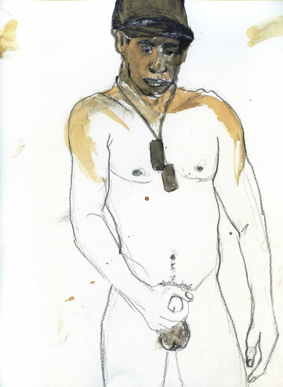From 1984 until 2011 Dieter Hall lived in New York, and still shares his time between Switzerland and the USA. In 2002 he worked almost exclusively on a series of drawings of young men in various states of undress and arousal, in his hallmark style of showing them full frontal, warts and all. He called this portfolio his ‘coffee drawings’, as he experimented with using coffee as a watercolour medium to highlight the pencil drawings.