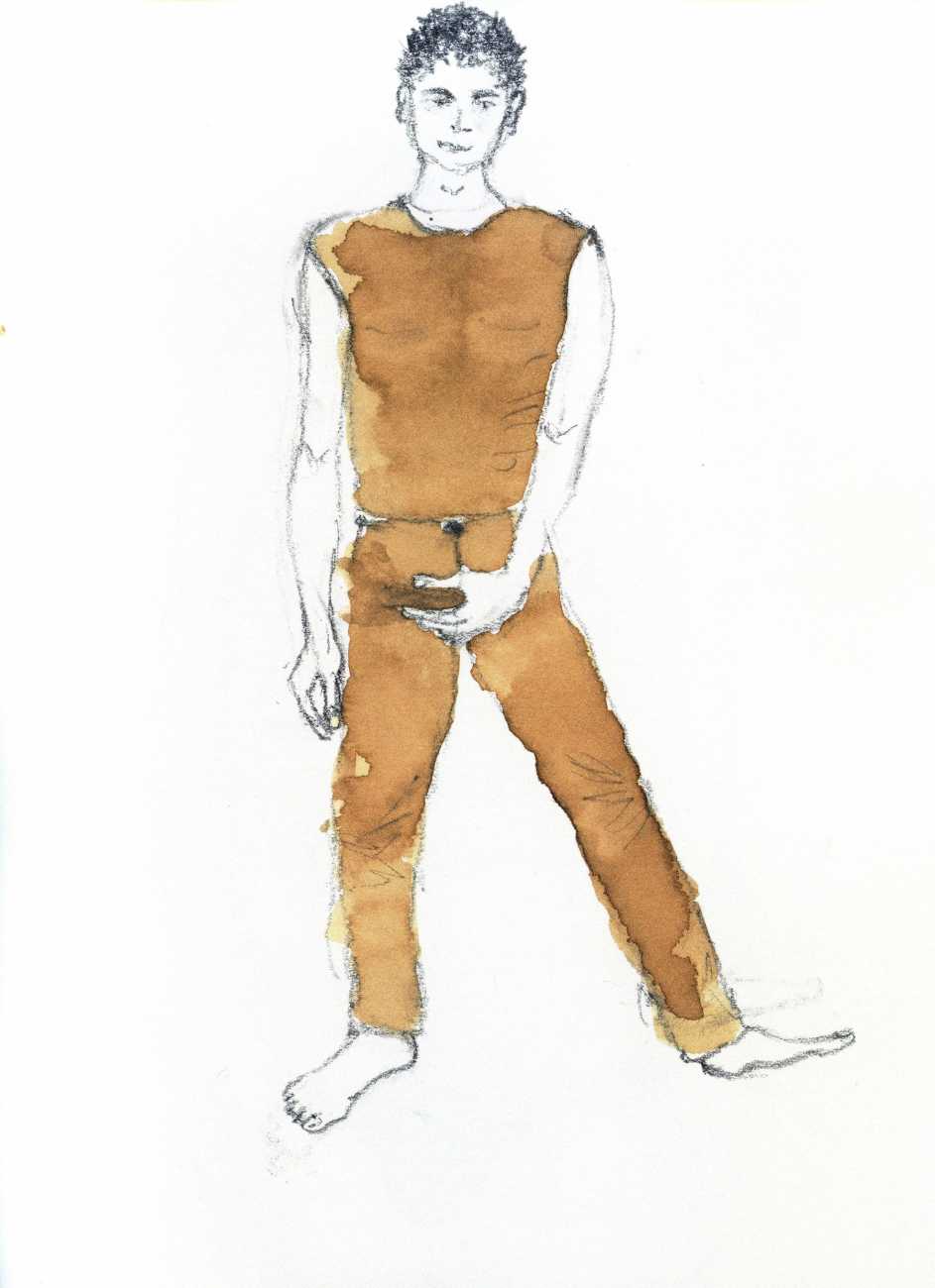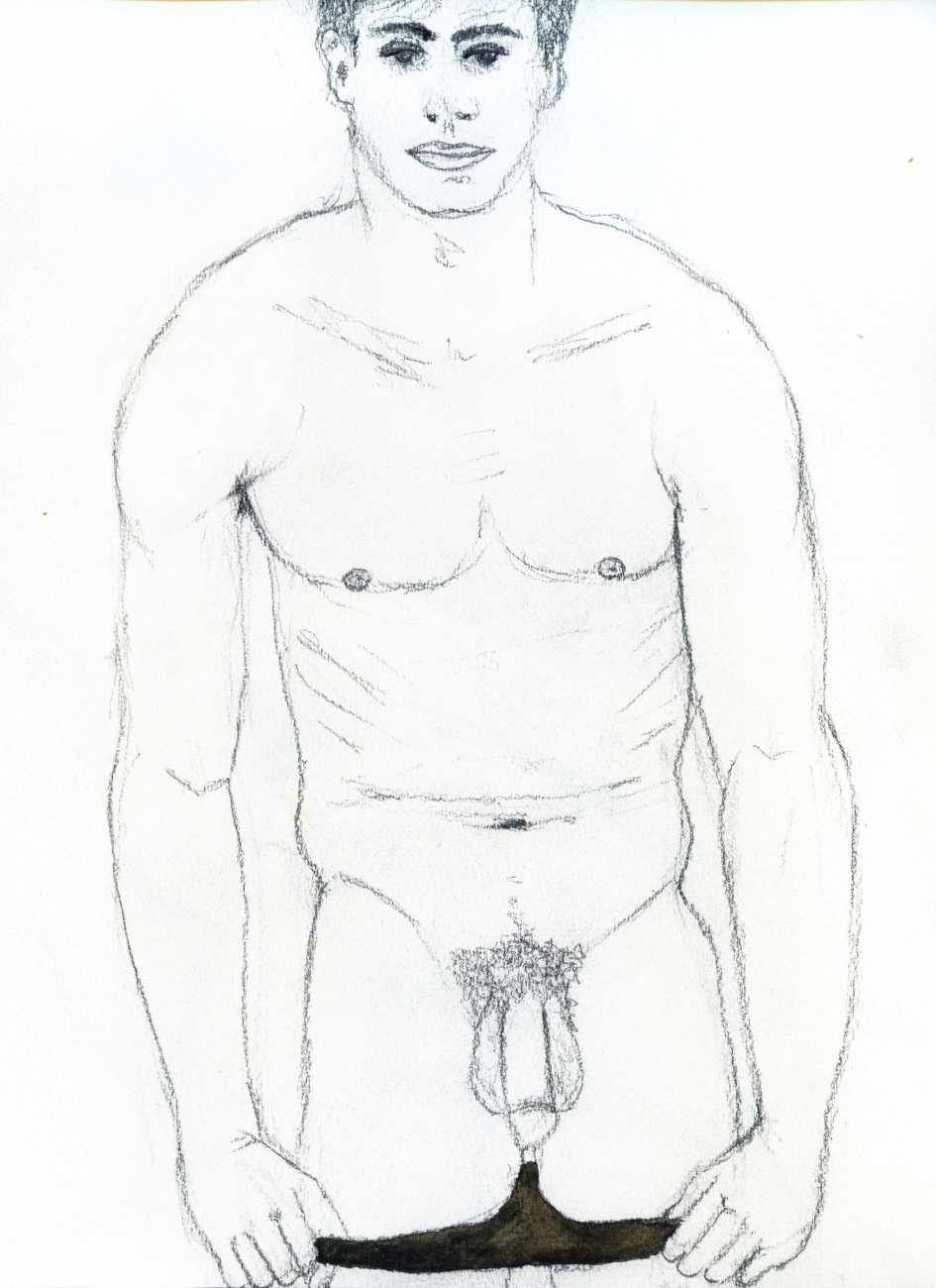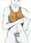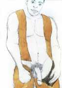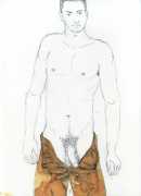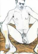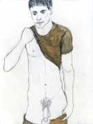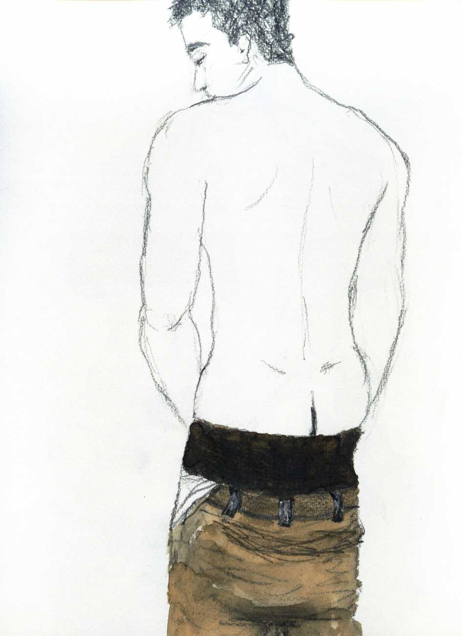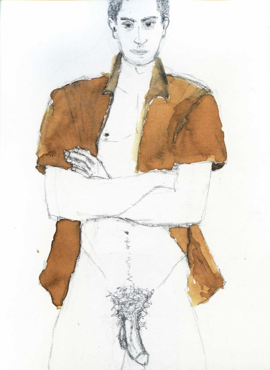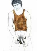 From 1984 until 2011 Dieter Hall lived in New York, and still shares his time between Switzerland and the USA. In 2002 he worked almost exclusively on a series of drawings of young men in various states of undress and arousal, in his hallmark style of showing them full frontal, warts and all. He called this portfolio his ‘coffee drawings’, as he experimented with using coffee as a watercolour medium to highlight the pencil drawings.