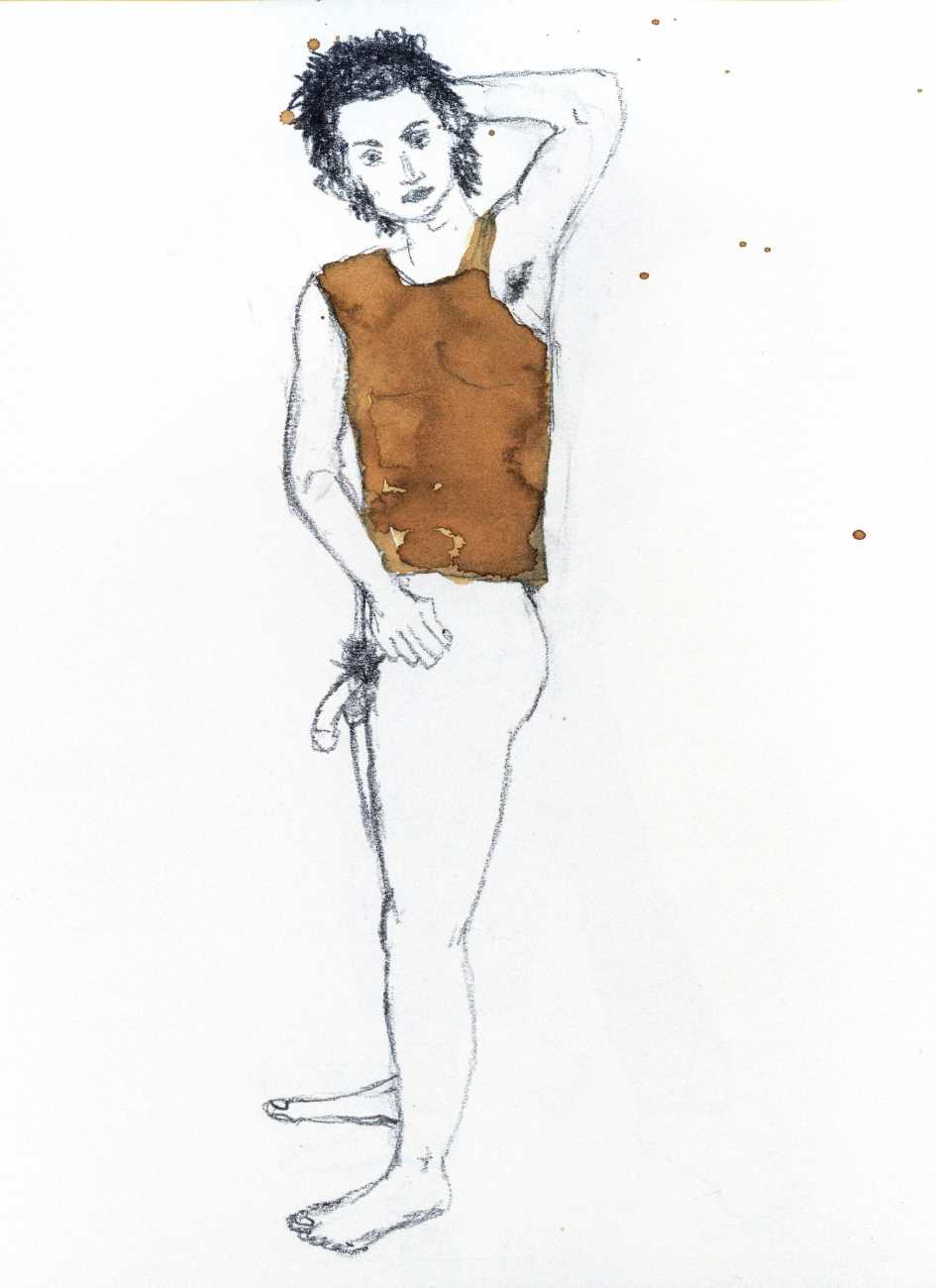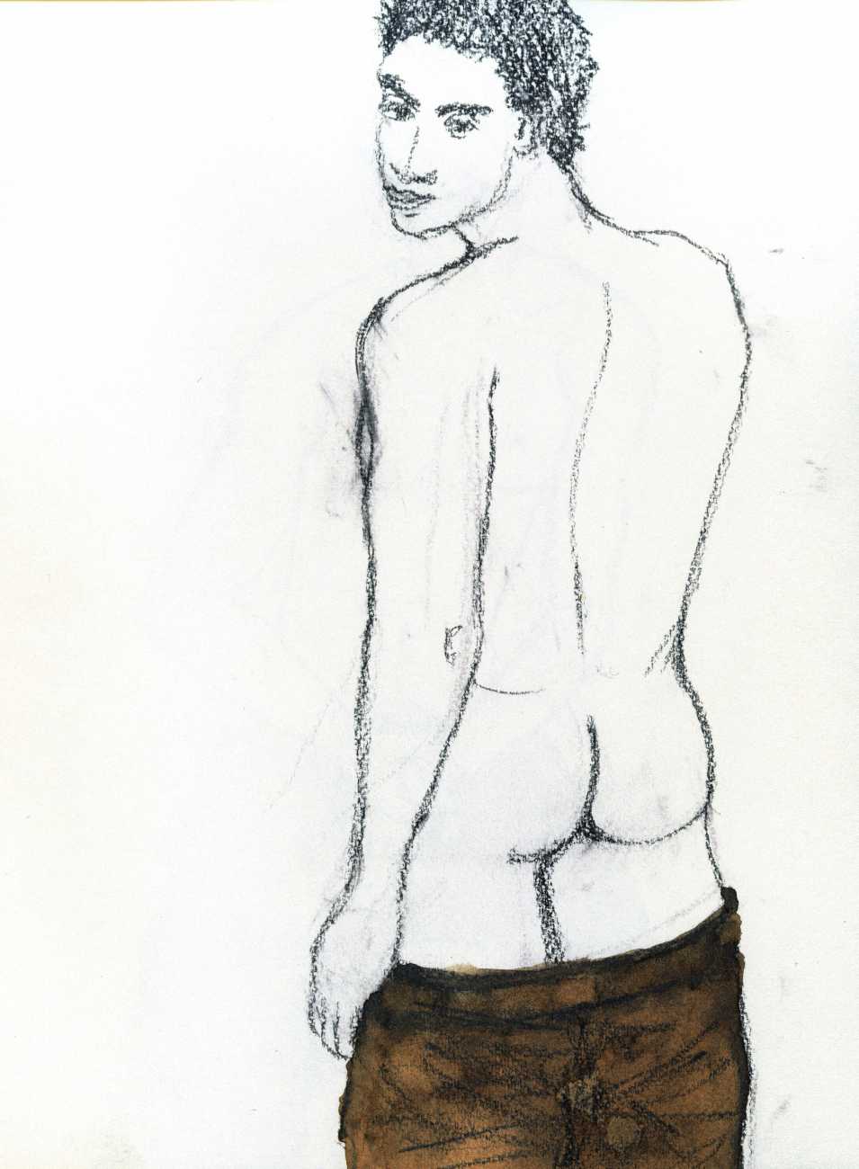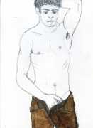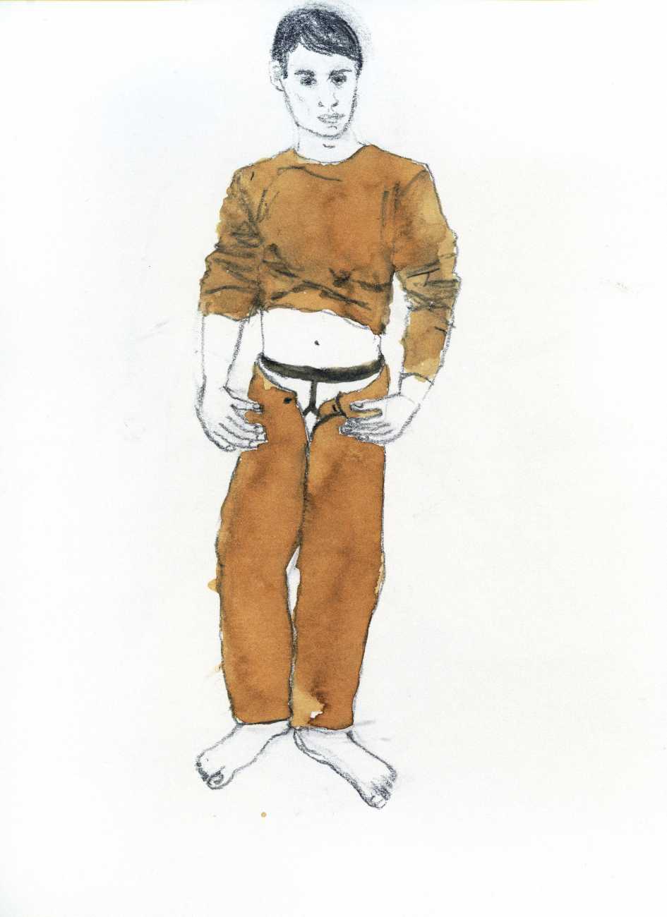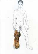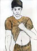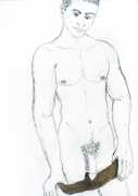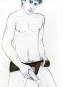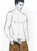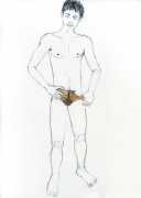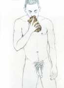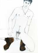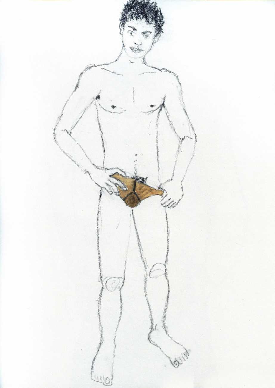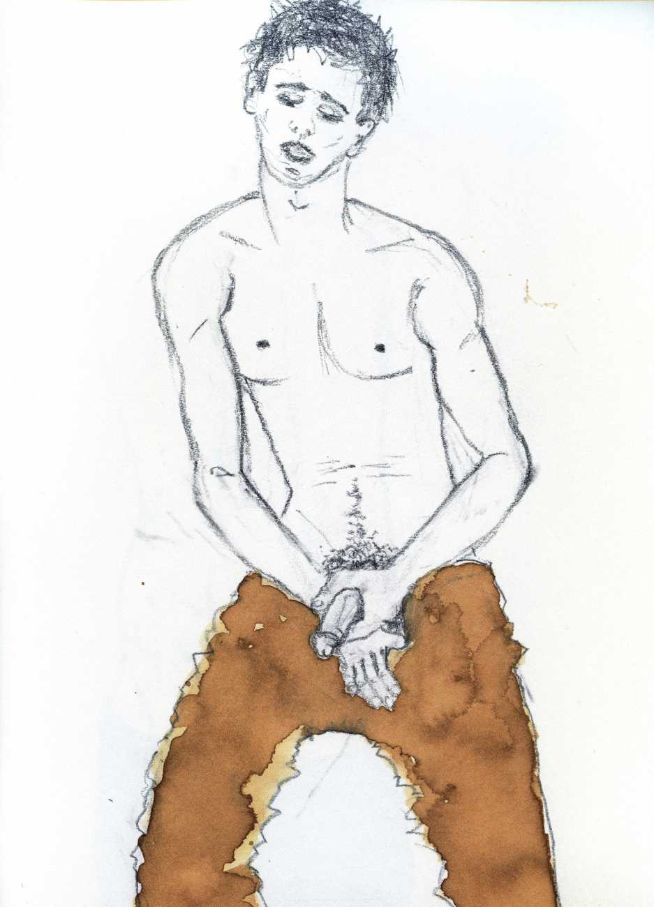 From 1984 until 2011 Dieter Hall lived in New York, and still shares his time between Switzerland and the USA. In 2002 he worked almost exclusively on a series of drawings of young men in various states of undress and arousal, in his hallmark style of showing them full frontal, warts and all. He called this portfolio his ‘coffee drawings’, as he experimented with using coffee as a watercolour medium to highlight the pencil drawings.