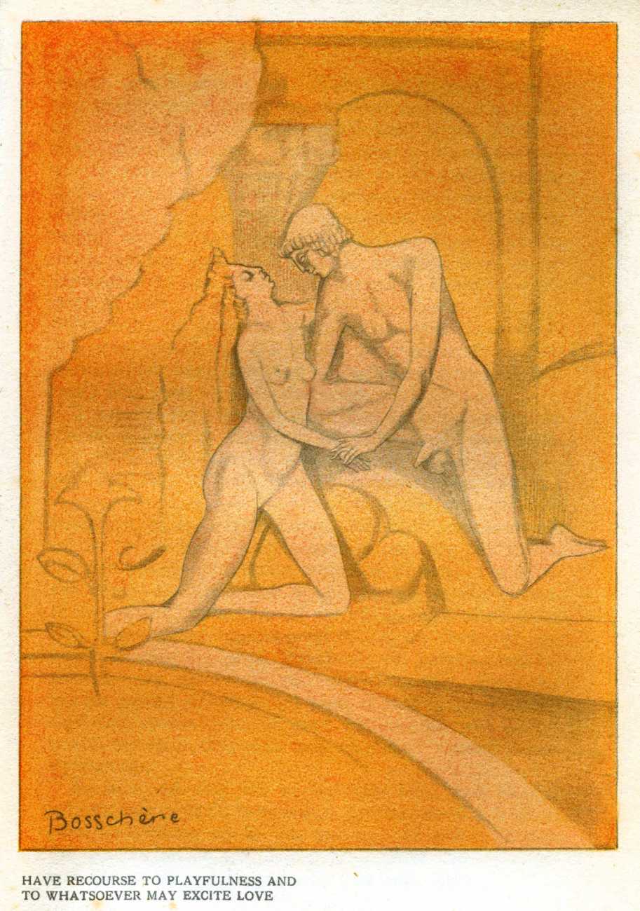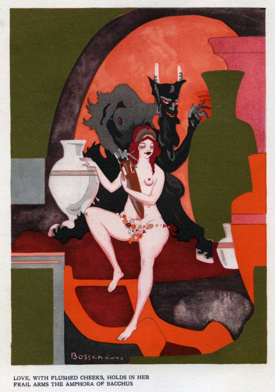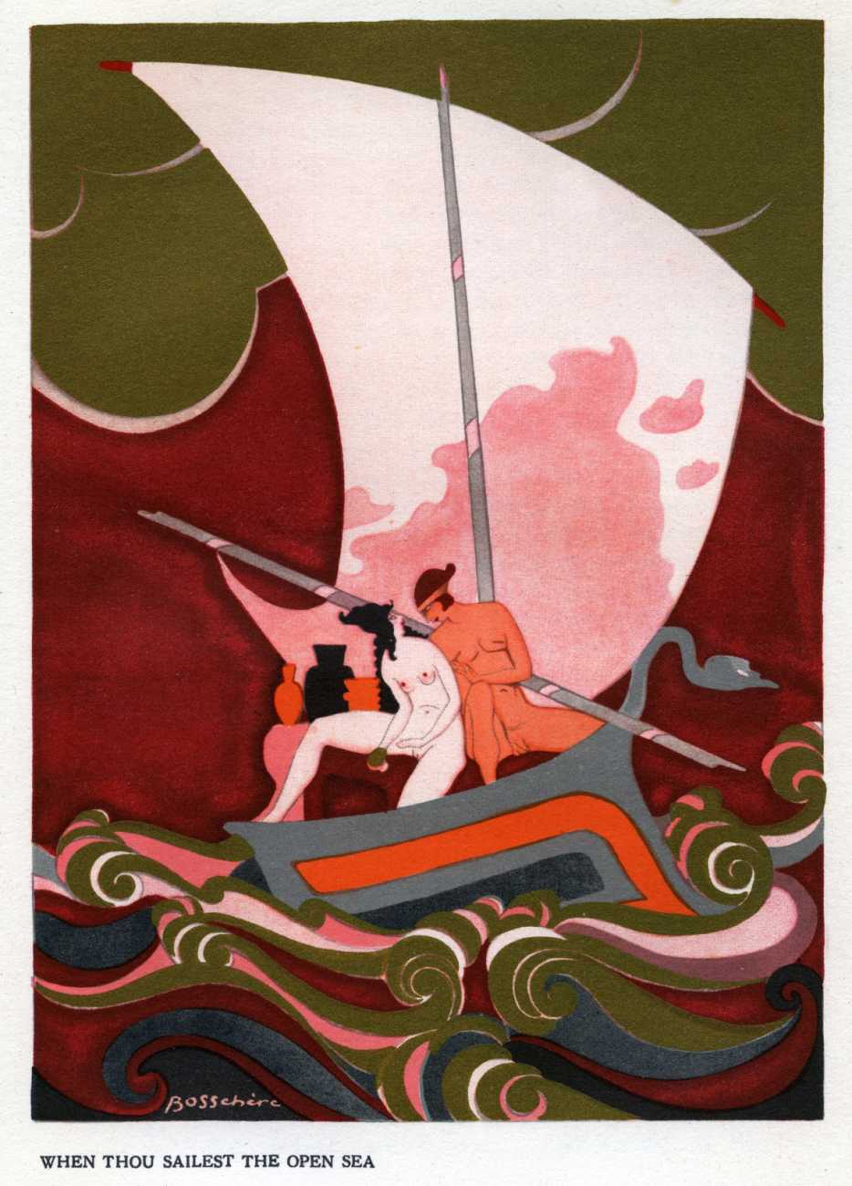 The Love Books of Ovid is a compilation of four books of the Roman poet’s verse translated into prose by Julian Lewis May. The Bosschère-illustrated Bodley Head volume includes ‘Amores’ (The Loves), ‘Ars Amatoria’ (The Art of Love), ‘Remedia Amoris’ (Love’s Cure), and ‘Medicamina Faciei Feminae’ (The Art of Female Beauty). Ovid never intended his poems to be taken very seriously, and his advice to young men and women about how to find a satisfactory lover is as tongue-in-cheek and impractical as much sexual advice today.