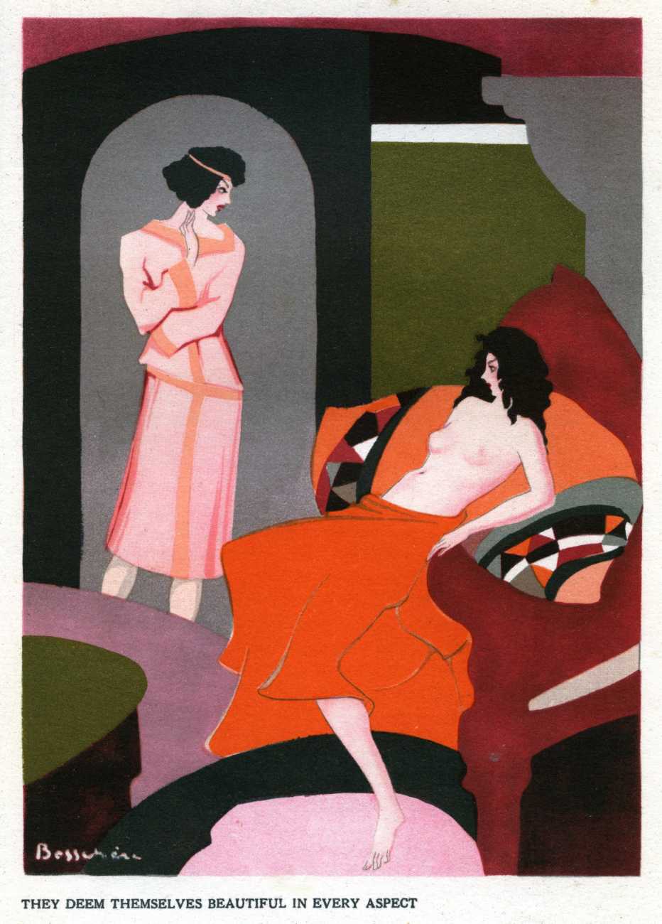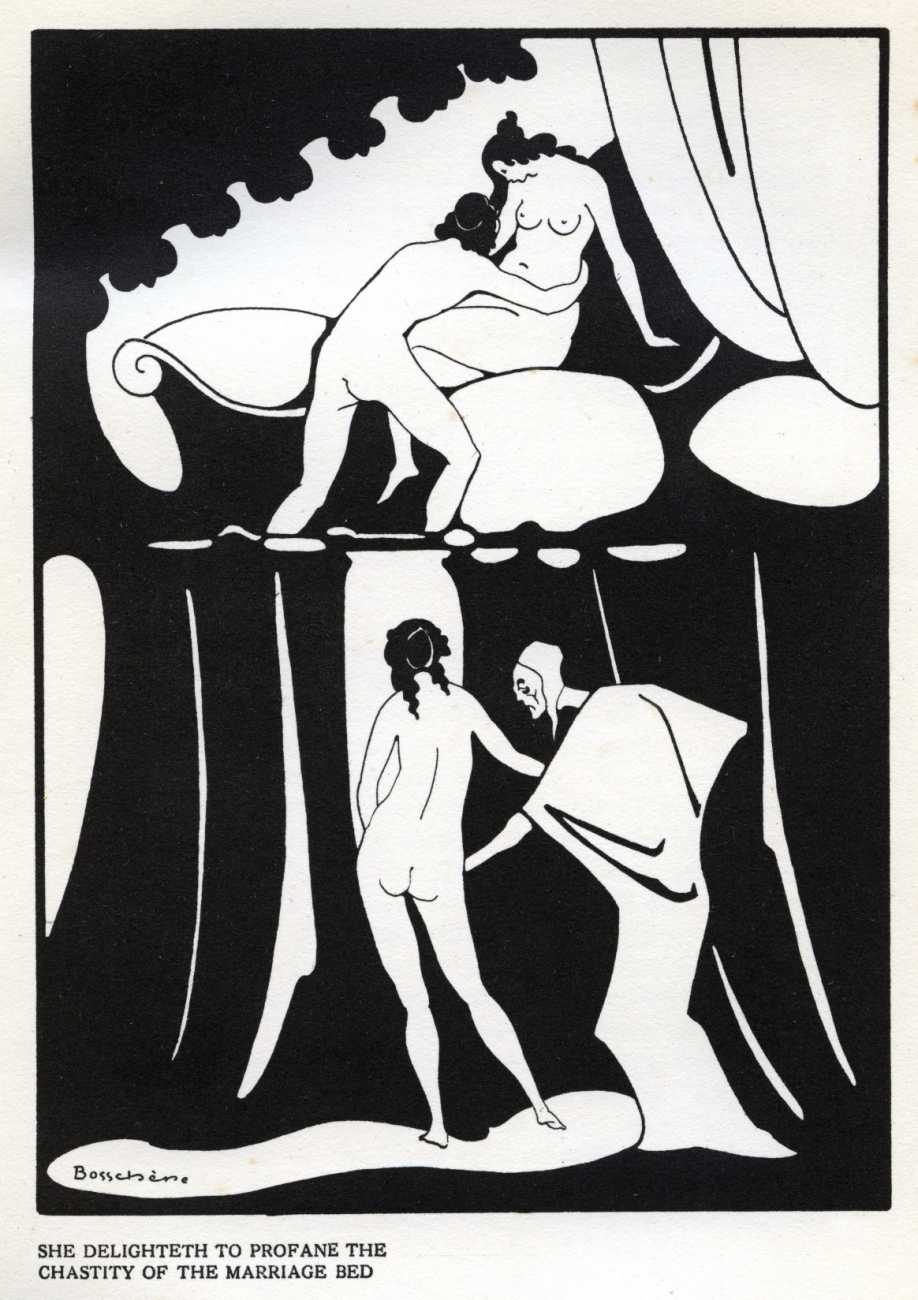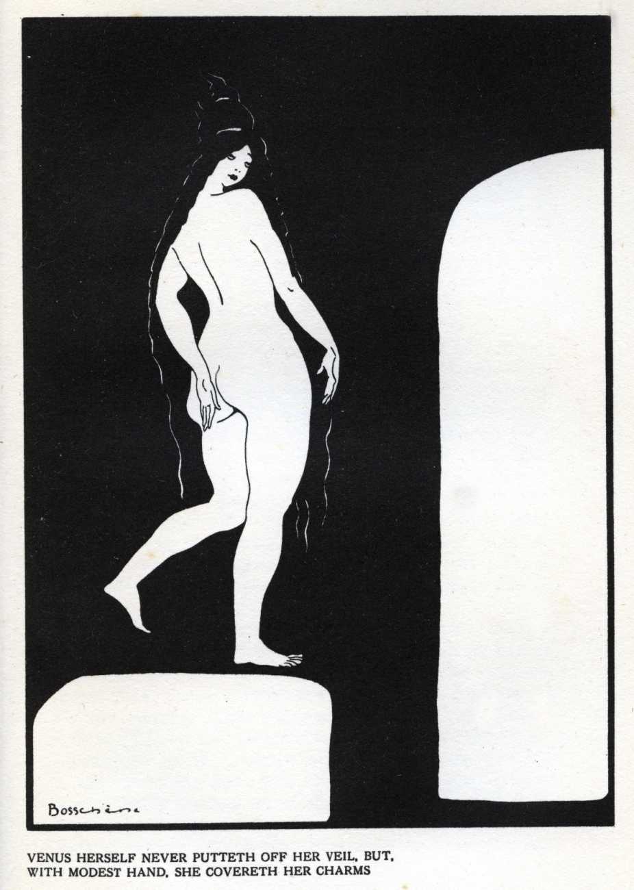 The Love Books of Ovid is a compilation of four books of the Roman poet’s verse translated into prose by Julian Lewis May. The Bosschère-illustrated Bodley Head volume includes ‘Amores’ (The Loves), ‘Ars Amatoria’ (The Art of Love), ‘Remedia Amoris’ (Love’s Cure), and ‘Medicamina Faciei Feminae’ (The Art of Female Beauty). Ovid never intended his poems to be taken very seriously, and his advice to young men and women about how to find a satisfactory lover is as tongue-in-cheek and impractical as much sexual advice today.