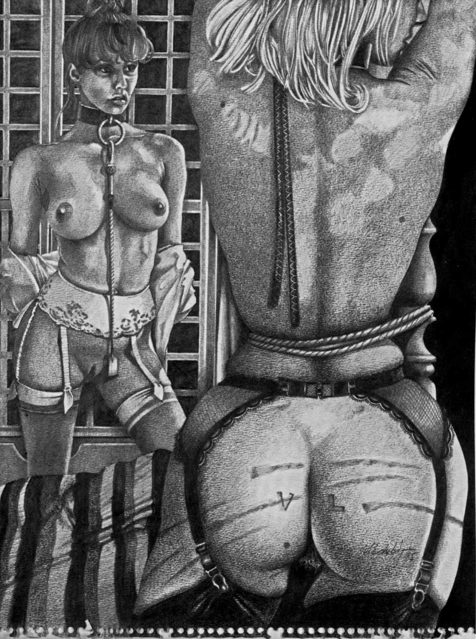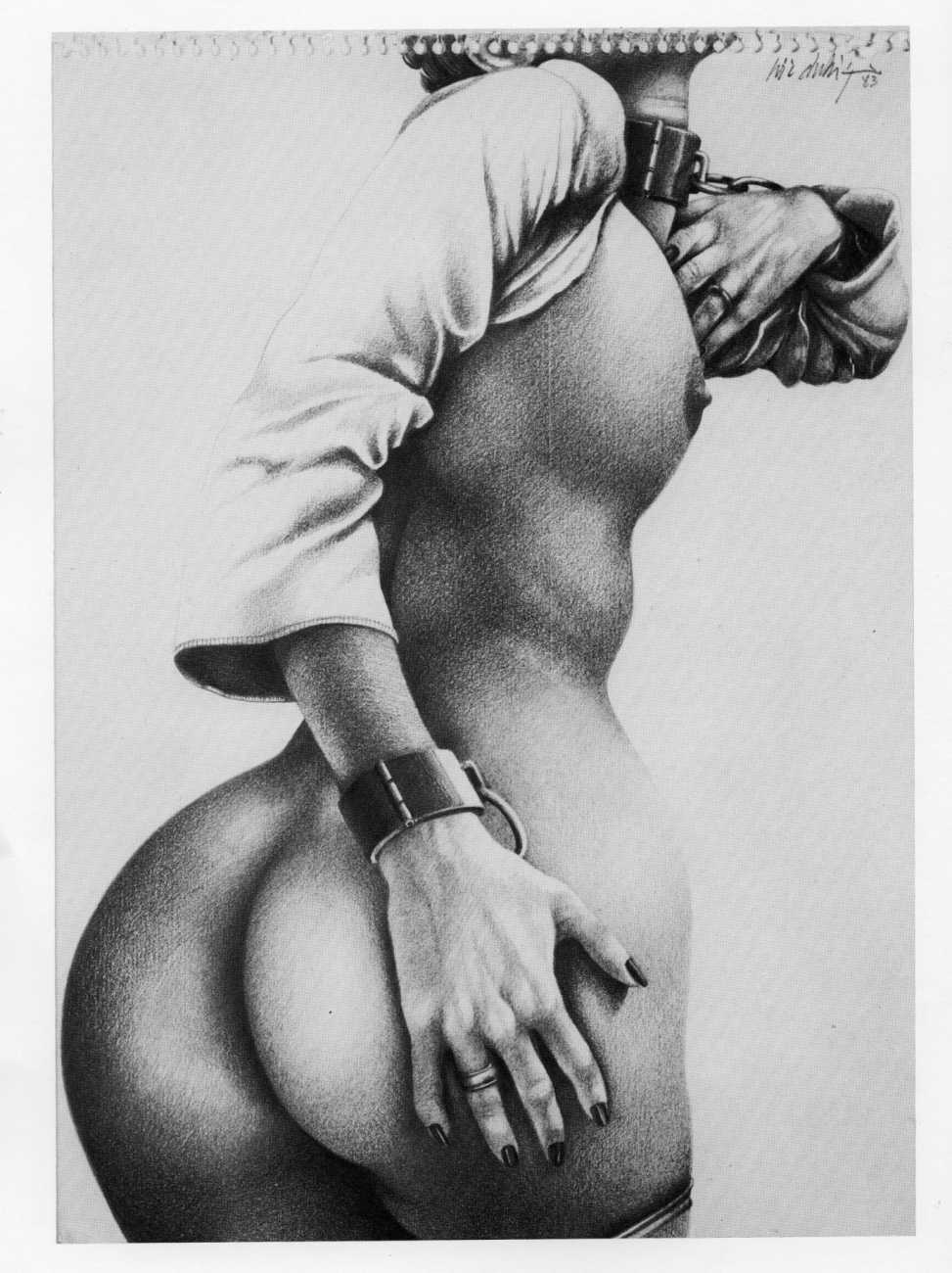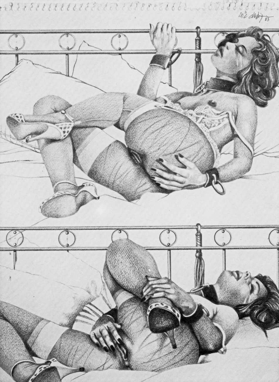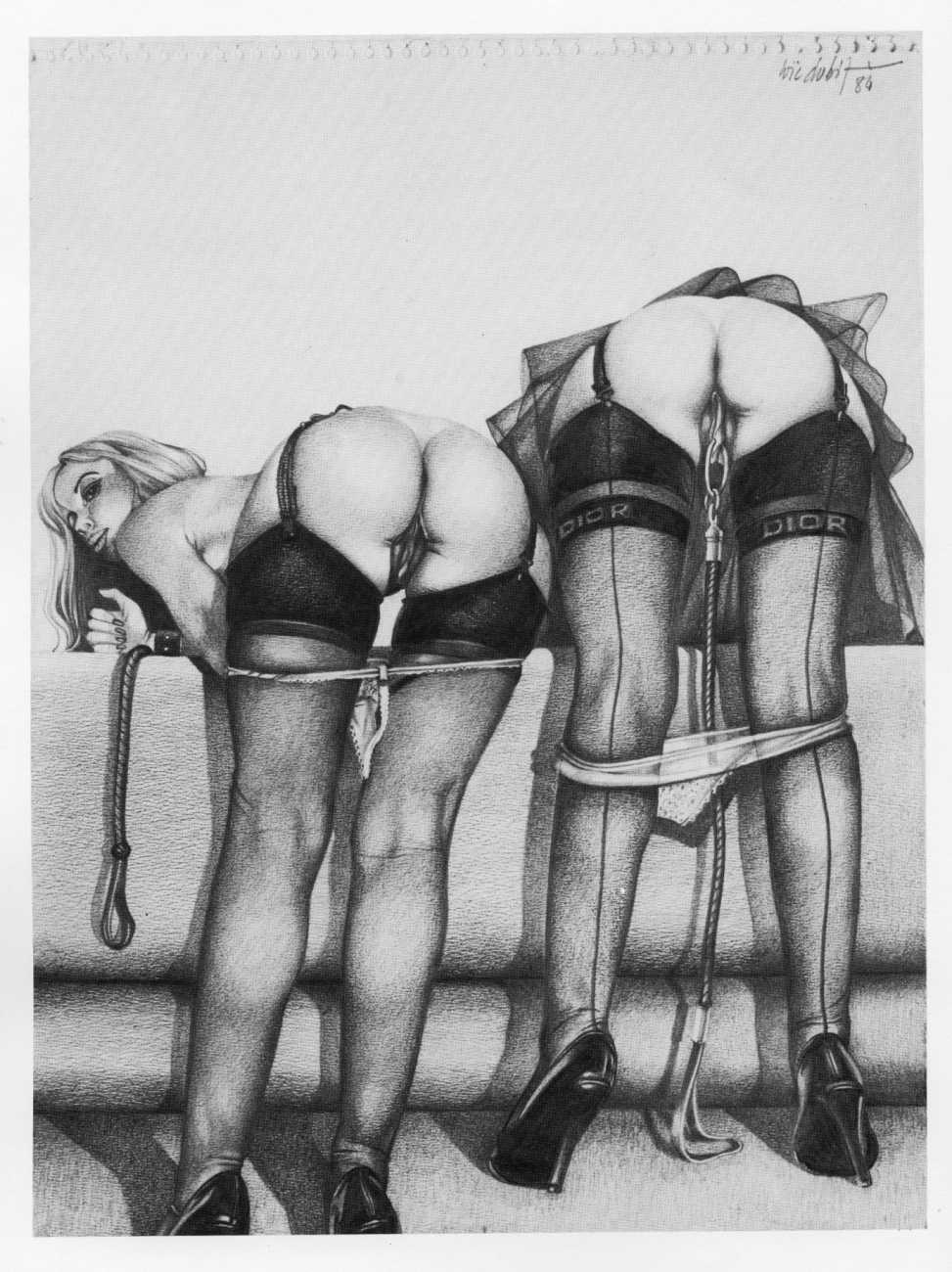 Loïc Dubigeon was first commissioned to create illustrations to accompany Pauline Réage’s Histoire d’O when the illustrated book publisher Editions Borderie saw some of Dubigeon’s nudes at an exhibition in Munich in the summer of 1981. You can see his illustrations to this edition here. He continued to produce drawings based on his response to the story, and by 1990, two years before his death, had produced nearly a hundred new works in several large sketchpads. The Club du Livre Secret published many of these in a volume called Douces violences, an expression which translates literally as ‘sweet violence’, but which in French covers a range of subjects from ‘tough love’ in relation to children’s behaviour to BDSM roleplay.