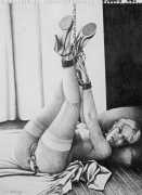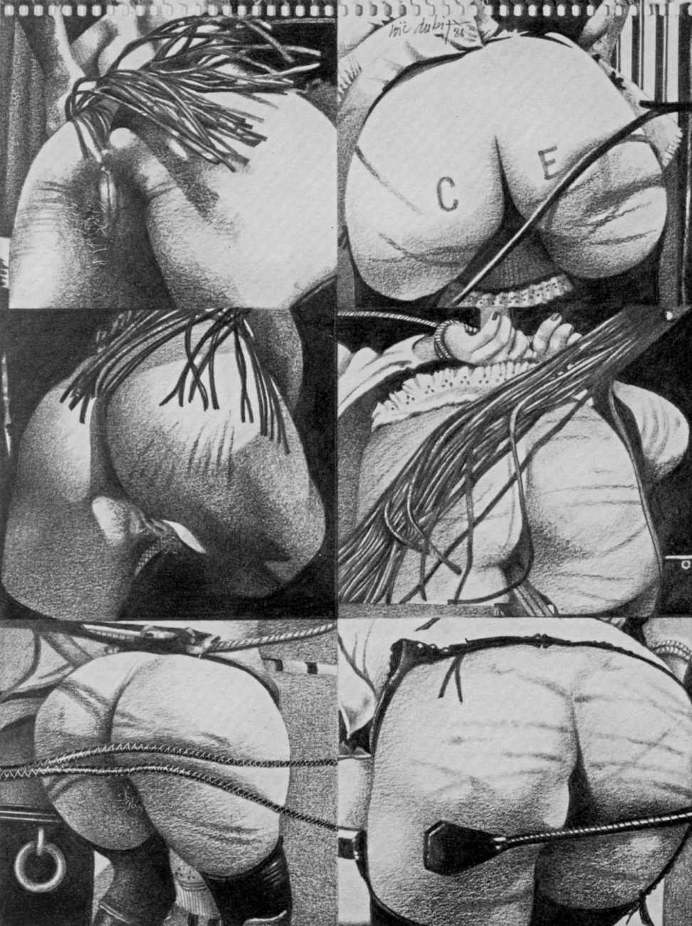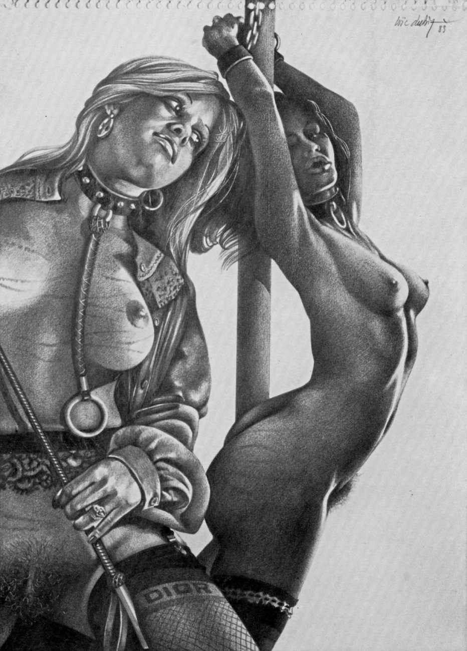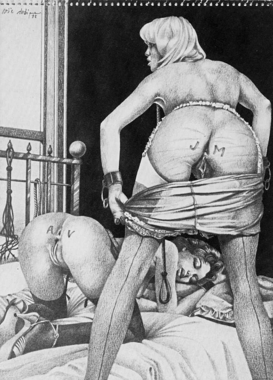 Loïc Dubigeon was first commissioned to create illustrations to accompany Pauline Réage’s Histoire d’O when the illustrated book publisher Editions Borderie saw some of Dubigeon’s nudes at an exhibition in Munich in the summer of 1981. You can see his illustrations to this edition here. He continued to produce drawings based on his response to the story, and by 1990, two years before his death, had produced nearly a hundred new works in several large sketchpads. The Club du Livre Secret published many of these in a volume called Douces violences, an expression which translates literally as ‘sweet violence’, but which in French covers a range of subjects from ‘tough love’ in relation to children’s behaviour to BDSM roleplay.