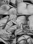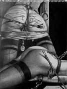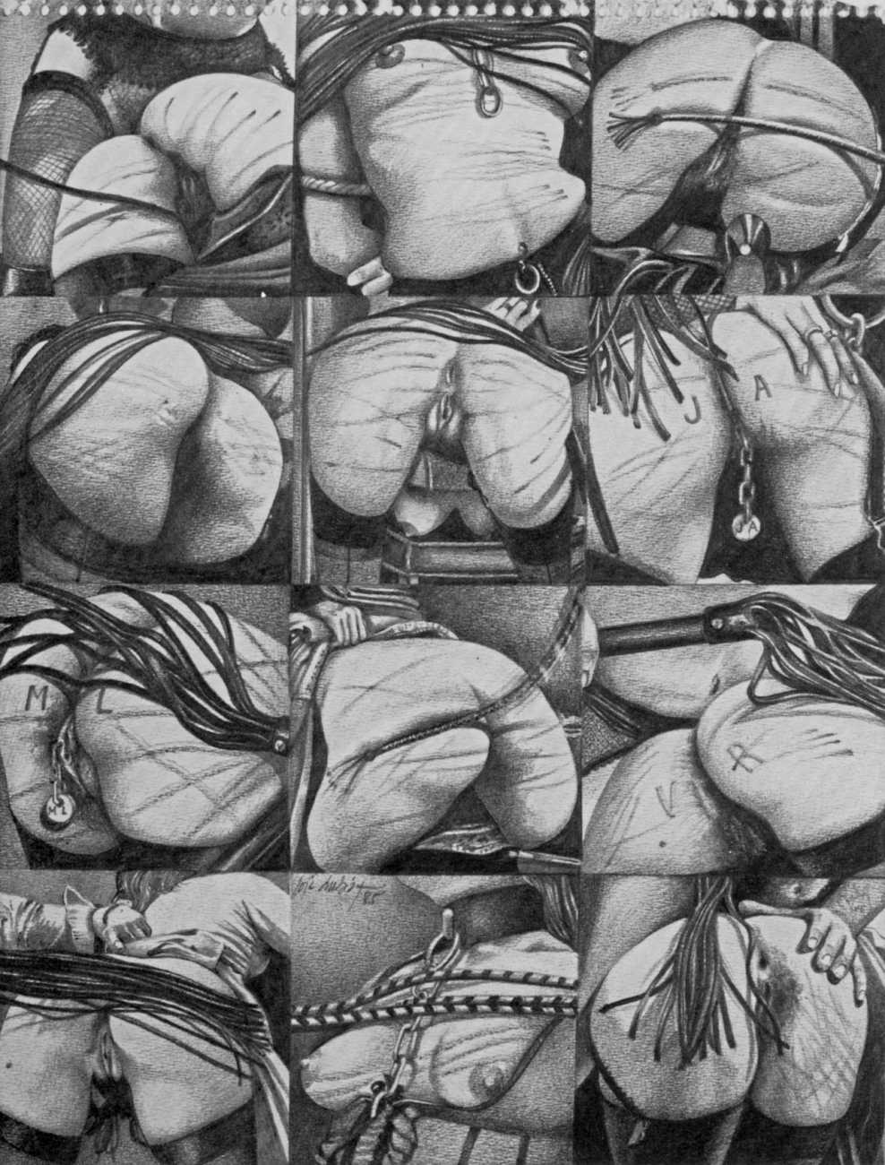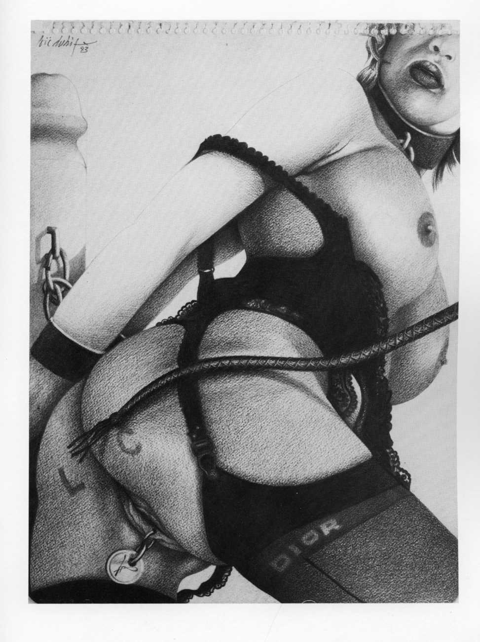 In the preface to the collection, the publishers write: ‘Illustrating a literary work is an exercise which has always been favoured by publishers hoping to win over those readers discouraged by texts consisting solely of words. The Story of O, it goes without saying, is a great book; surely such sumptuous prose could only be demeaned and reduced by attempting to illustrate it. So we must appreciate Loïc Dubigeon’s attempts to provide illustrations to accompany the most celebrated erotic text of our age. He has given free rein to his imagination, and his images should be seen as his personal response to his reading of The Story of O. It would be pointless to search here for specific scenes from the book, though all its significant elements are here: the leather, the whips, the bodies. Here we have a new work of art which leaves Pauline Réage’s book intact, but adds Dubigeon’s fitting artistic response to it.’