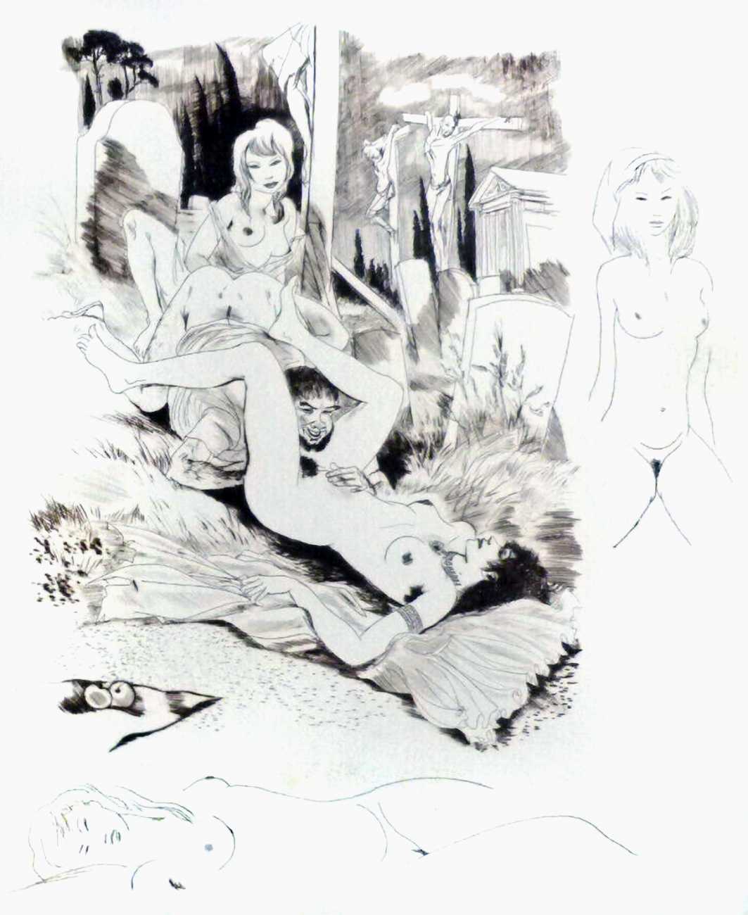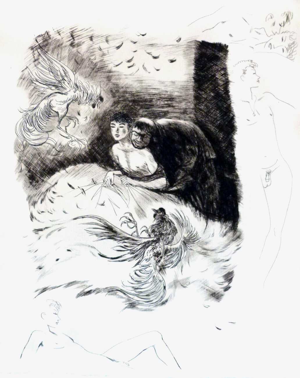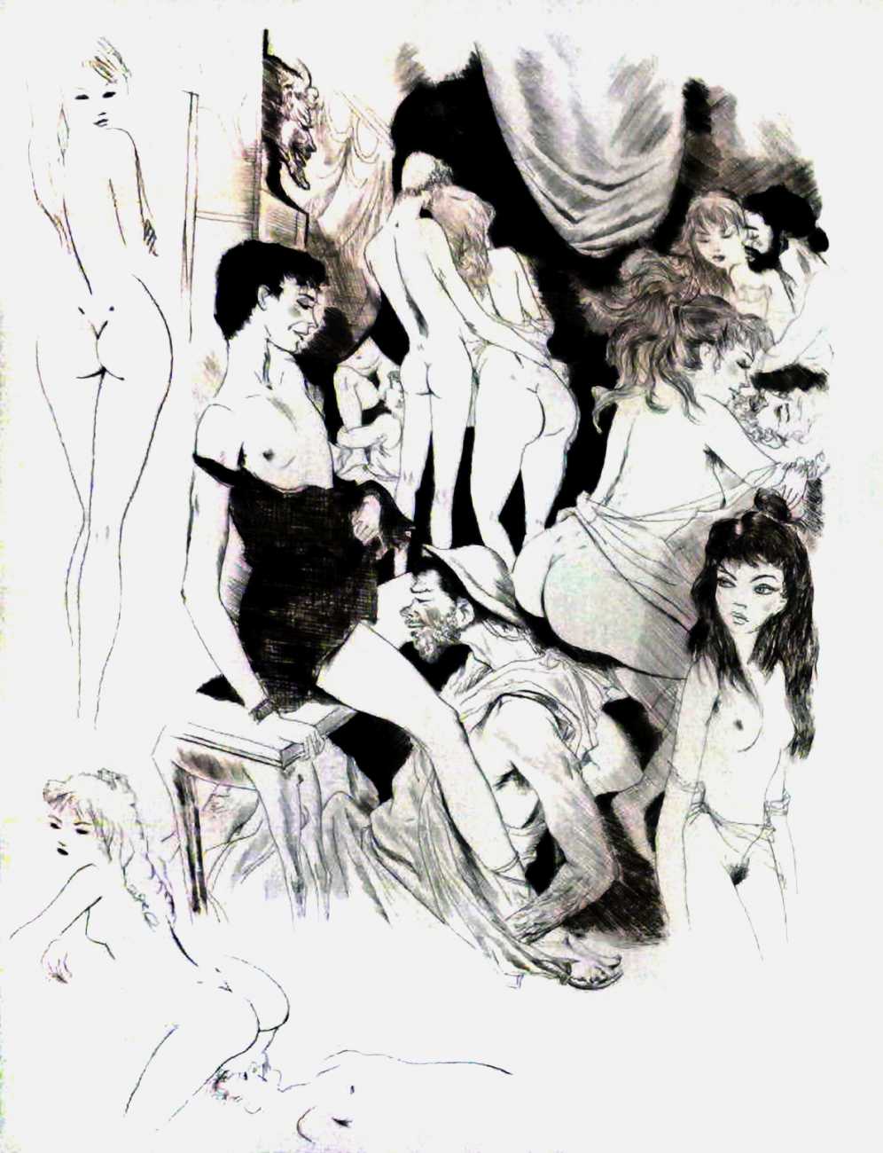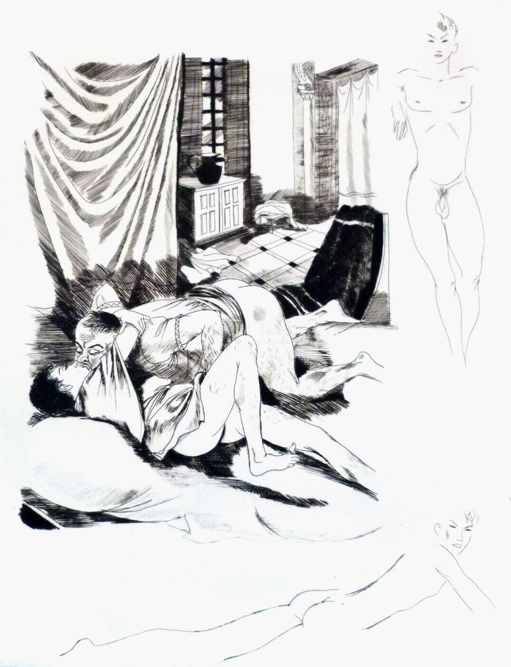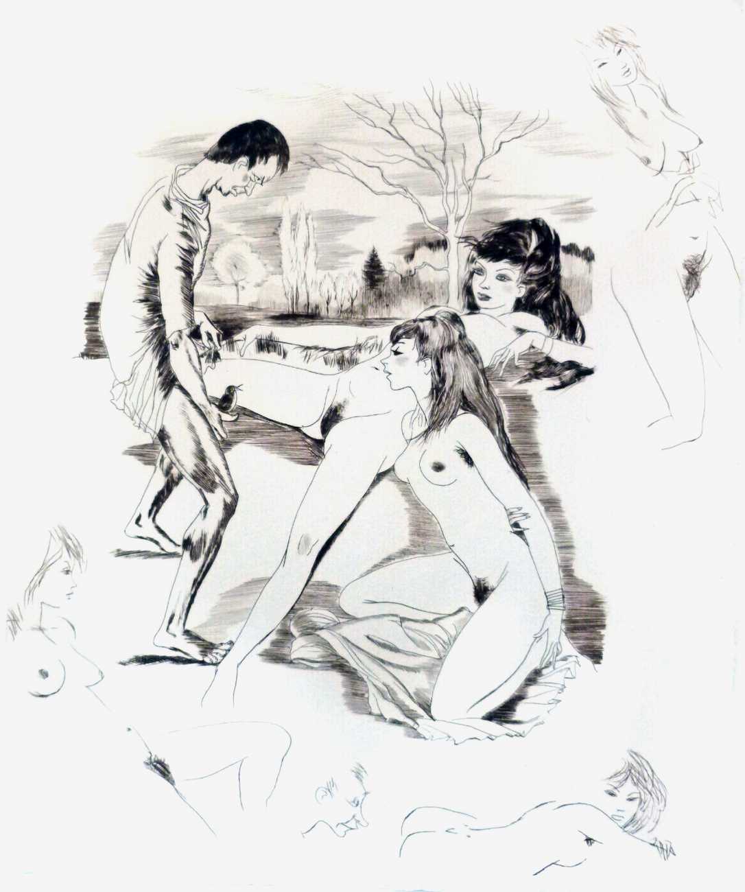 It seems an odd choice for Editions du Baniyan to have commissioned Barret illustrations for, especially since it contains few female characters, but this has not prevented publisher and illustrator from introducing them freely as needed! The edition from which the illustrations shown here are reproduced is from the small number which included ‘remarques’ or additional marginal drawings, here added rather sketchily but all very naked.