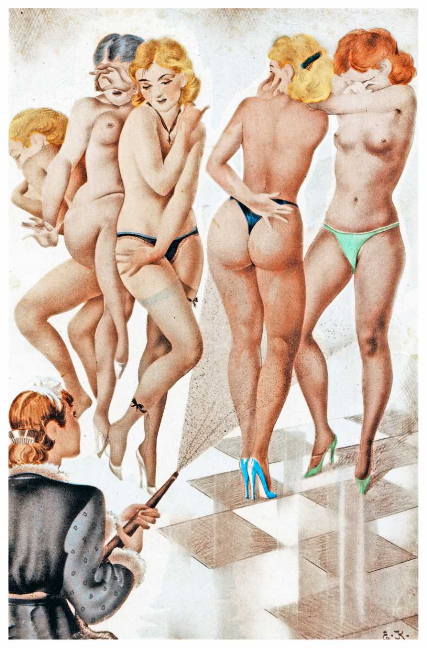 L’amoureuse discipline (The Loving Discipline) is by way of a sequel to L’éducatrice passionnée, also with a text by the ubiquitous ‘Jim Galding’ and illustrations by Klementieff using the ‘E.K.’ signature. Again the book was issued with ten colour illustrations in addition to the cover, of which we have just six of the ‘nombreuses illustrations en couleurs’.