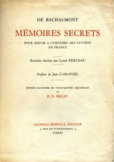 Mémoires secrets pour servir à l’histoire de la République des Lettres en France depuis 1762 jusqu’à nos jours (Secret Memoirs Serving as a History of the Republic of Letters in France from 1762 until the Present Day) is an anonymous chronicle of events that occurred between 1762 and 1787. The historian Dena Goodman thinks it started as a manuscript newsletter emanating from Paris. It was first published in London as a multi-volume set from 1783 to 1789; thus although the entries bear exact dates, they were not published until long after the events they describe. The work is attributed to Louis Petit de Bachaumont (1690–1771), but it is unlikely that he was the actual author, since many events included in the text occured after his death. It is now attributed mostly to Mathieu-François Pidansat de Mairobert and Mouffle d’Angerville, but it is likely that the text is the work of multiple authors including these two.