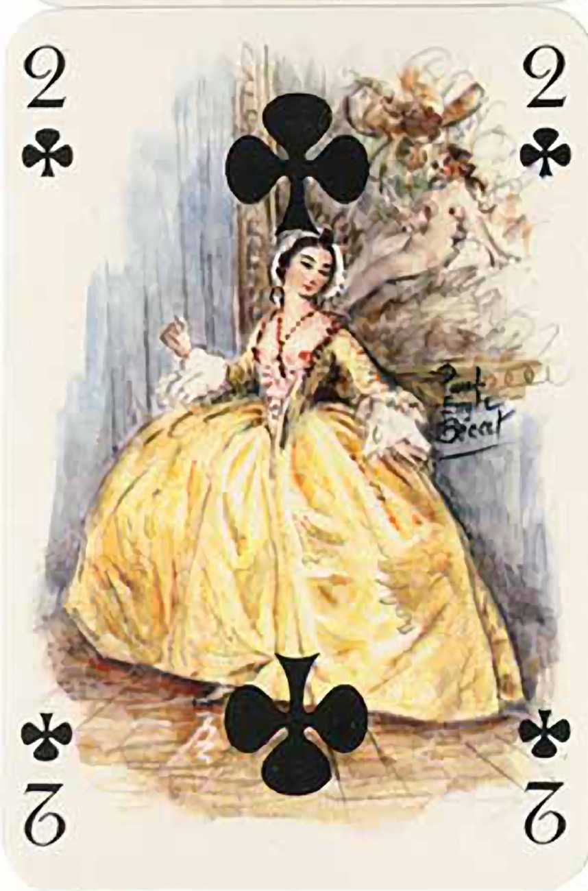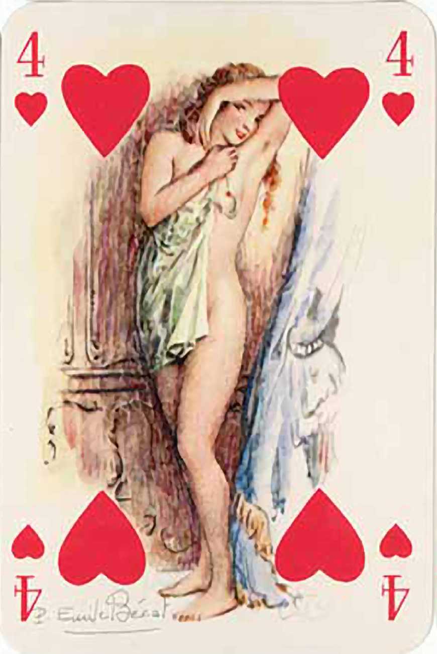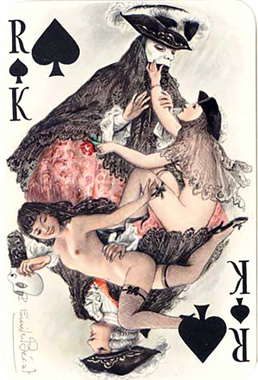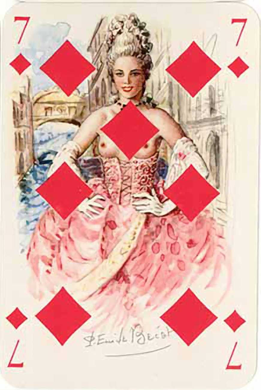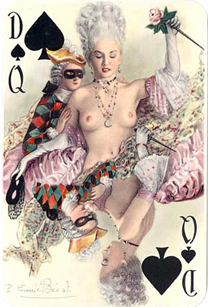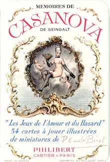 Following the success of the Florentin pack in 1954, the Paris-based playing card manufacturer Éditions Philibert commissioned Bécat to produce another set of illustrations for a de luxe Mémoires de Casanova pack. Many of the illustrations for the Casanova pack came from material he had amassed over a lifetime of creativity, and it was published shortly after his death. The Casanova cards were produced to a high standard, with gilded edges.