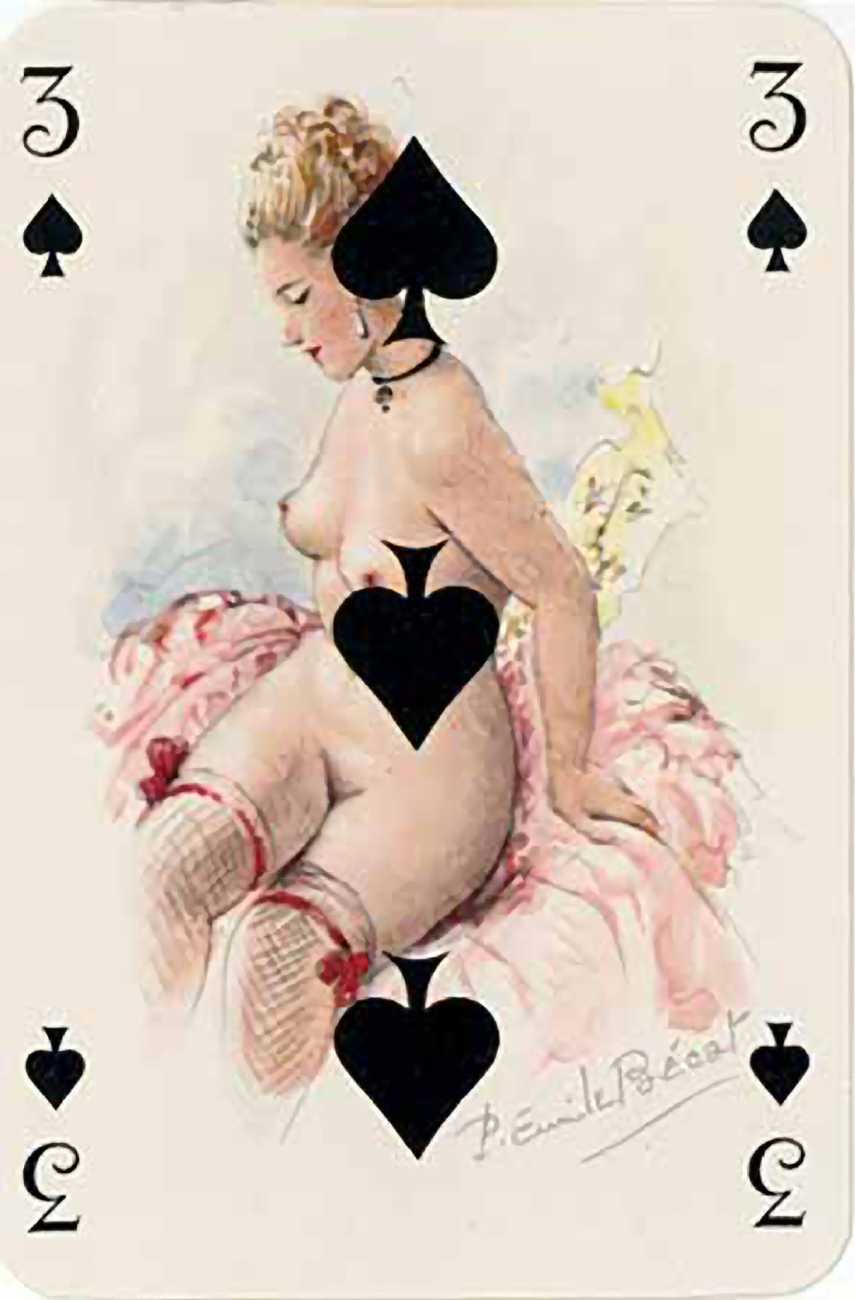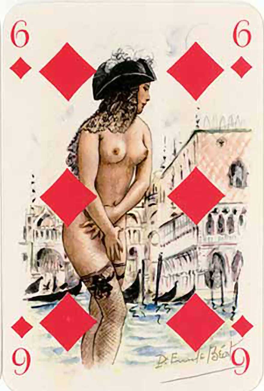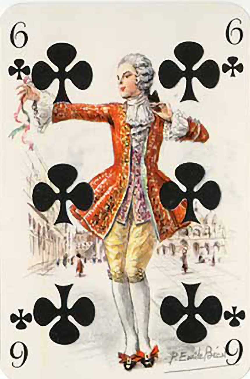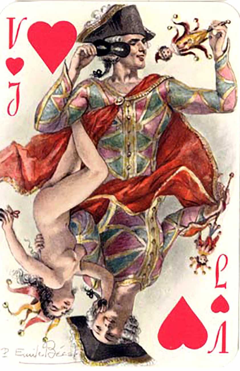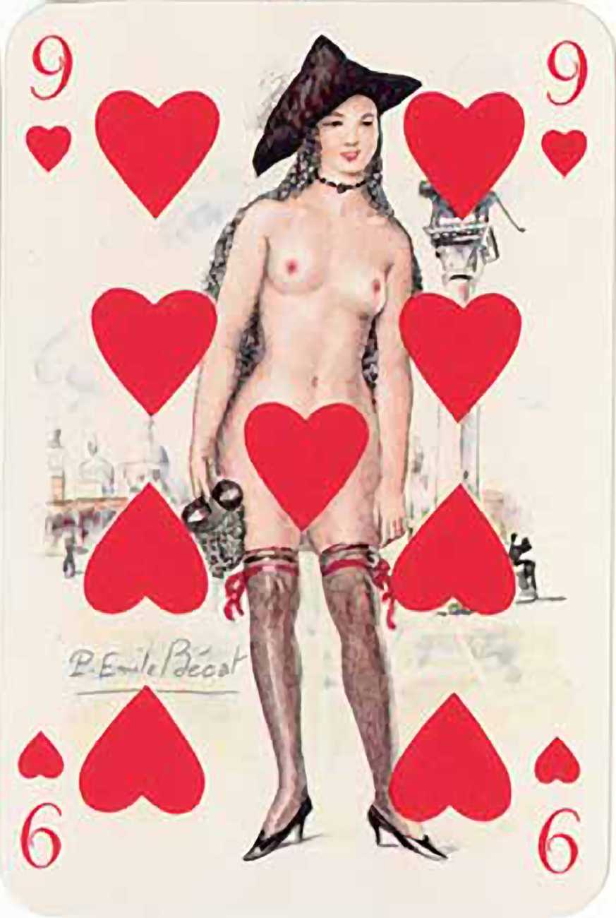Following the success of the Florentin pack in 1954, the Paris-based playing card manufacturer Éditions Philibert commissioned Bécat to produce another set of illustrations for a de luxe Mémoires de Casanova pack. Many of the illustrations for the Casanova pack came from material he had amassed over a lifetime of creativity, and it was published shortly after his death. The Casanova cards were produced to a high standard, with gilded edges.