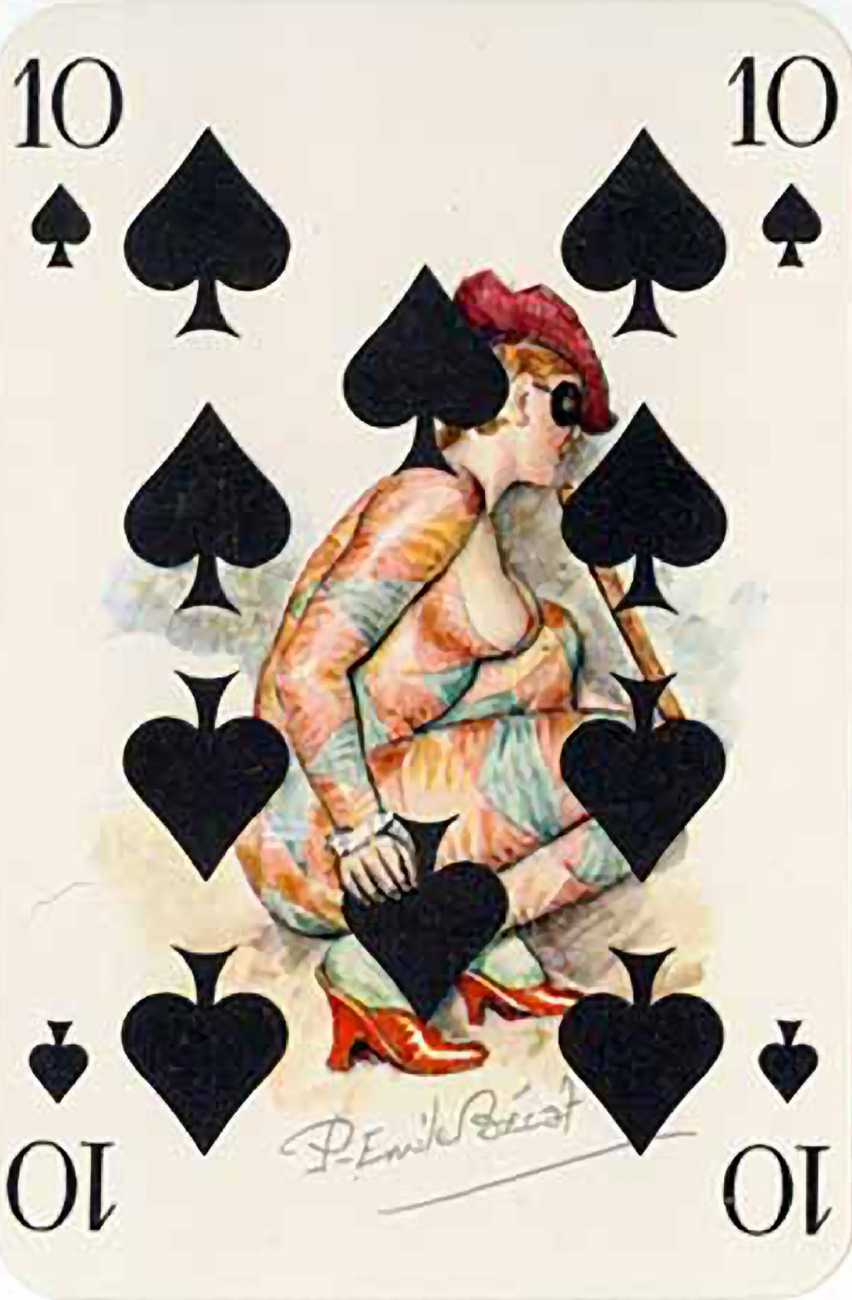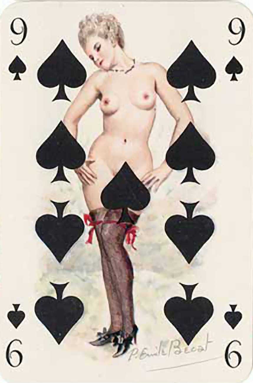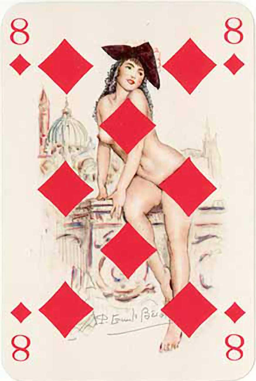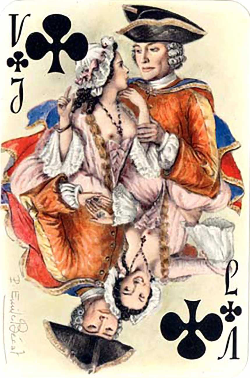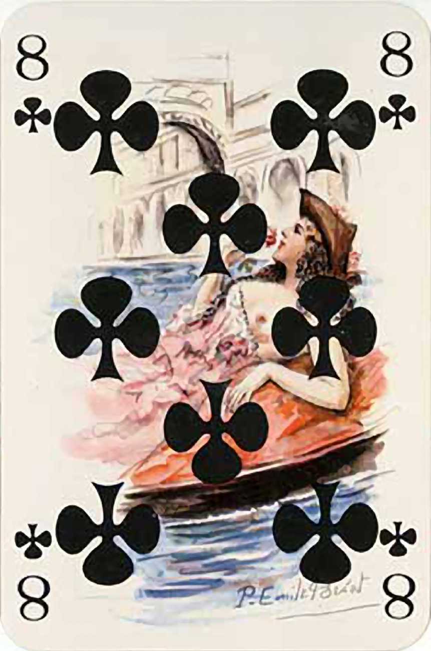 Following the success of the Florentin pack in 1954, the Paris-based playing card manufacturer Éditions Philibert commissioned Bécat to produce another set of illustrations for a de luxe Mémoires de Casanova pack. Many of the illustrations for the Casanova pack came from material he had amassed over a lifetime of creativity, and it was published shortly after his death. The Casanova cards were produced to a high standard, with gilded edges.