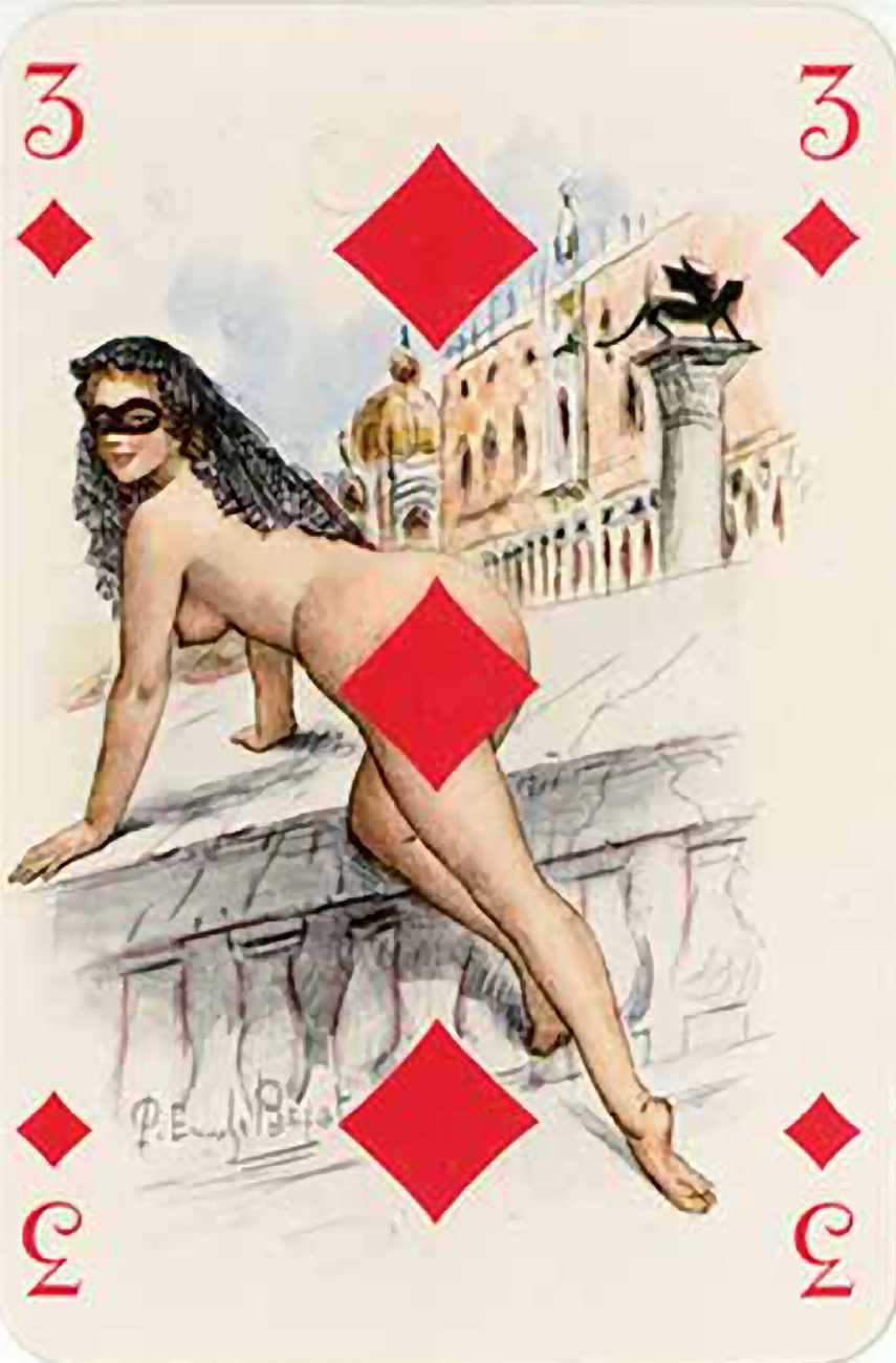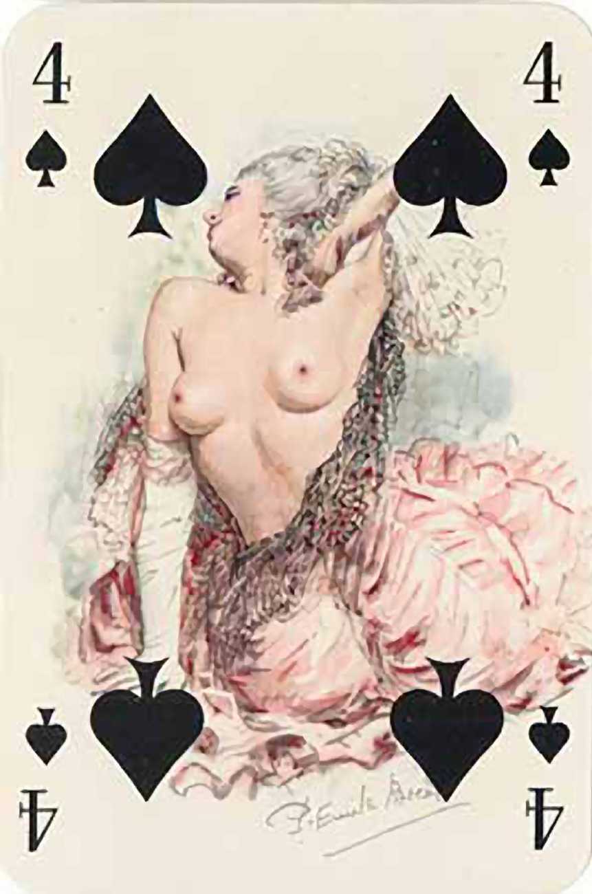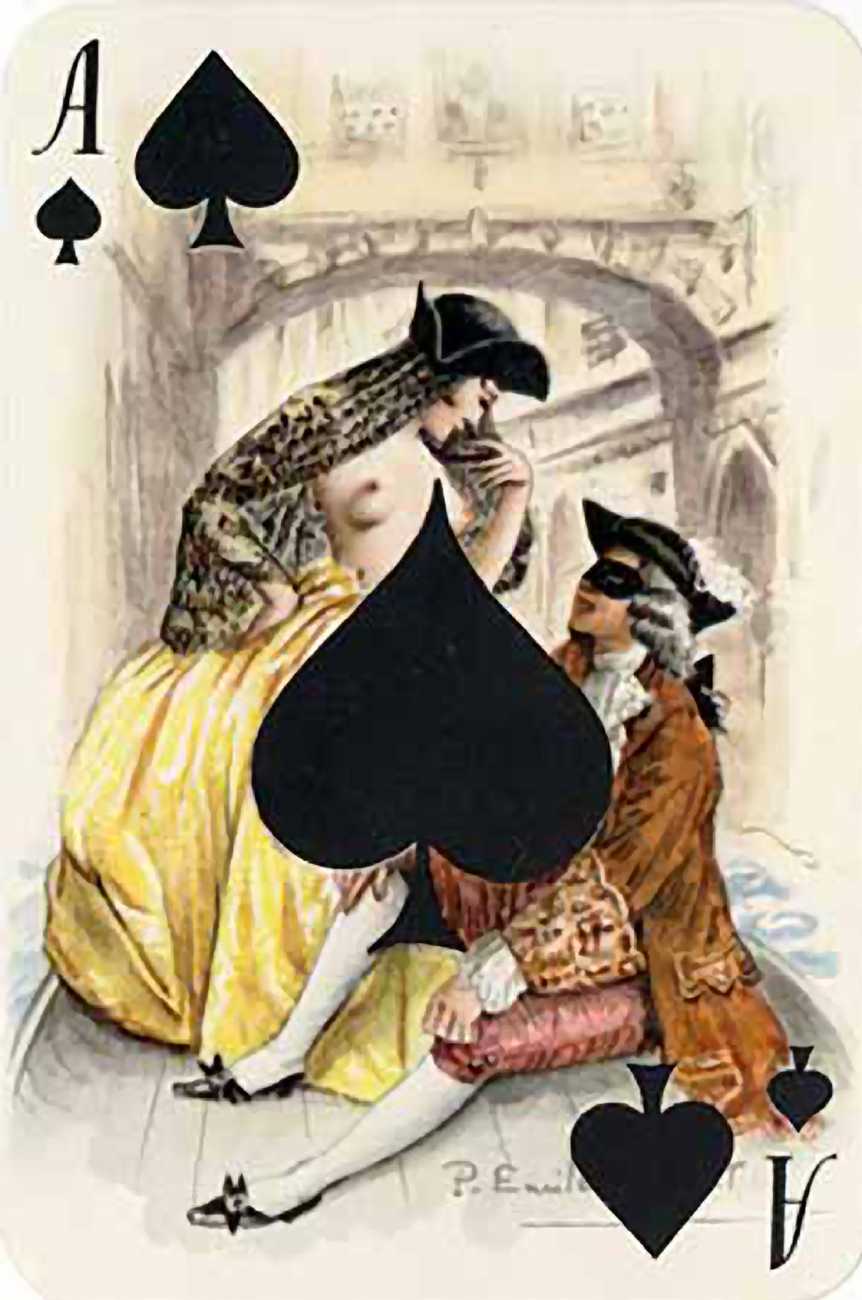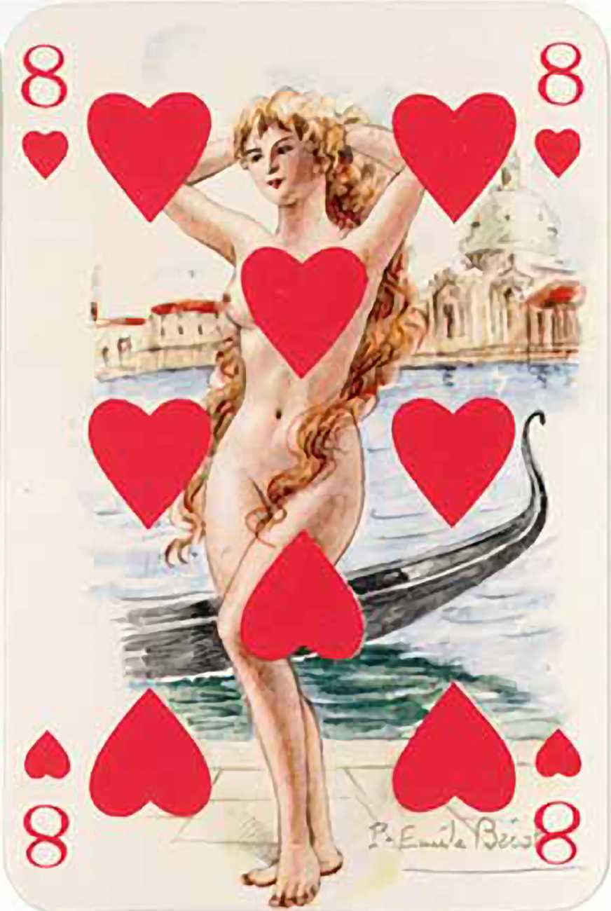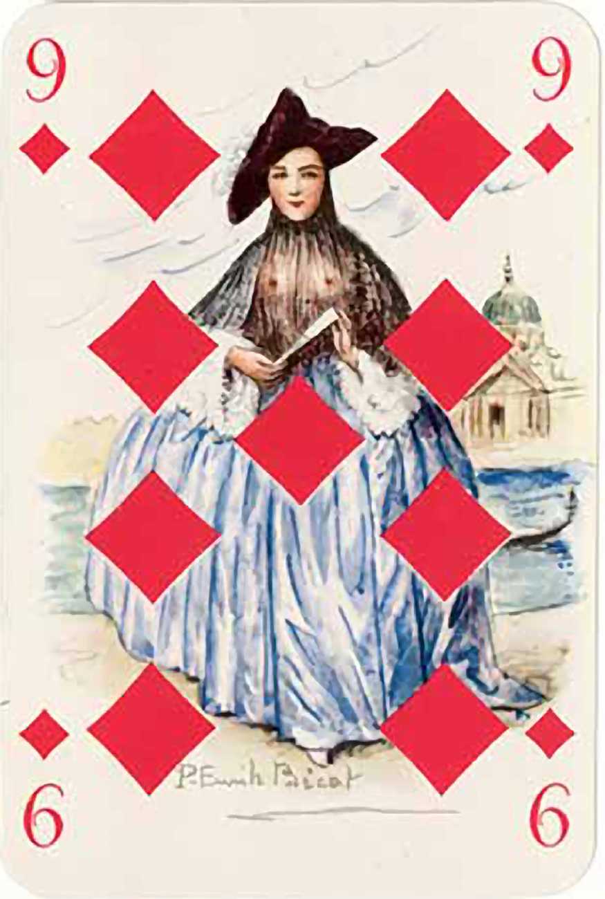 Following the success of the Florentin pack in 1954, the Paris-based playing card manufacturer Éditions Philibert commissioned Bécat to produce another set of illustrations for a de luxe Mémoires de Casanova pack. Many of the illustrations for the Casanova pack came from material he had amassed over a lifetime of creativity, and it was published shortly after his death. The Casanova cards were produced to a high standard, with gilded edges.