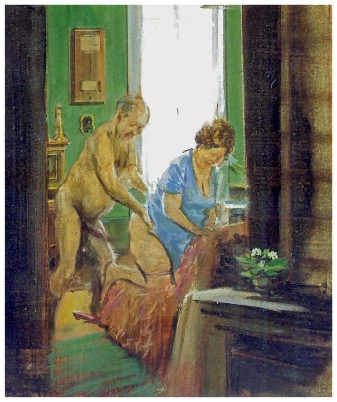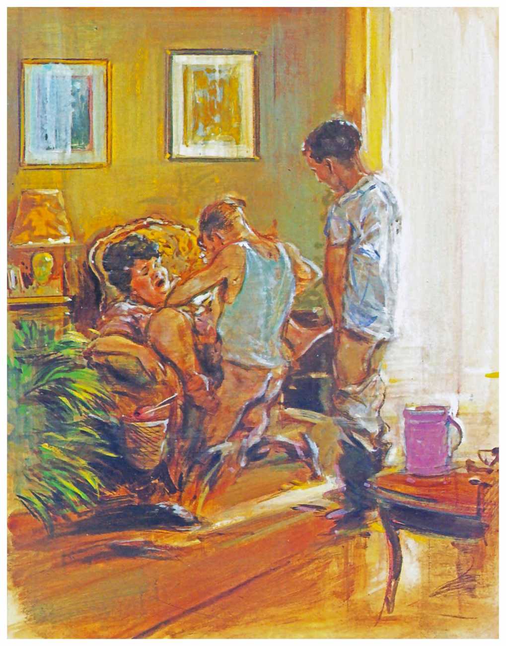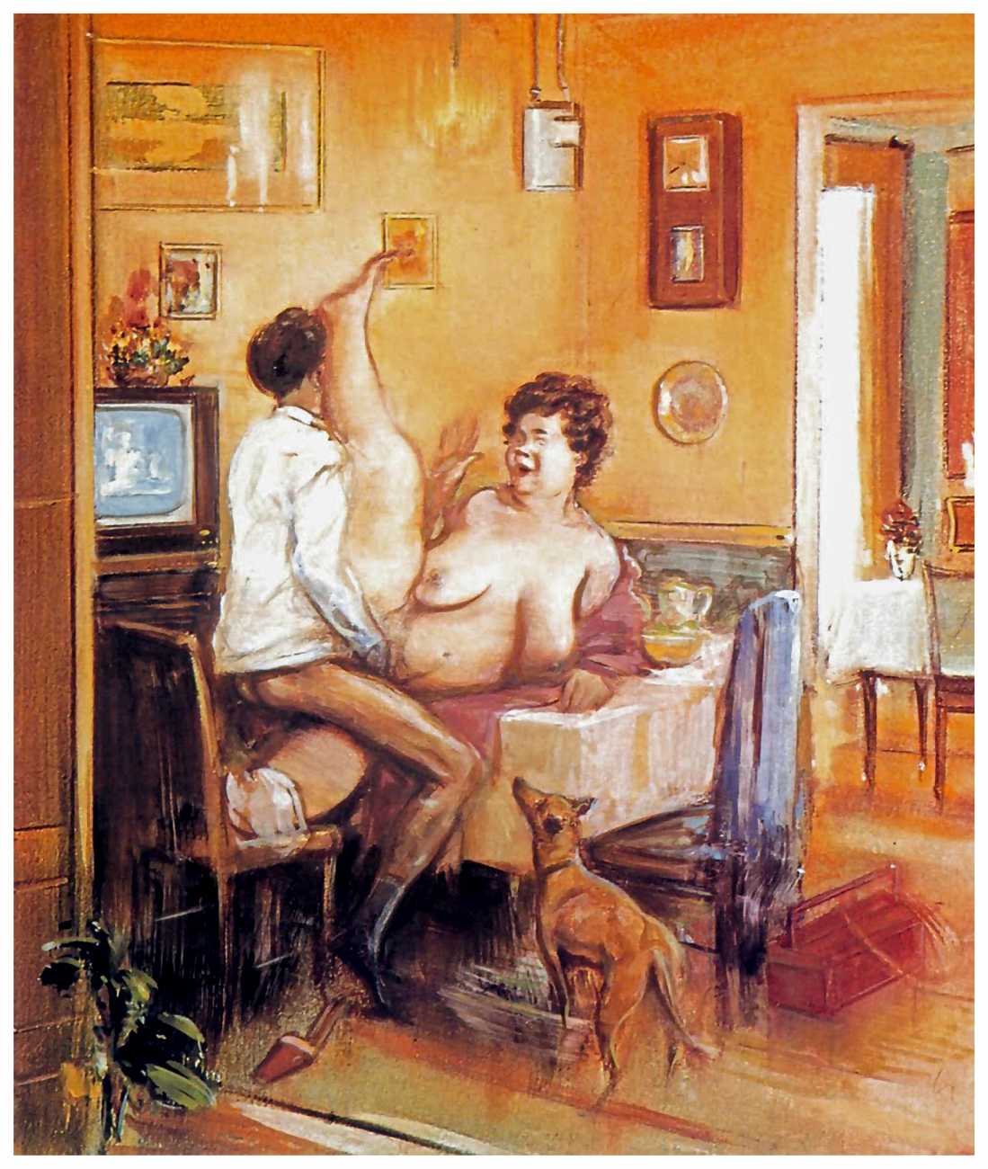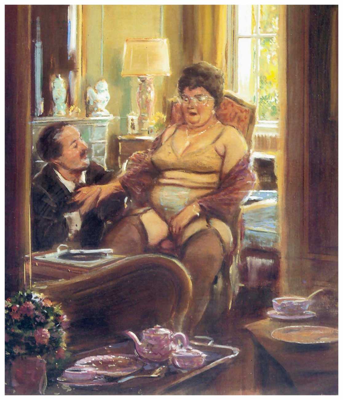 L’invitation (The Invitation) is a very special volume, because it is the only attempt we know of to depict sexual intimacy between older people with skill, sensitivity – and loving humour. Whoever ‘Georges Delfau’ is or was, these delightful paintings prove that the need for closeness, touch – and sexual experimentation – don’t stop when our bodies lose the conventional, and usually unachievable, contours of youth.