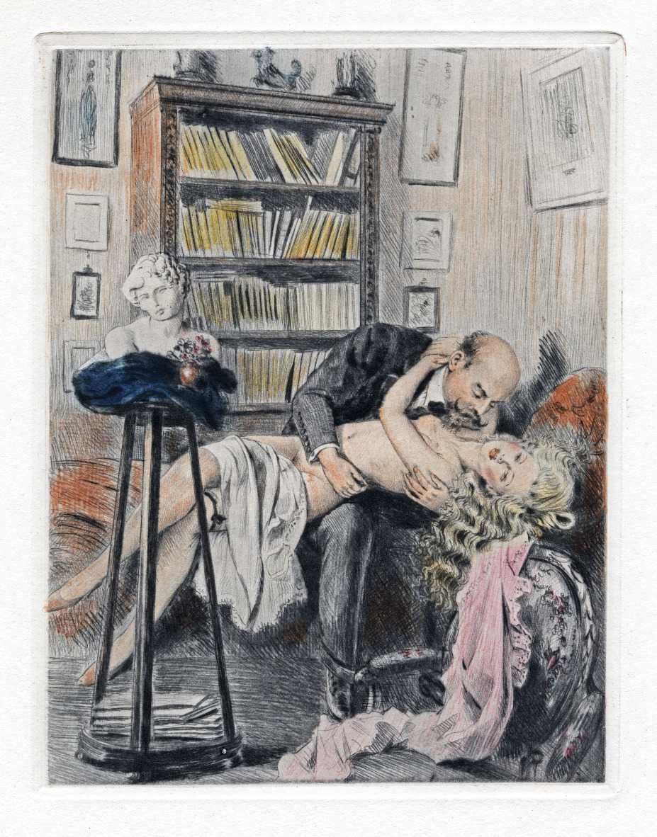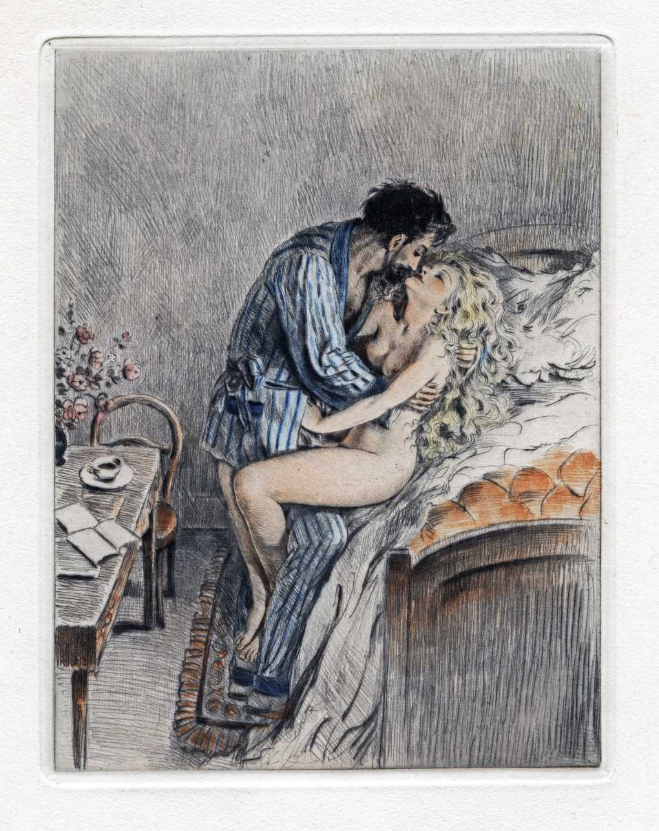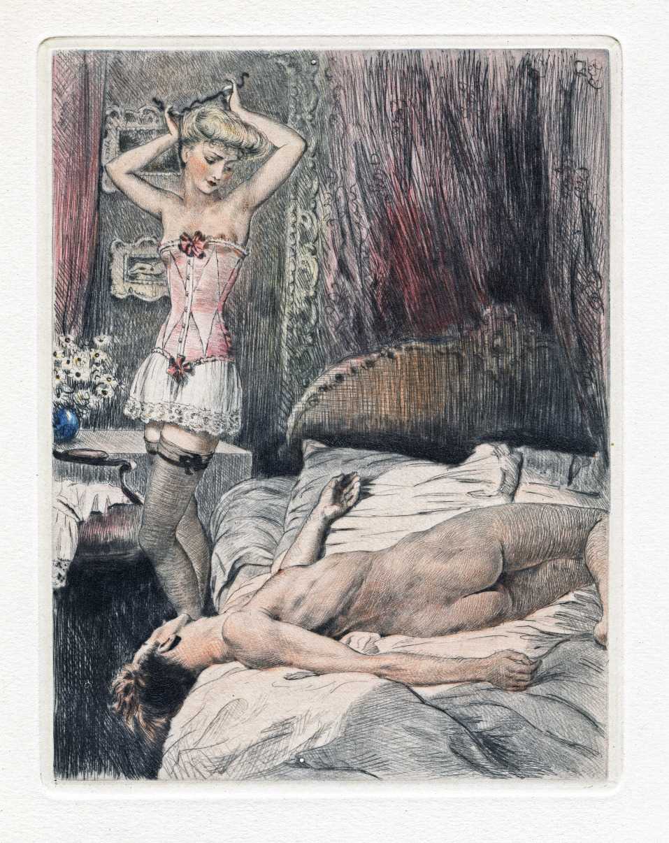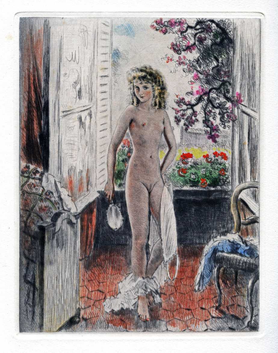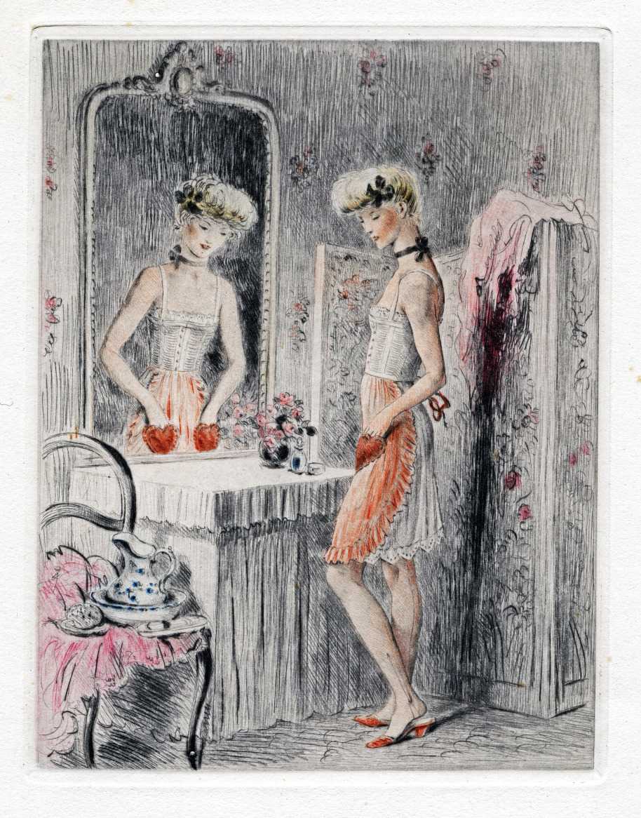 The Bécat-illustrated L’ingénue libertine was published, as many of his were, by Georges Guillot; Paul-Émile’s twenty drypoint plates are supported by drop capitals and cul-de-lampes designed by Marie Monnier-Bécat. The plates demonstrate how Bécat could illustrate a twentieth-century classic just as convincingly as earlier works, and his Minne is absolutely believable.