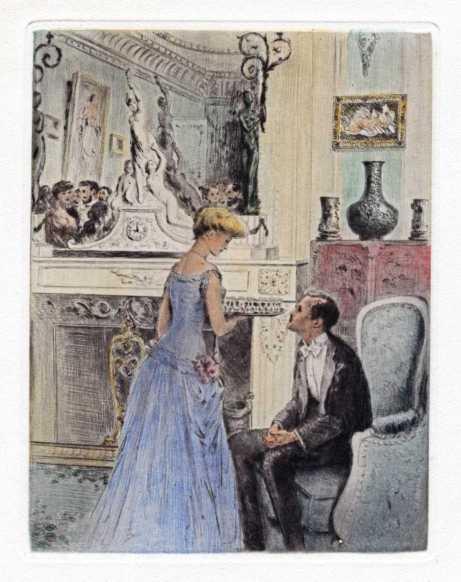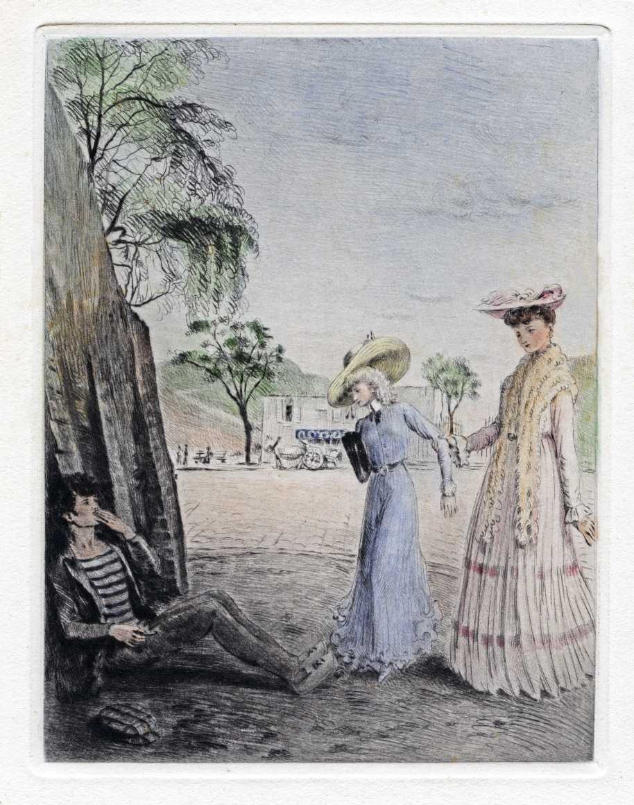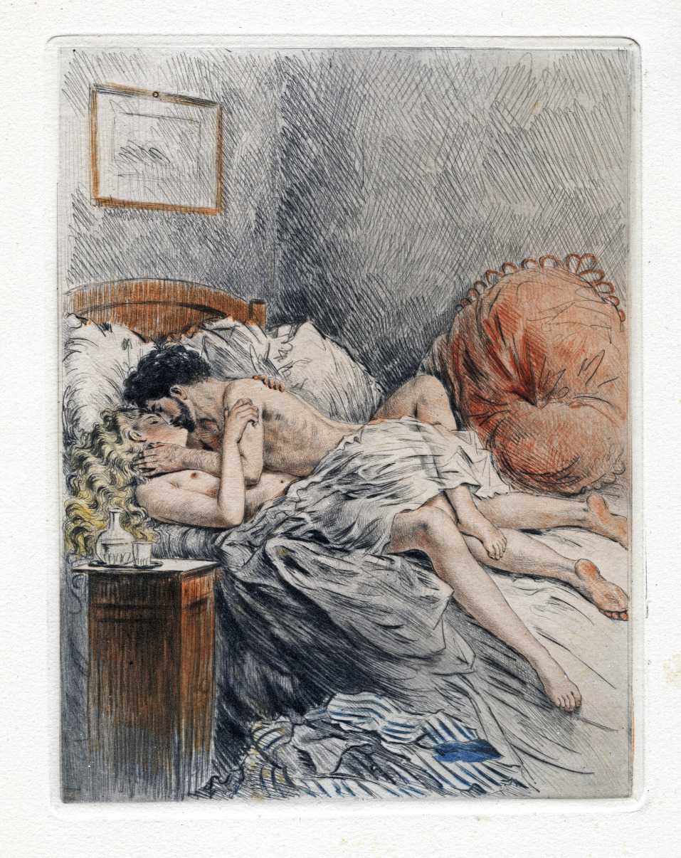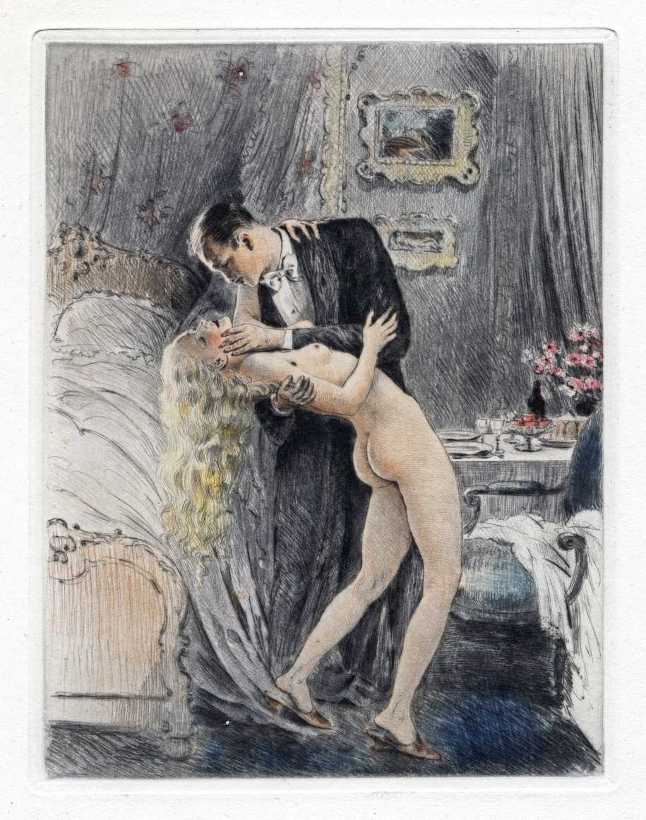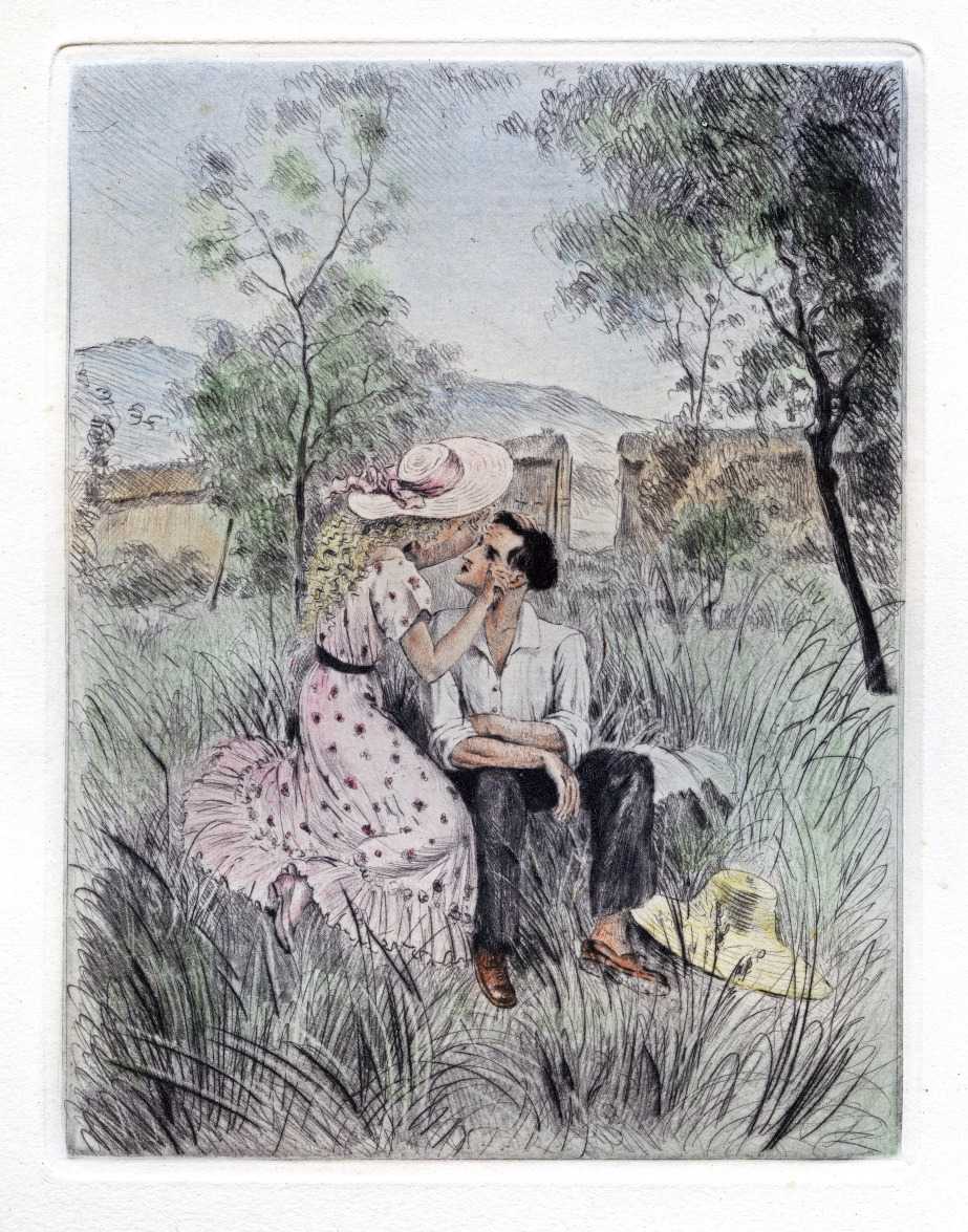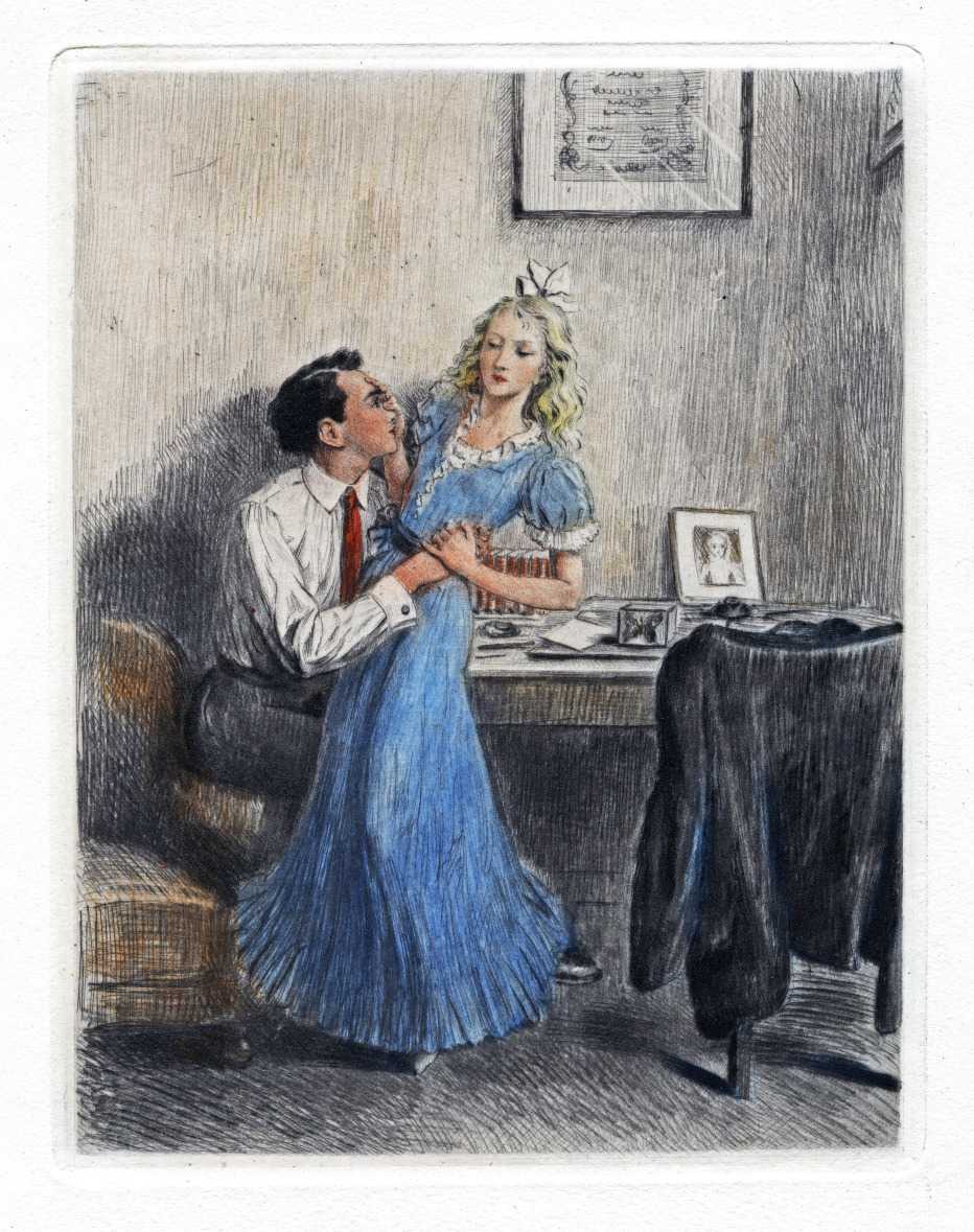 The Bécat-illustrated L’ingénue libertine was published, as many of his were, by Georges Guillot; Paul-Émile’s twenty drypoint plates are supported by drop capitals and cul-de-lampes designed by Marie Monnier-Bécat. The plates demonstrate how Bécat could illustrate a twentieth-century classic just as convincingly as earlier works, and his Minne is absolutely believable.