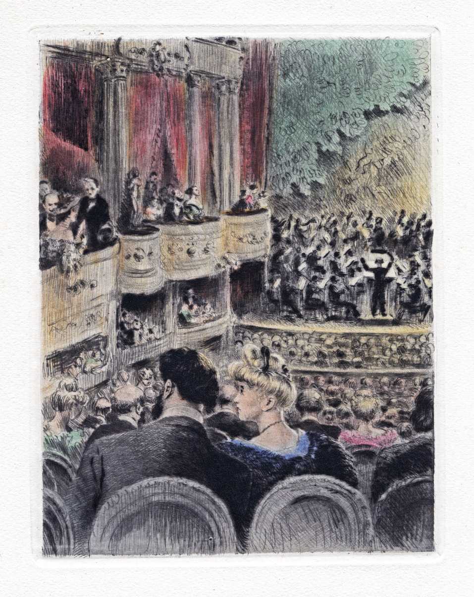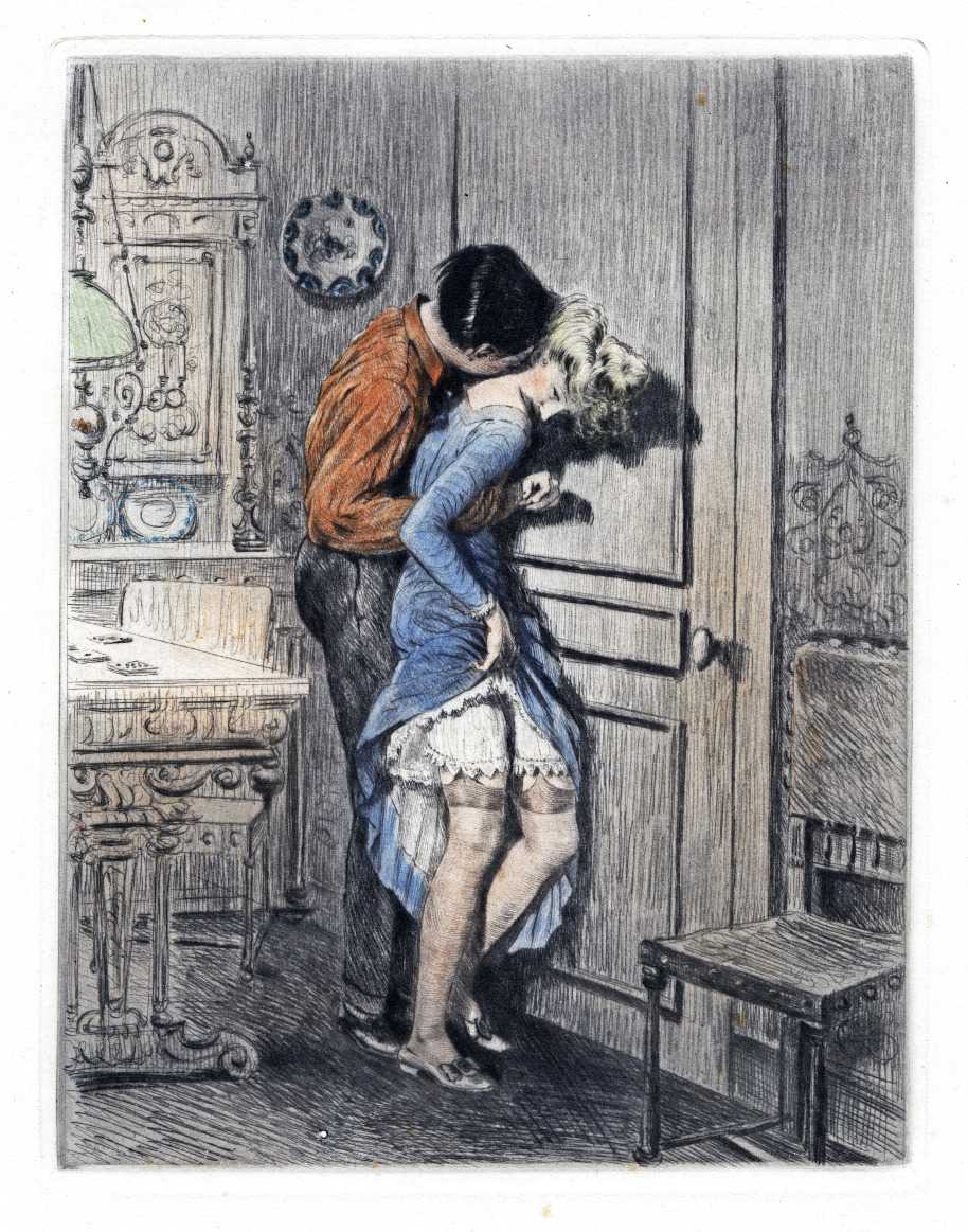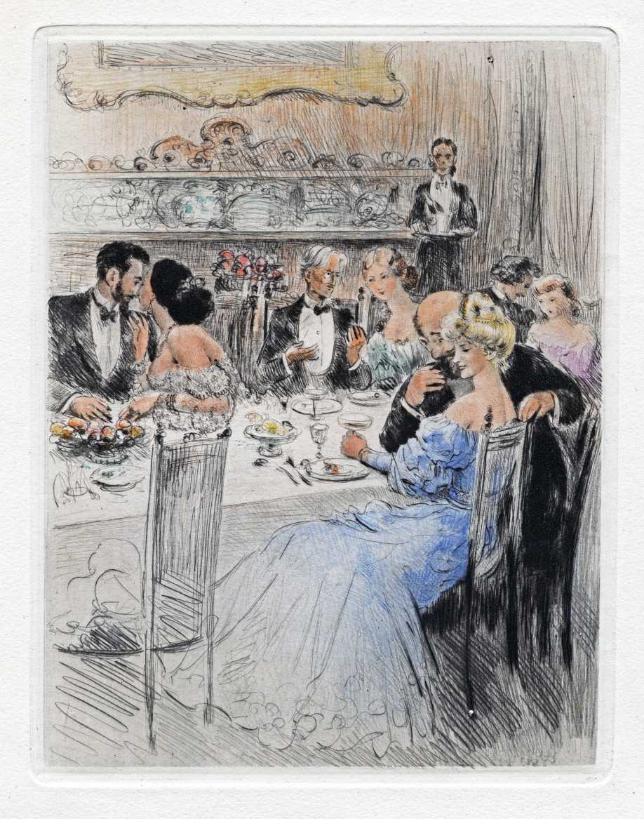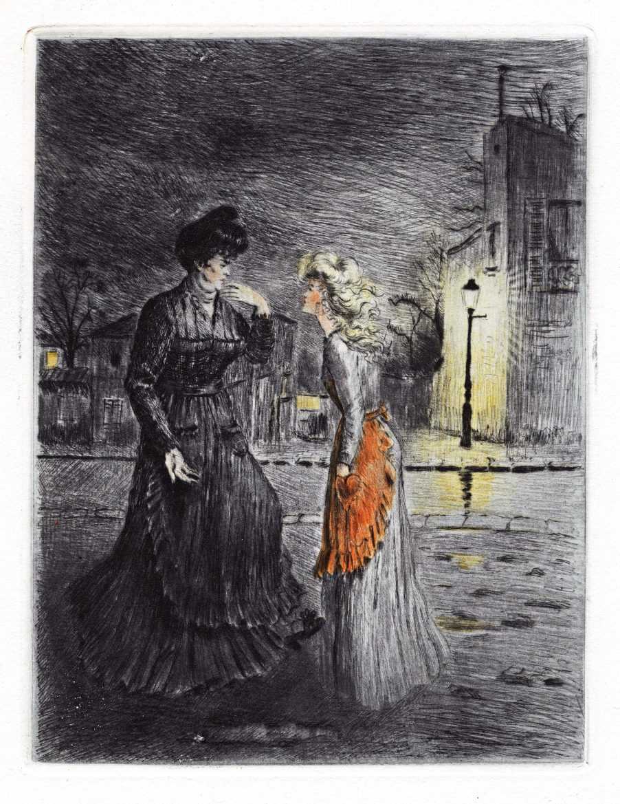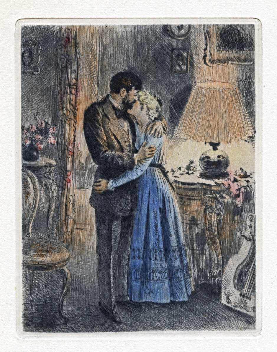 The Bécat-illustrated L’ingénue libertine was published, as many of his were, by Georges Guillot; Paul-Émile’s twenty drypoint plates are supported by drop capitals and cul-de-lampes designed by Marie Monnier-Bécat. The plates demonstrate how Bécat could illustrate a twentieth-century classic just as convincingly as earlier works, and his Minne is absolutely believable.